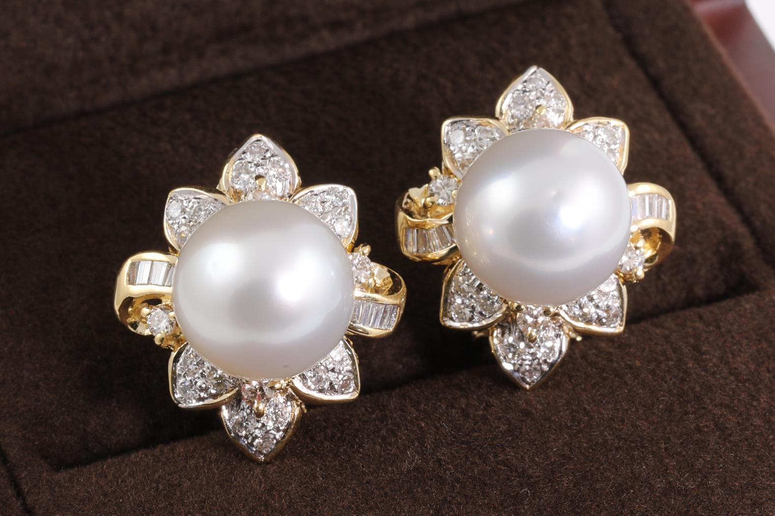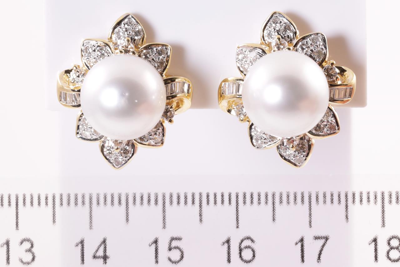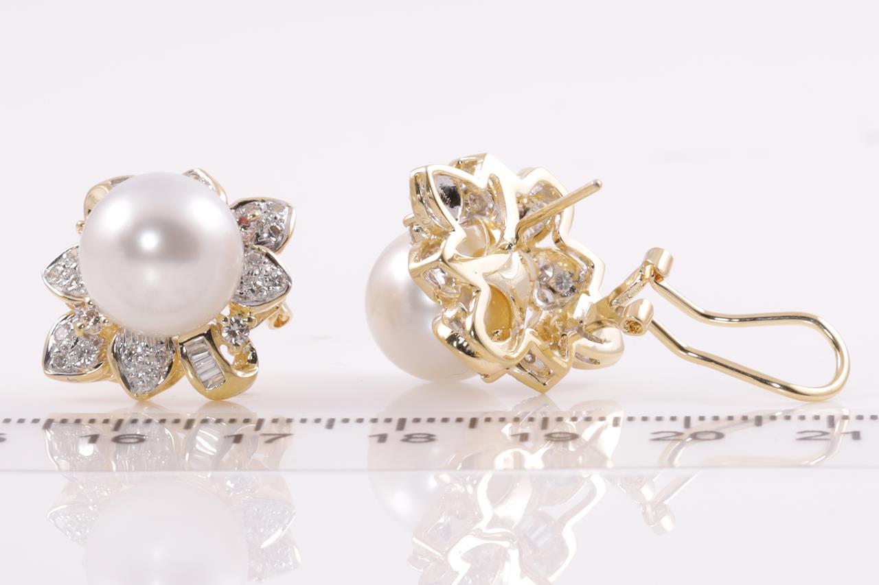 Pearl and Diamond clip-on Earrings (for pierced ears) with South Sea Pearls of 11.7mm with round and baguette Diamonds totalling approximately 1.00cts (Estimated grading G-H VS-SI). 18ct yellow gold. Weight 14.4g. (Pre-owned)