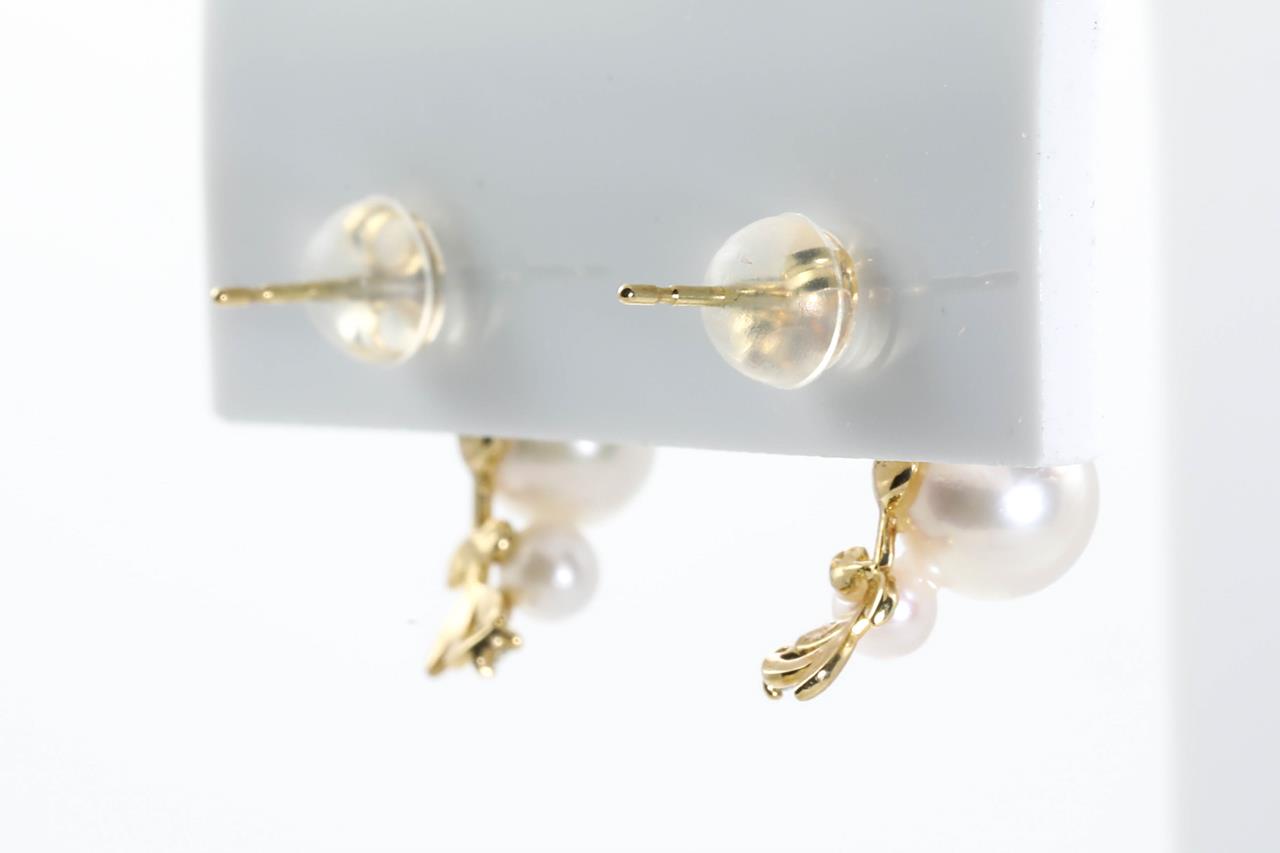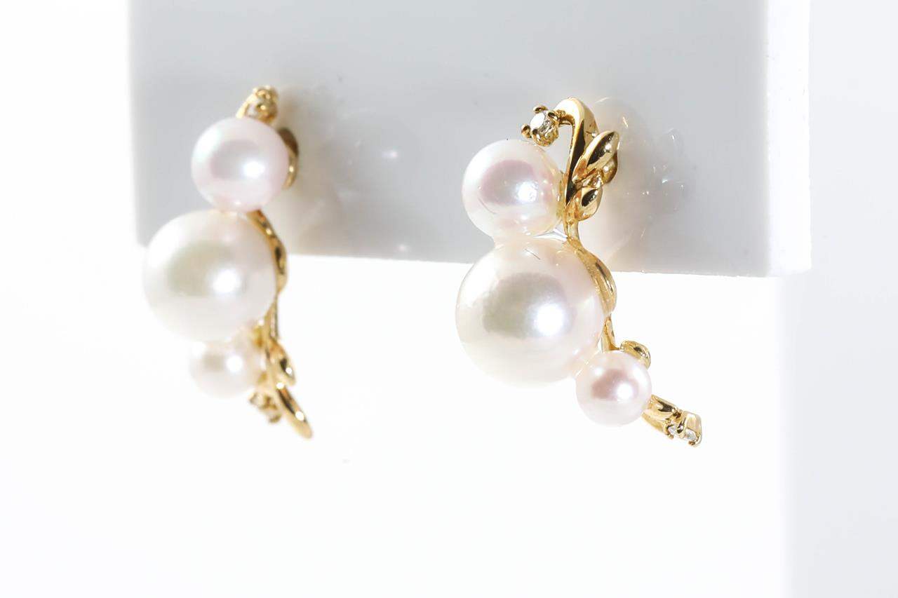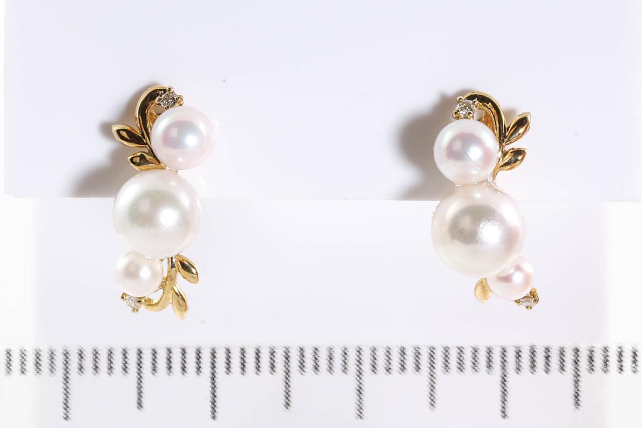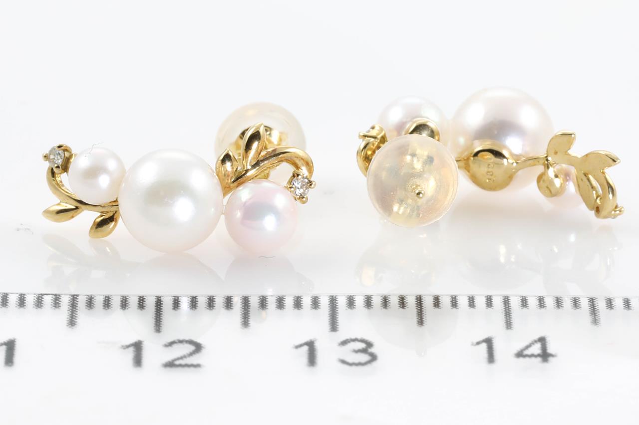 Pearl and Diamond earrings with cultured pearls of 3.3mm - 6.4mm and Diamonds totalling 0.04cts. 18ct yellow gold with gold & silicon backs. Weight: 2.2g. (As new)