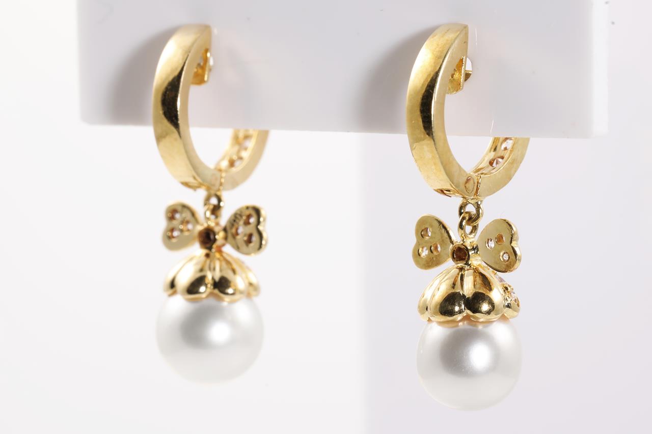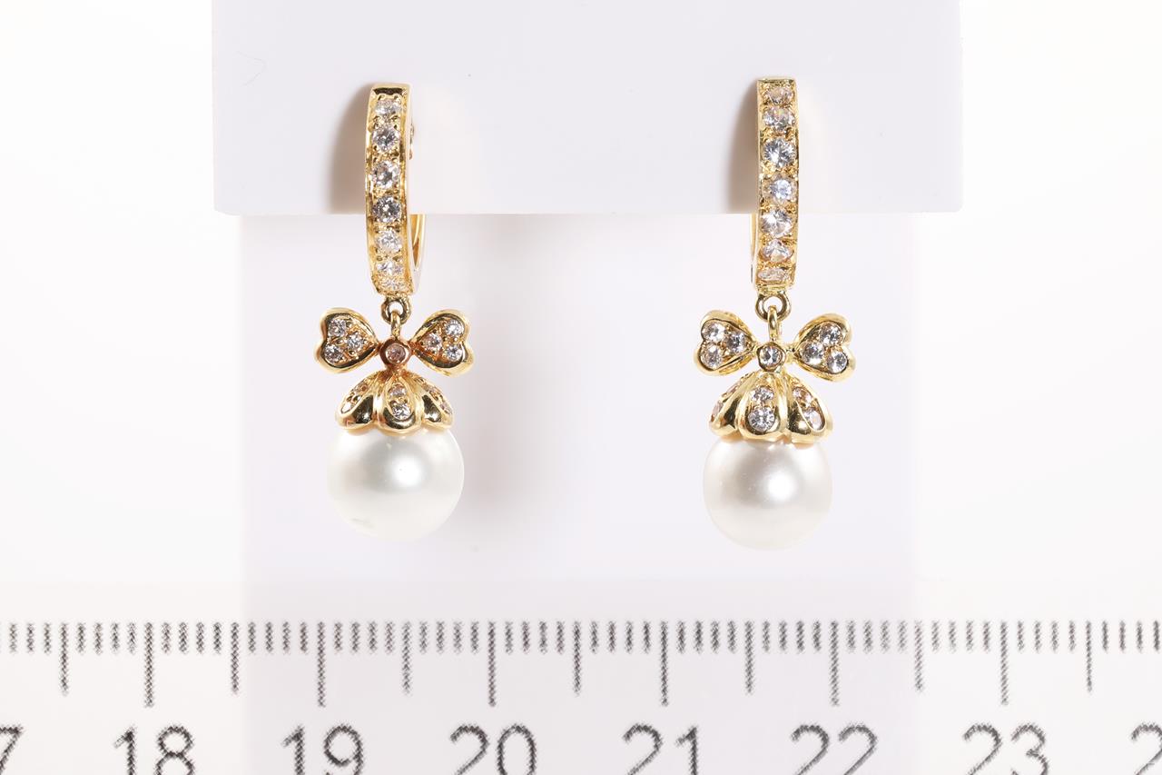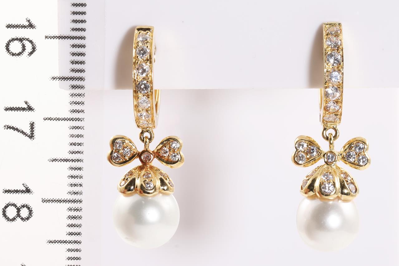 Pearl and Diamond Earrings with cultured Pearls of 7.5mm-8.2mm and Diamond totalling approximately 0.33cts (Estimated grading: H SI). 18ct yellow gold. Weight: 6.6g (Pre-owned)