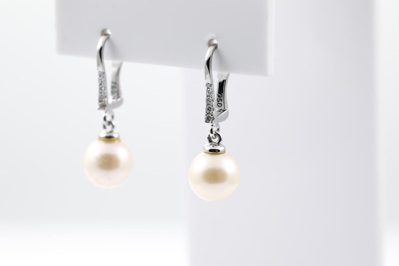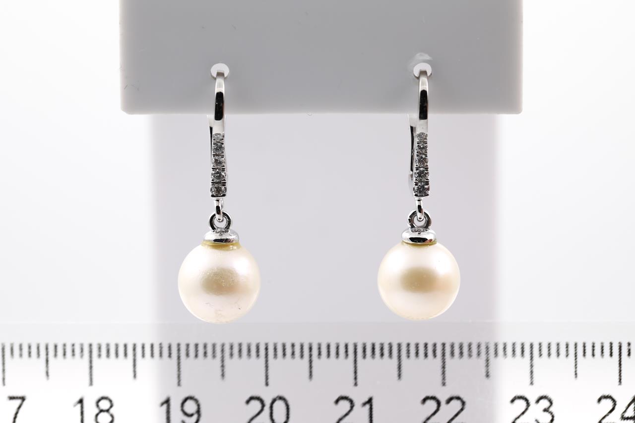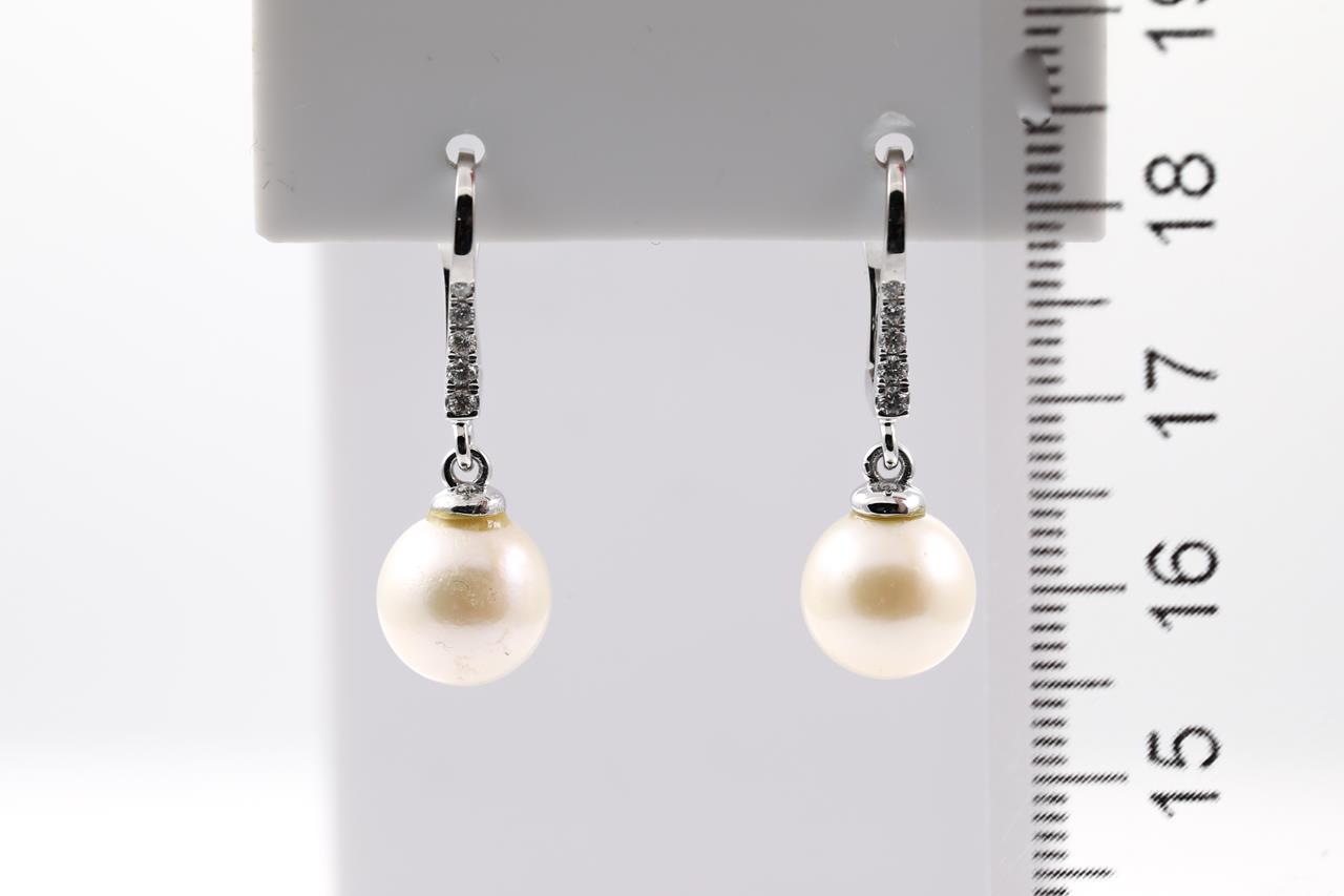 Pearl and Diamond Leverback Earrings with round cultured Pearls of 9.2mm and round Diamonds totalling approximately 0.10cts. 18ct white gold. Weight 4.4g. (Pre-owned)