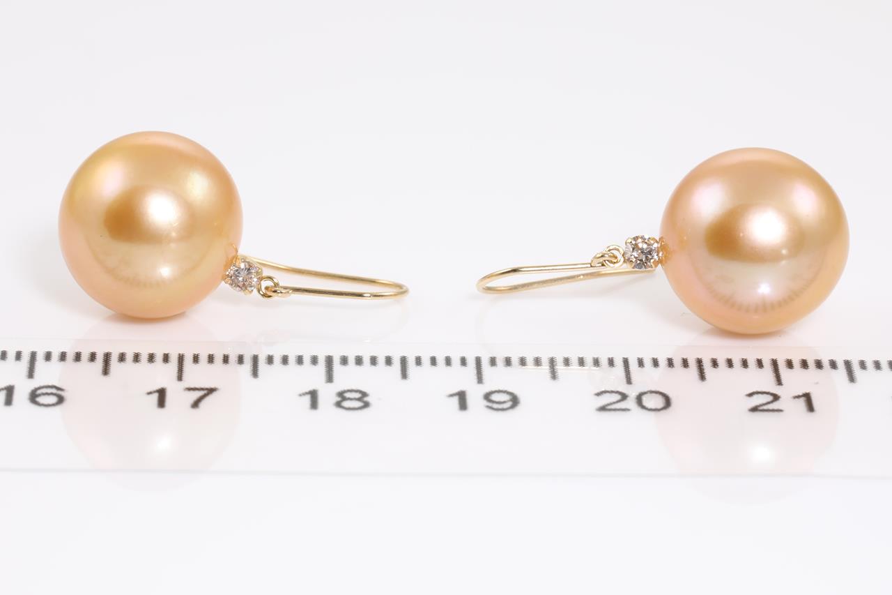 Pearl and Diamond shepherds hook earrings with Golden South Sea Pearls of 13.00mm-12.00mm and Diamonds of 0.04cts. 18ct yellow gold. Weight: 2.6g. (Pre-owned)