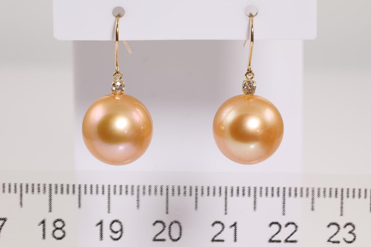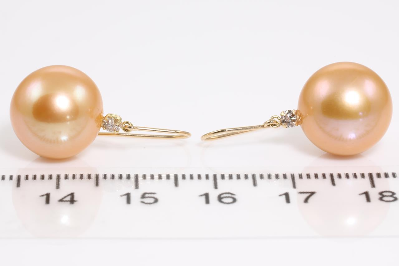 Pearl and Diamond shepherds hook earrings with golden South Sea pearls of 12mm and round Diamonds totalling 0.10cts. 18ct yellow gold. Weight: 5.5g. (Pre-owned)