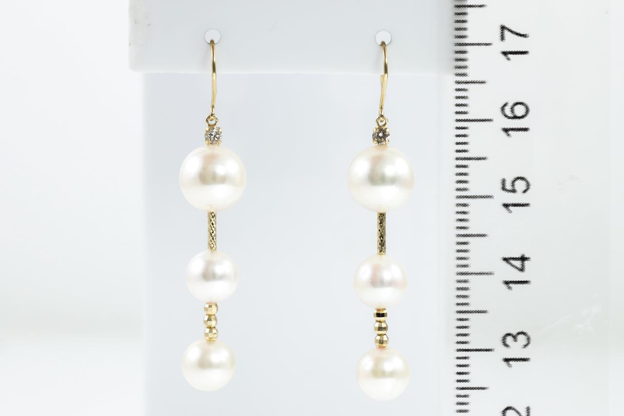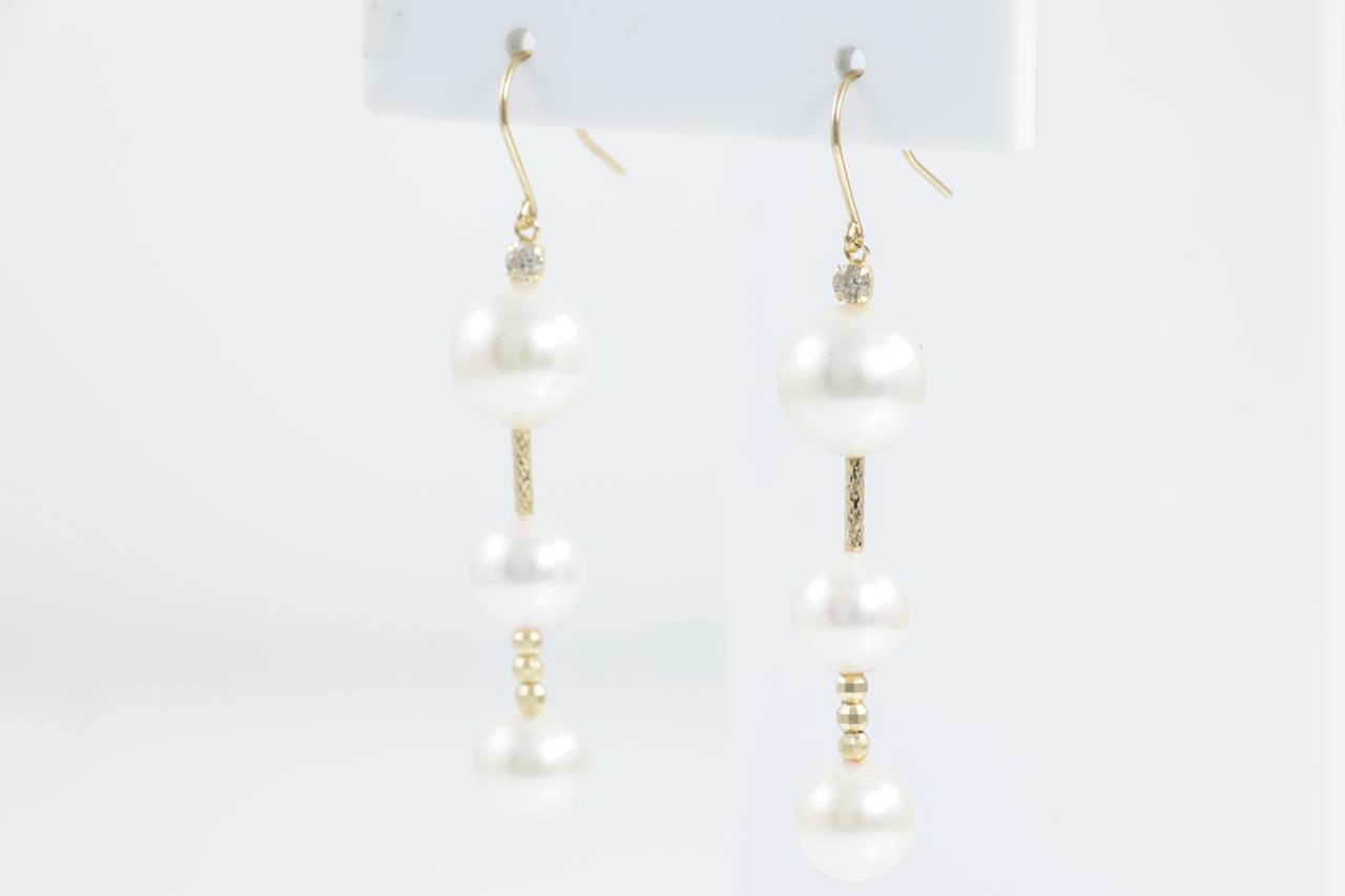 Pearl and Diamond shepherds hook drop earrings with Akoya pearls of 7mm - 9mm and Diamonds totalling approximately 0.08cts. 18ct yellow gold. Weight: 4.7g (Pre-owned)