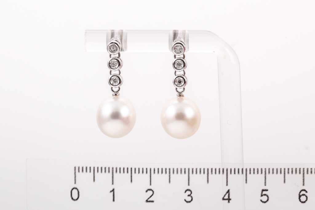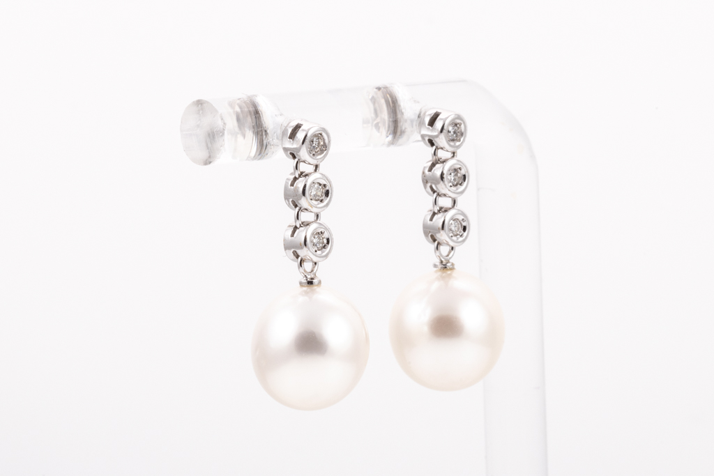 Pearl and Diamond earrings with South Sea Pearls of 10.5mm and Diamonds totalling 0.10cts. 14ct white gold with 14ct white and silicon backs. Weight: 5.4g. (Pre-owned)
