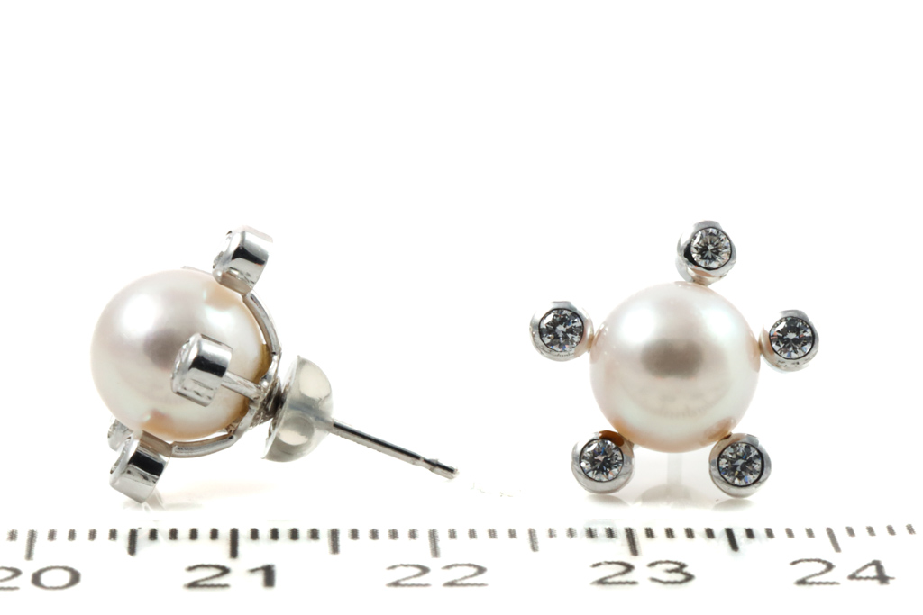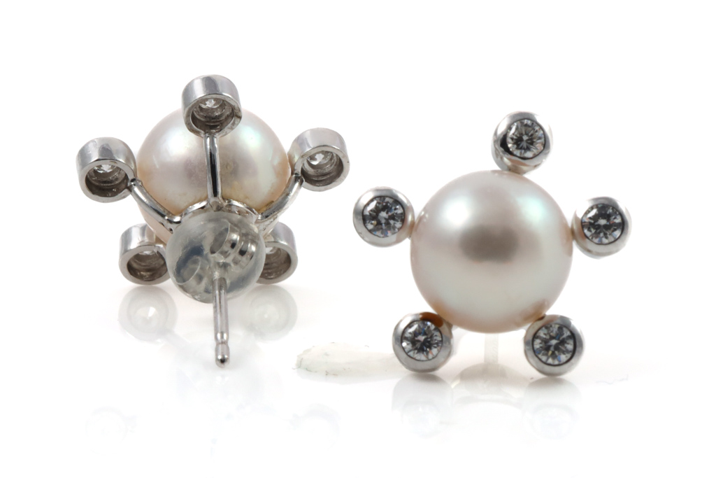 Pearl and Diamond earrings with cultured light pink Pearls of 8.5mm and Diamonds totalling 0.40cts (Estimated grading: H SI). Platinum - 900. Weight: 5.5g. (Pre-owned)