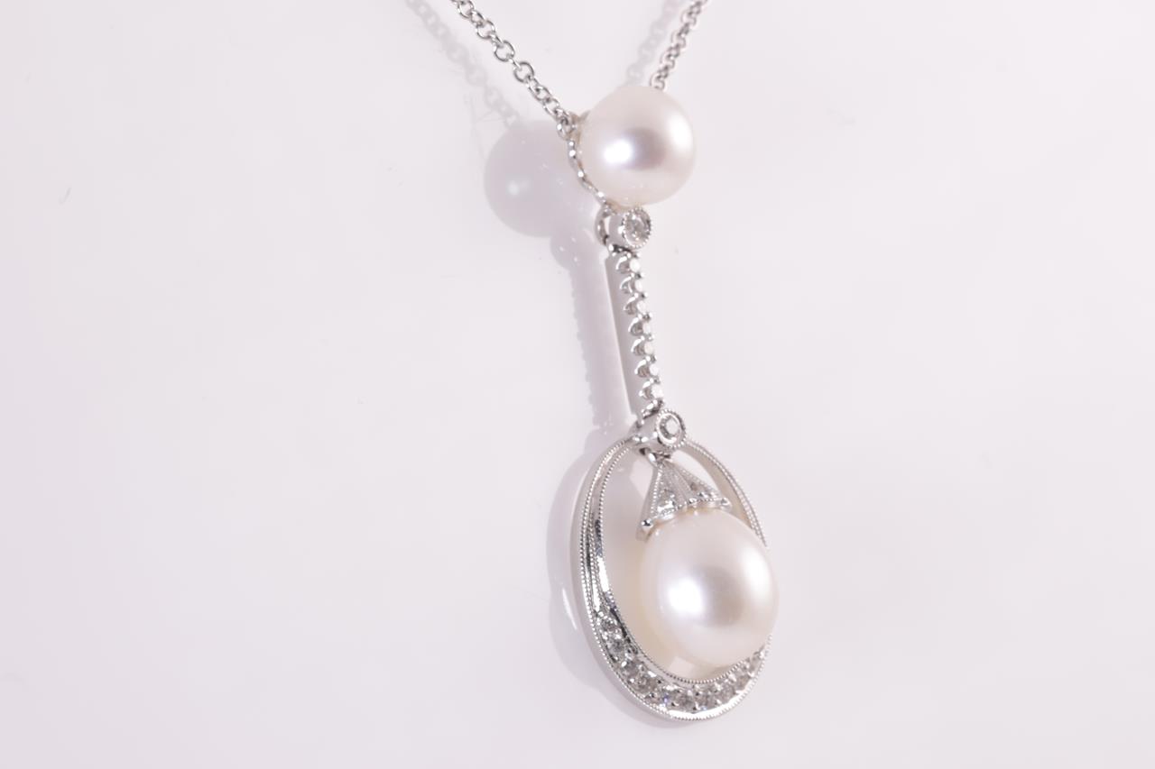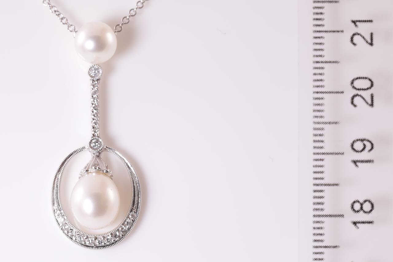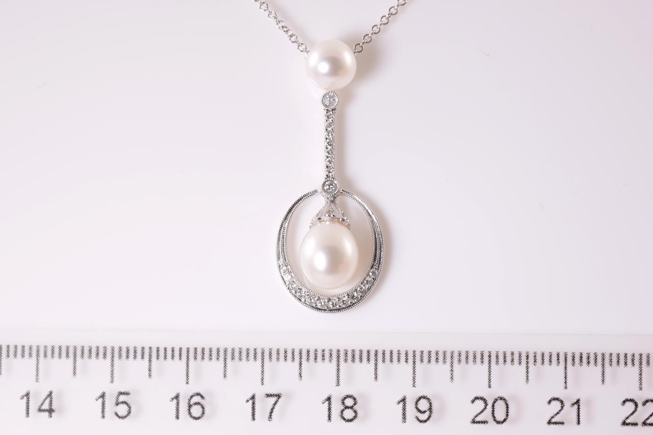 Pearl and Diamond Necklace with 2 cultured Pearls, round and oval of 7.9-6.8mm and round Diamonds totalling approximately 0.21cts. 18ct white gold with 44cm chain. Pendant weight: 5.2g. (As New)