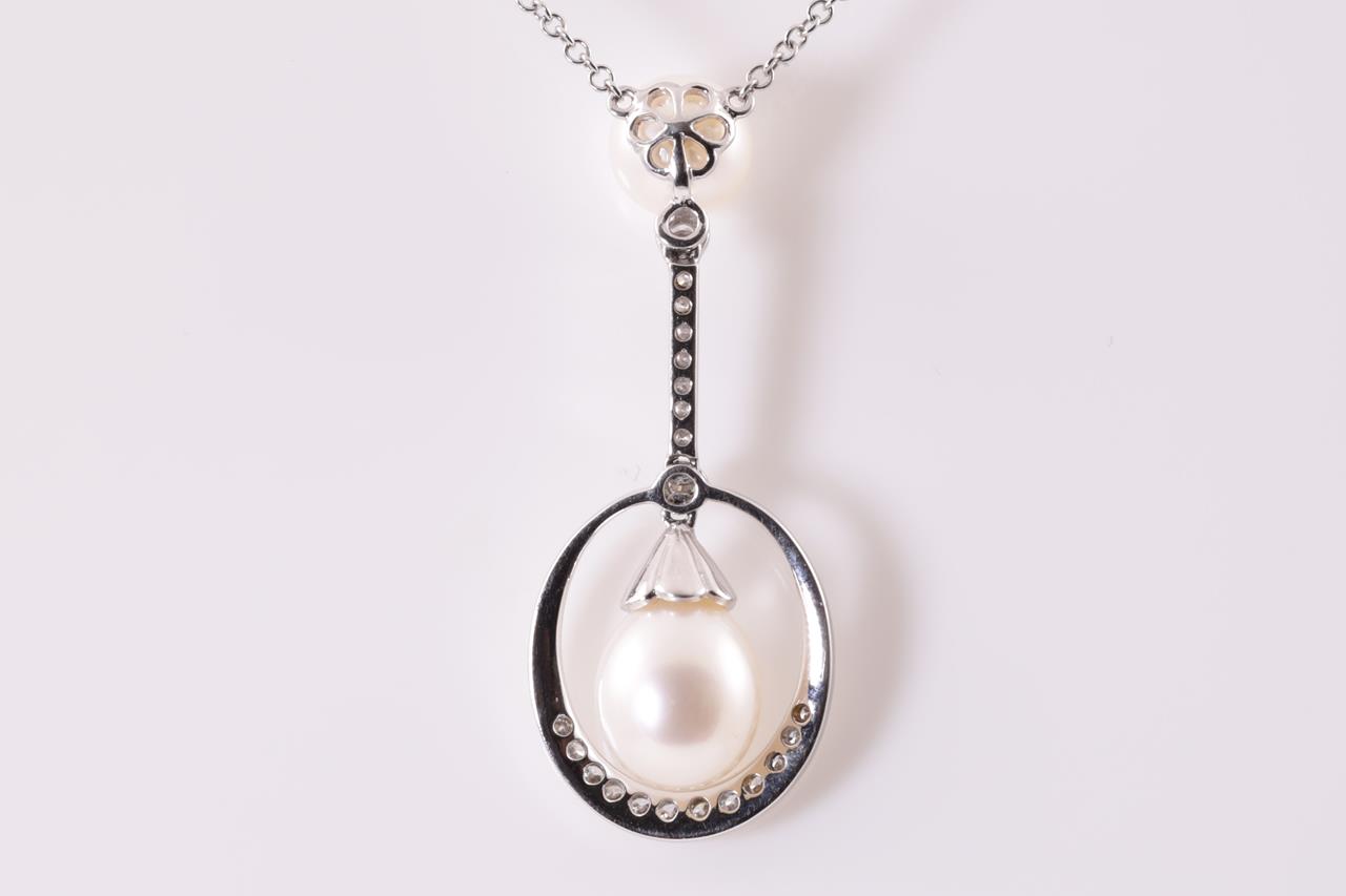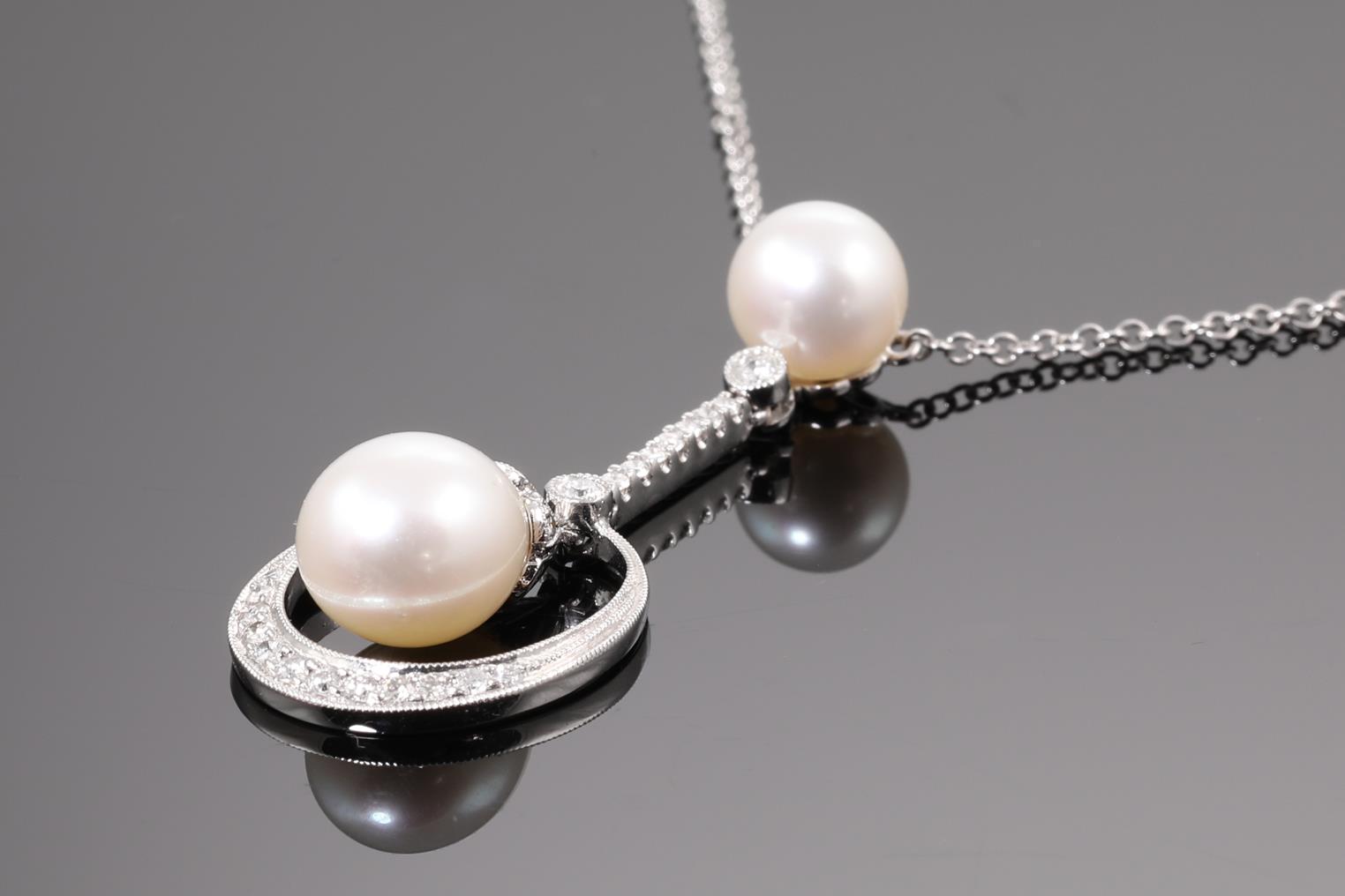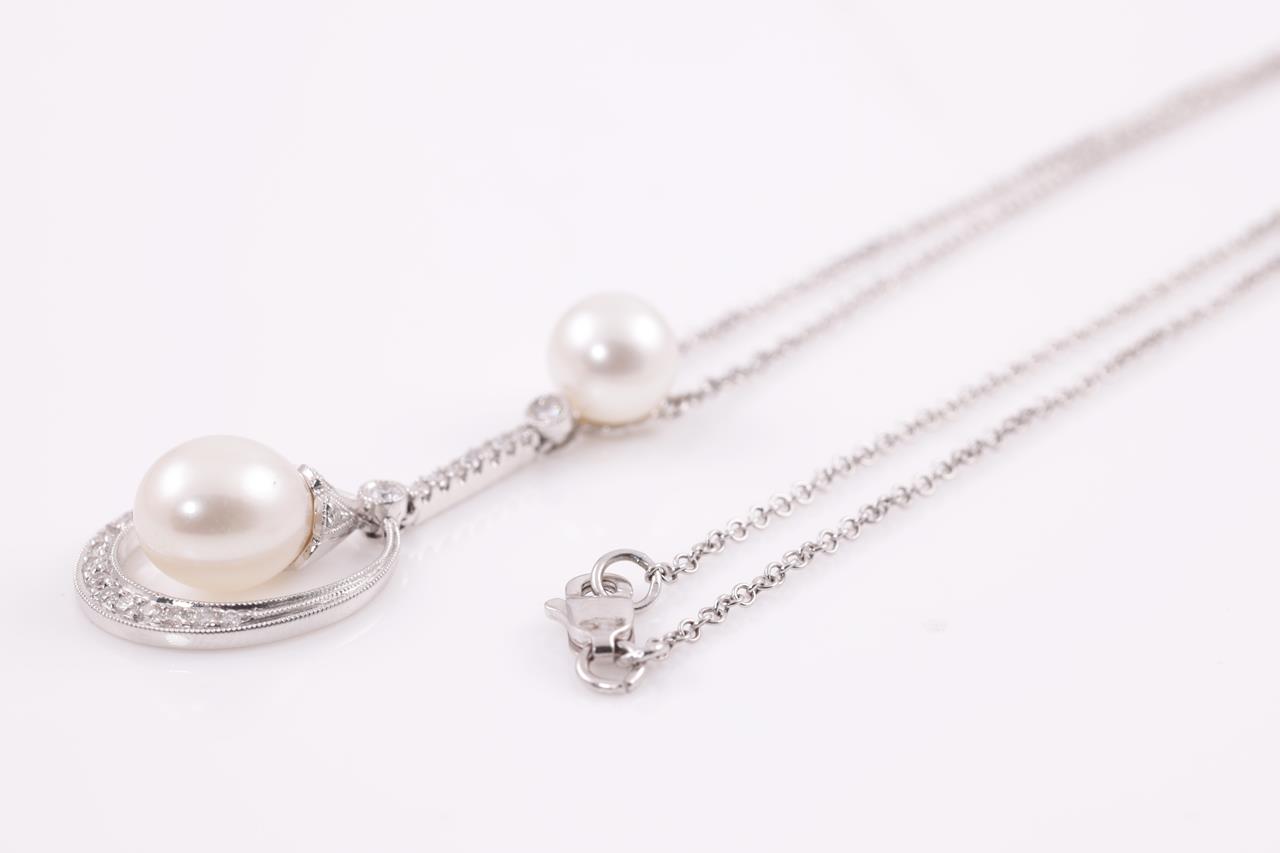 Pearl and Diamond Necklace with 2 cultured Pearls, round and oval of 7.9-6.8mm and round Diamonds totalling approximately 0.21cts. 18ct white gold with 44cm chain. Pendant weight: 5.2g. (As New)