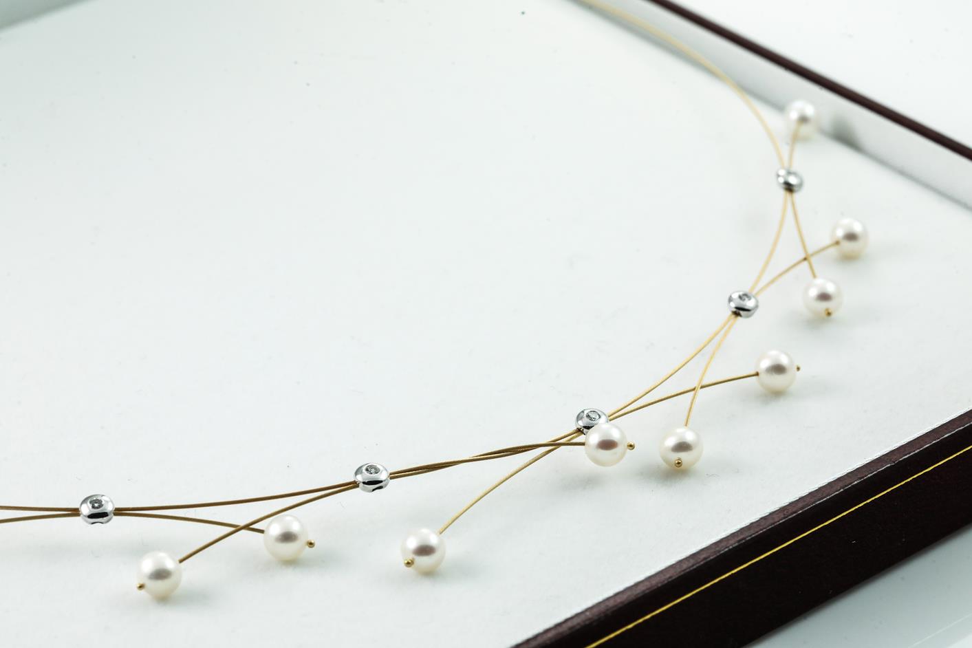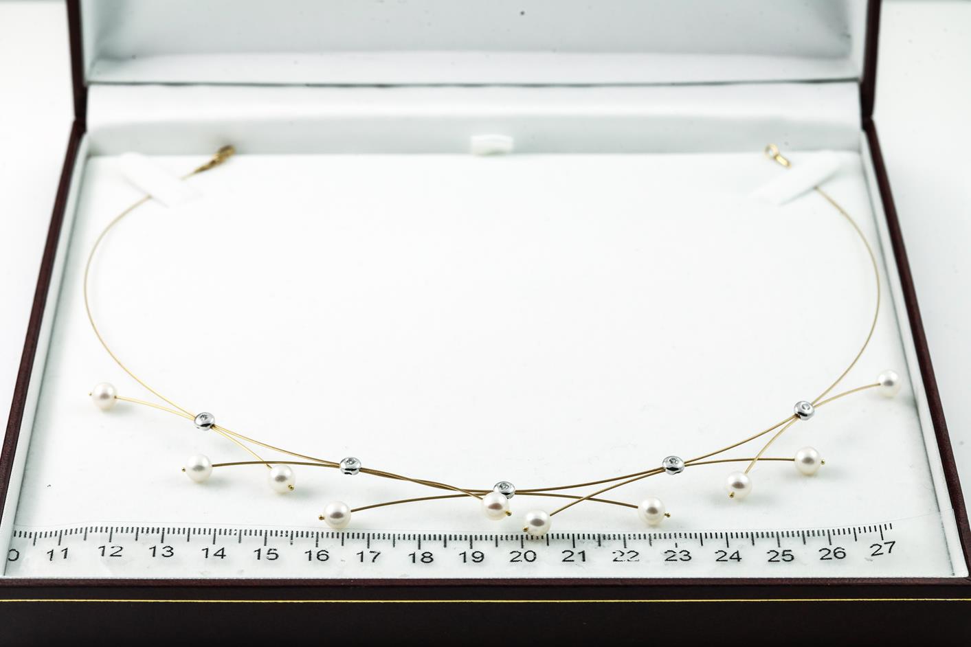 Pearl and Diamond Necklace with Akoya Pearls of 5.4mm and 5 round Diamonds totalling approximately 0.25cts . 18ct white and yellow gold. Approximate length 40cm. Weight 6.4g. (Pre-owned)