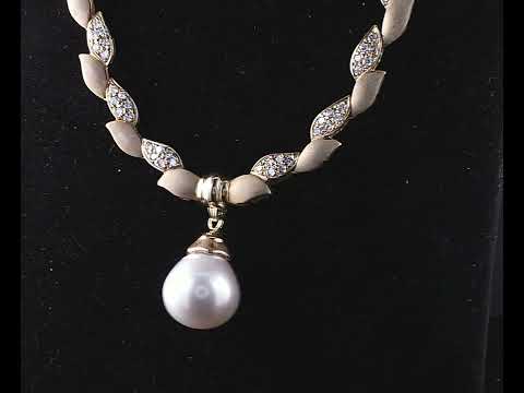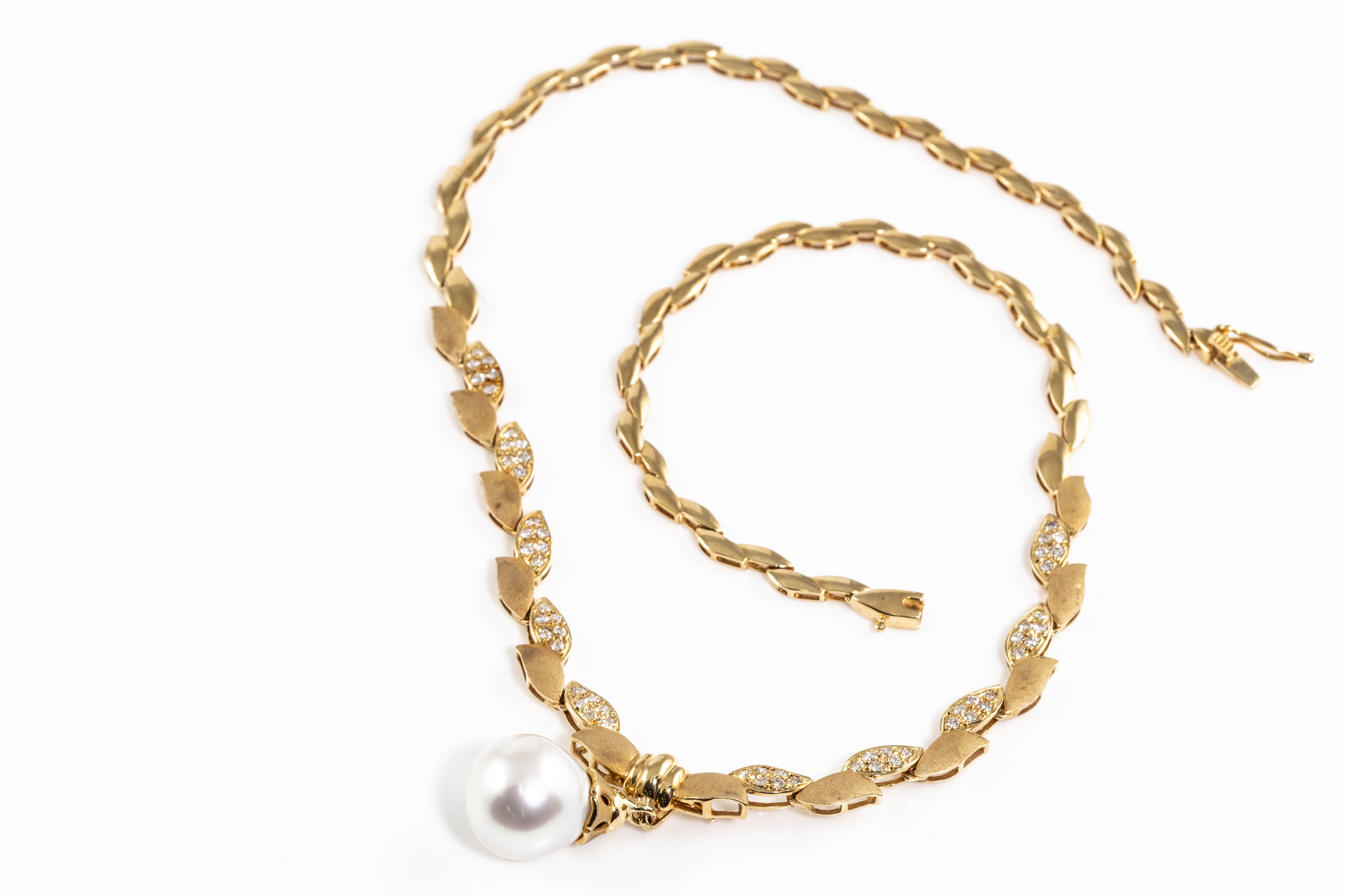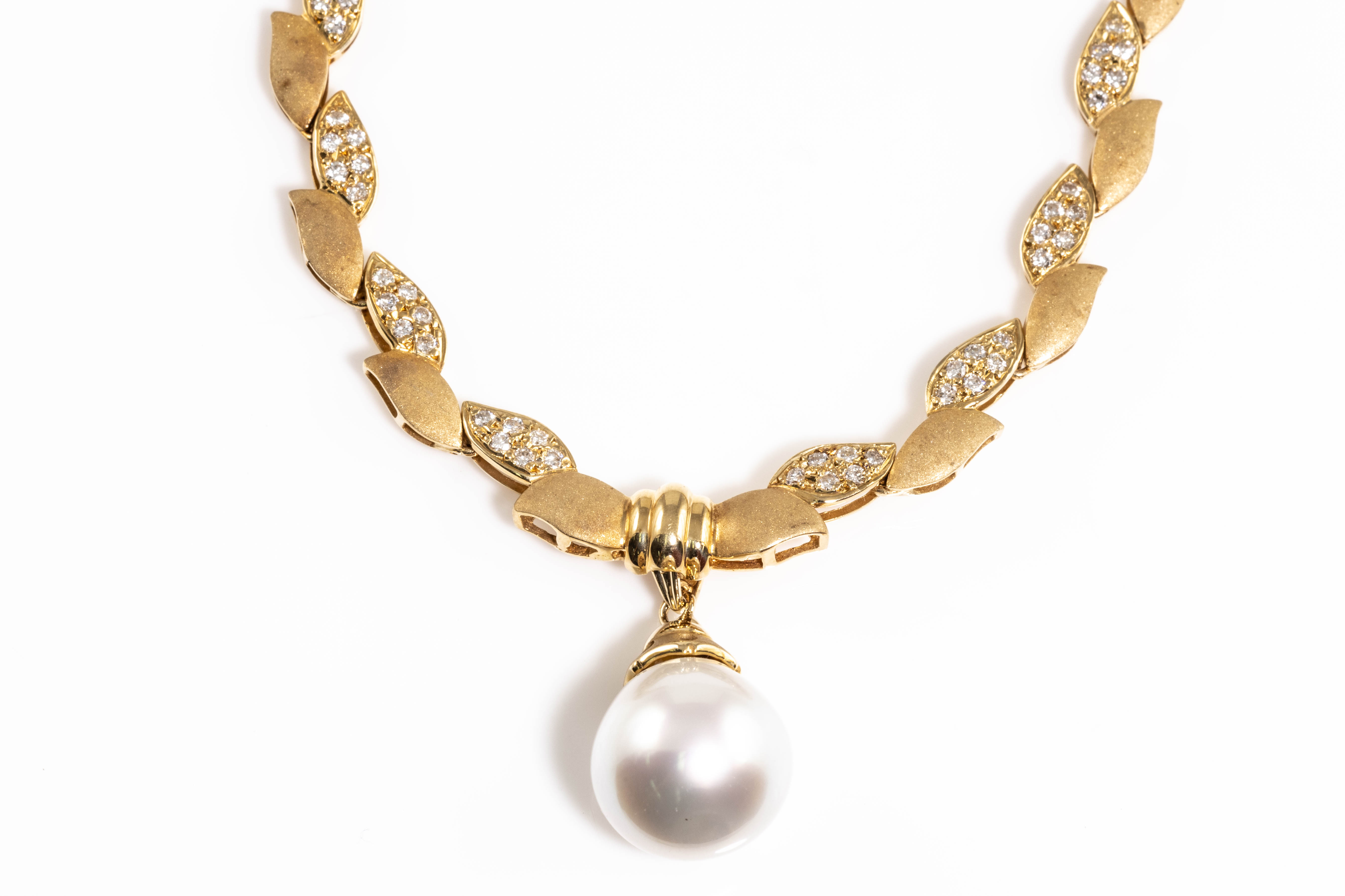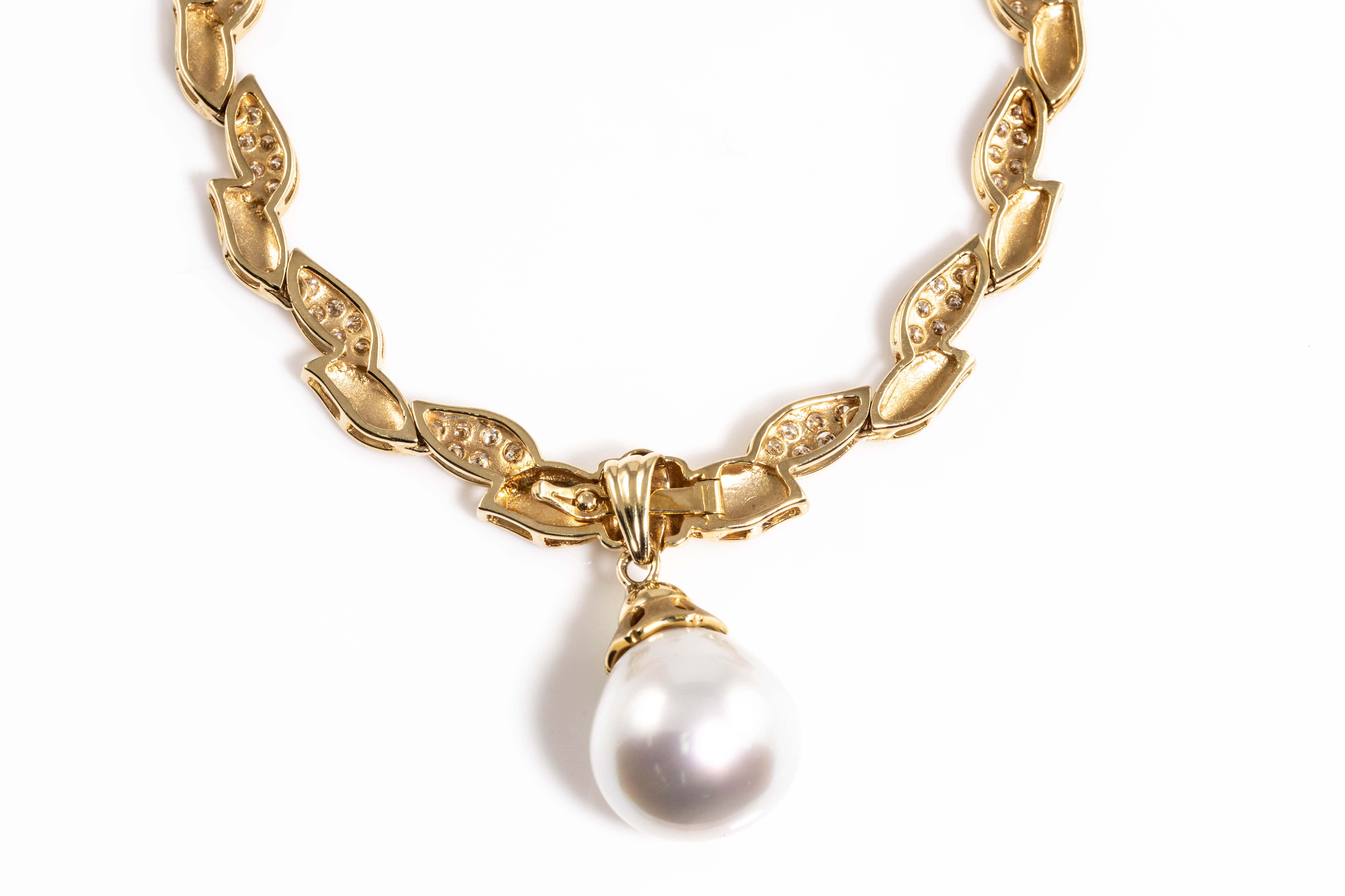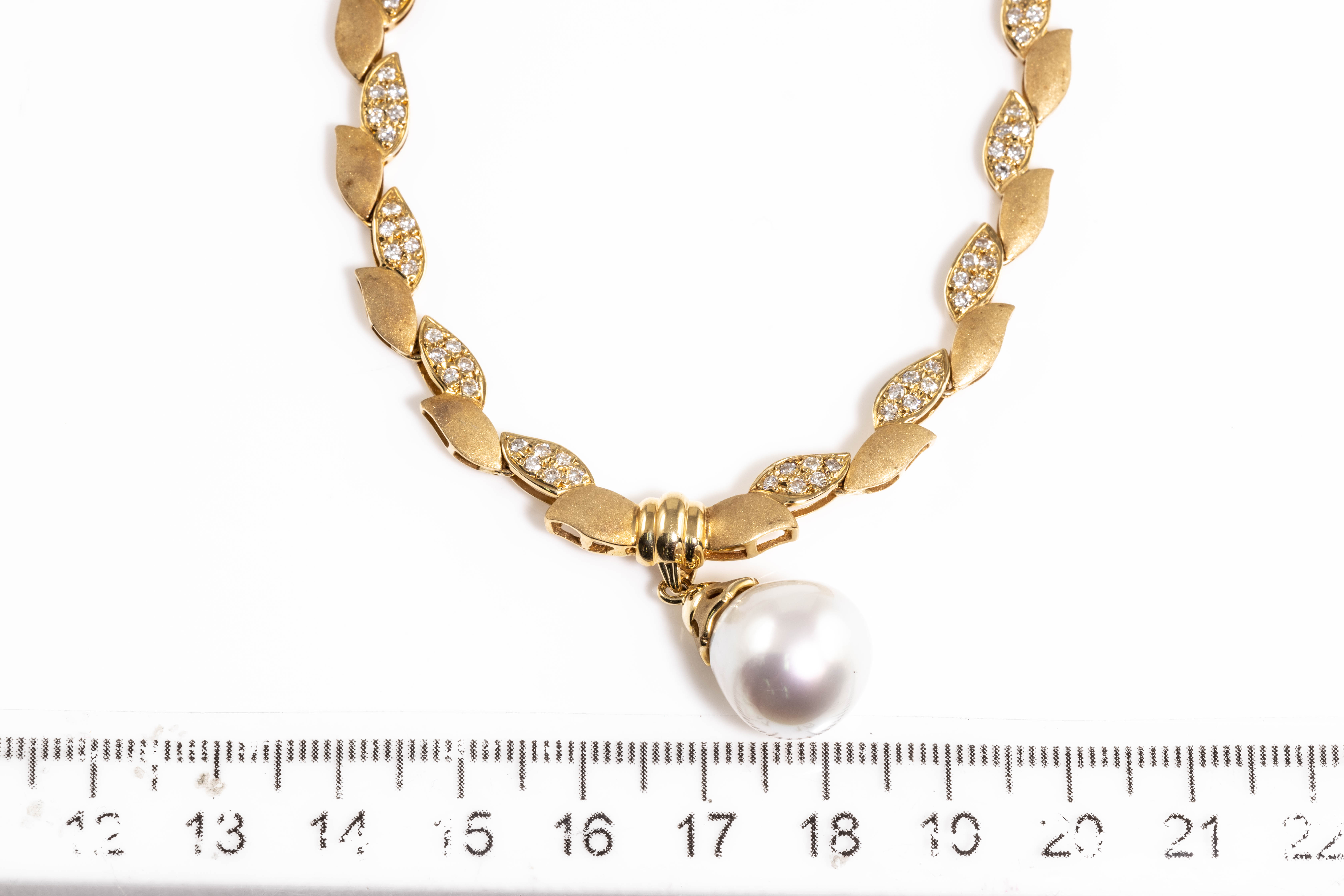 Pearl and Diamond necklace with drop shape South Sea Parl of 13.2mm (unattachable) and round Diamonds totalling 0.95cts (Estimated grading: H-I SI). 18ct yellow gold with 42cm chain. Weight 24.2g. With Certificate #416394. (Pre-owned)