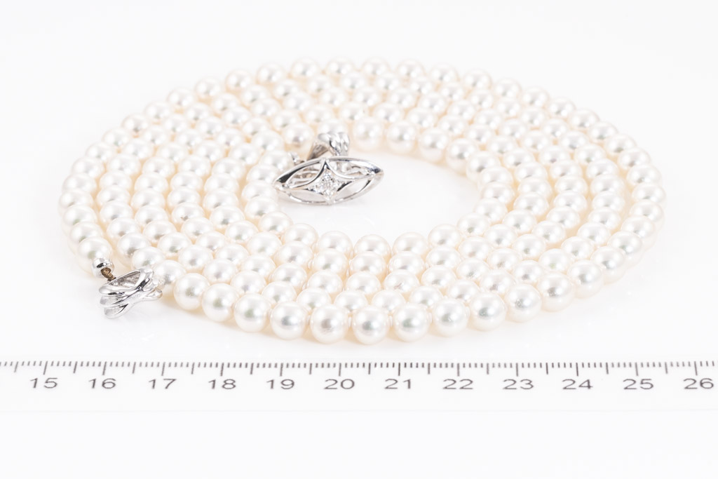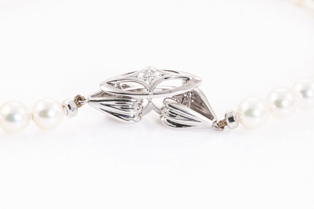 Pearl and Diamond necklace with Akoya Pearl of 6.5mm. 14ct white gold detachable clasp with 4 round Diamonds totalling 0.02cts. Length: 130cm. Weight: 83.9g. (Pre-owned)