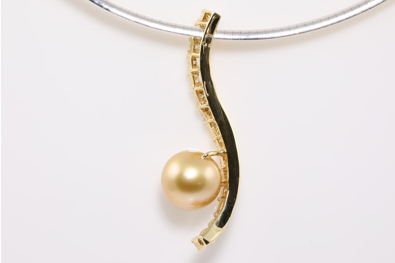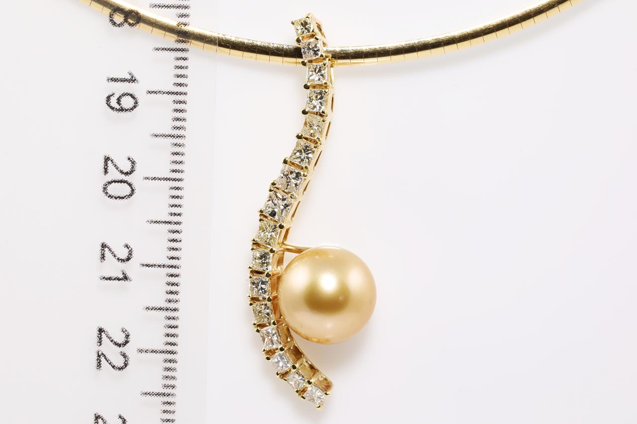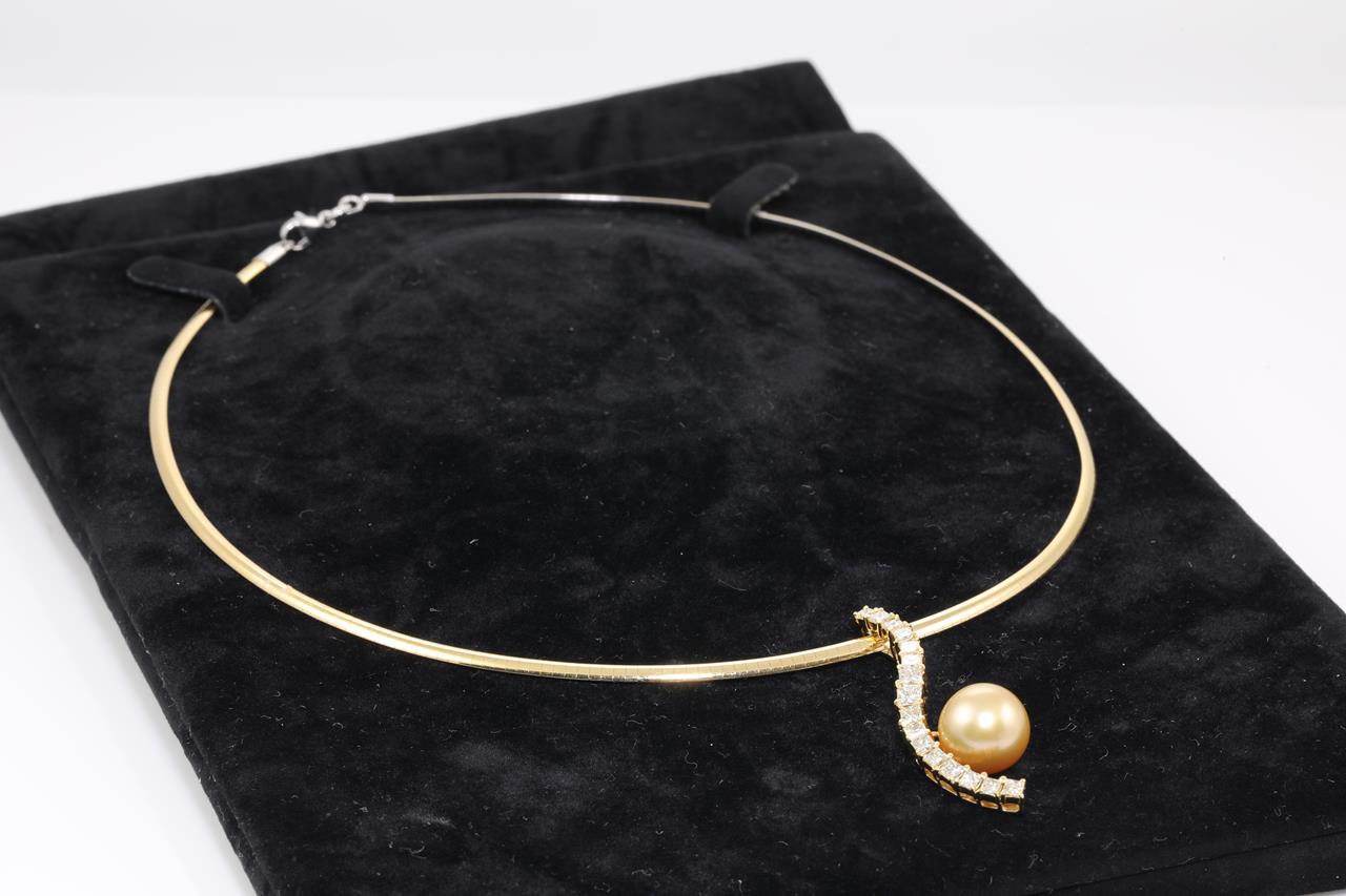Pearl and Diamond necklet with a Golden South Sea Pearl of 11.3mm and Diamonds totalling 1.45cts (Estimated grading: Graduated Yellow Colour Tones from Yellow to Very Light Yellow VS-SI). 18ct yellow gold and white gold with reversable Omega necklace. Length: 42cm. Weight: 18.3g. (Pre-owned)