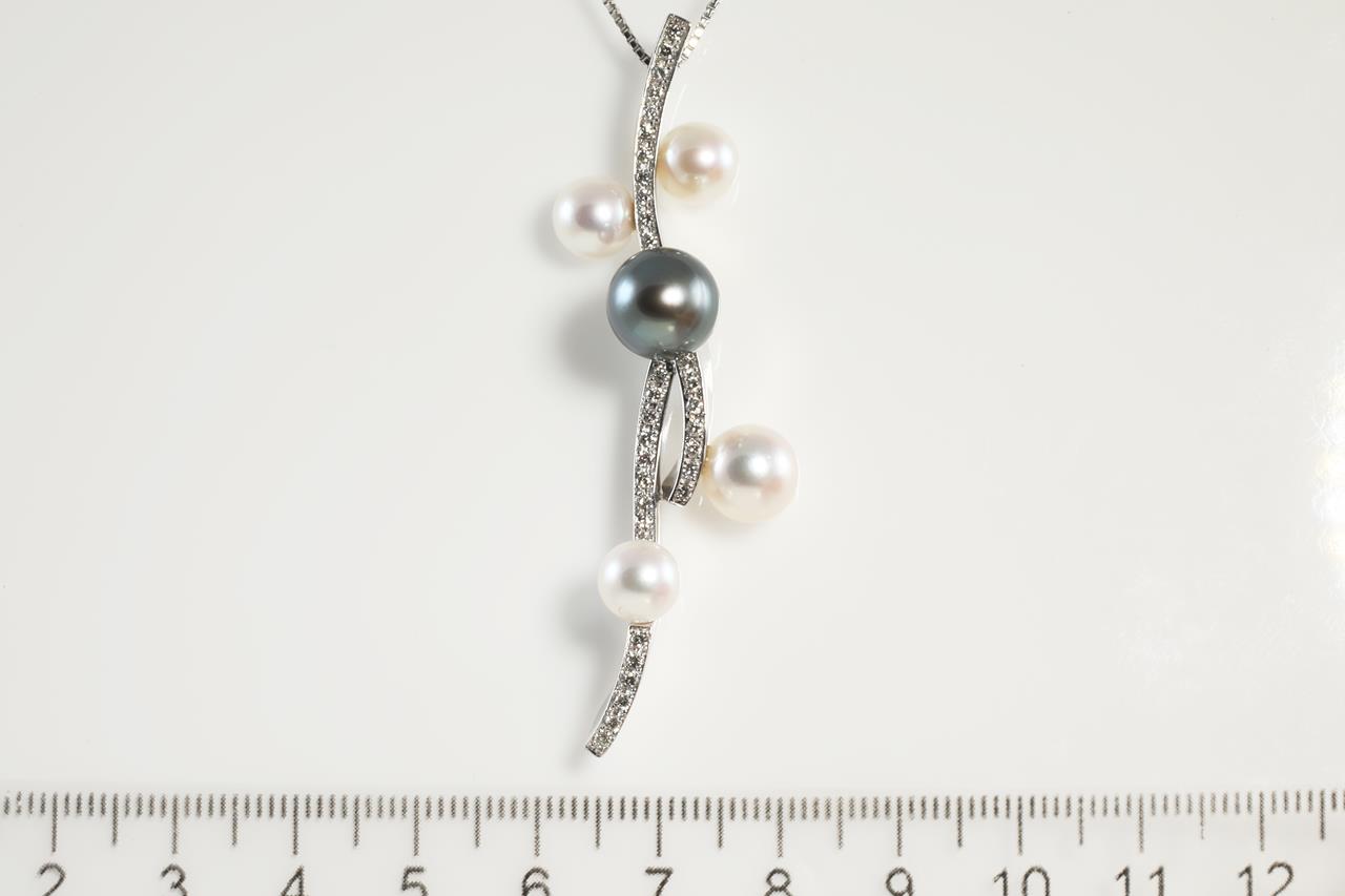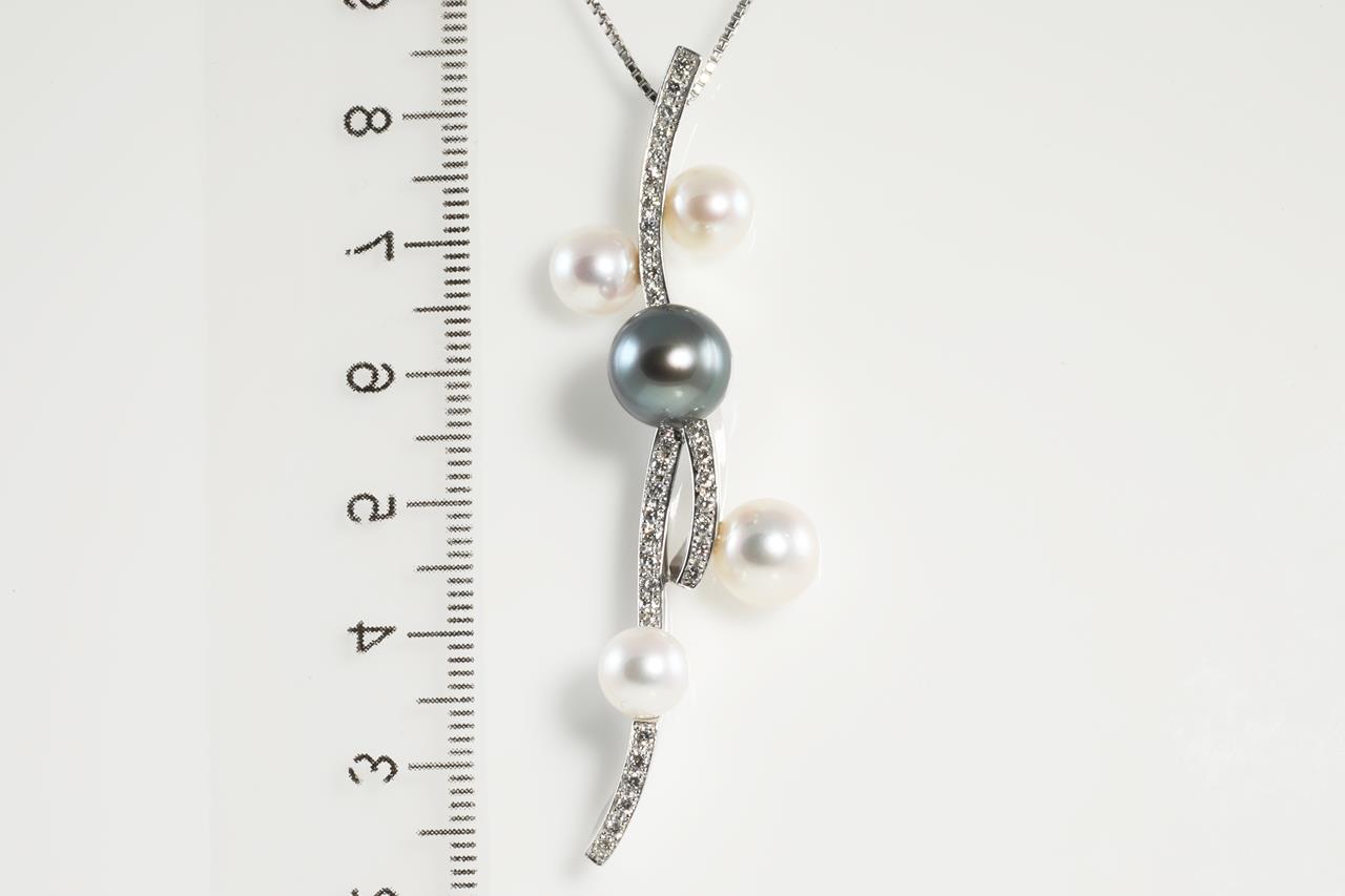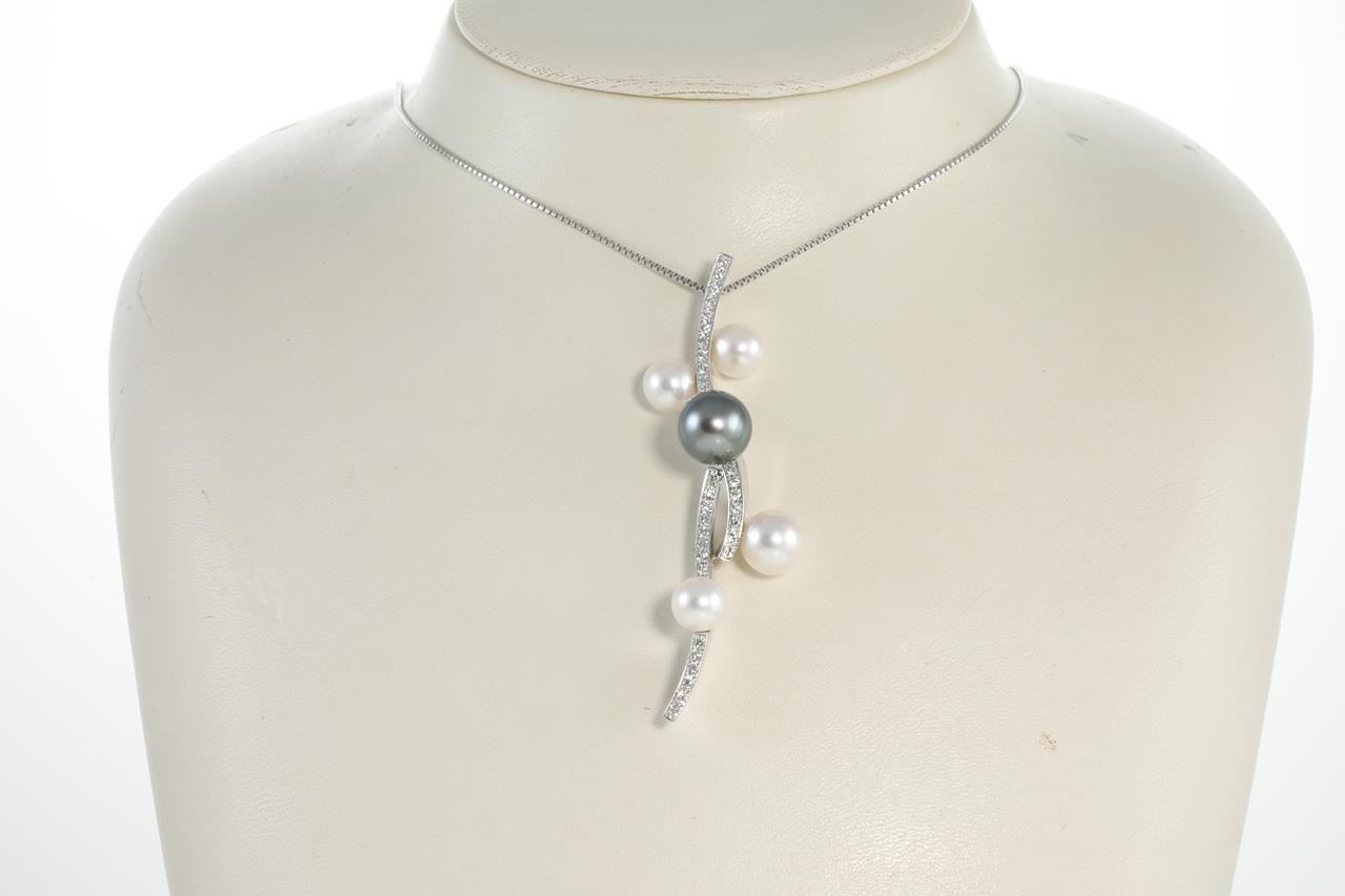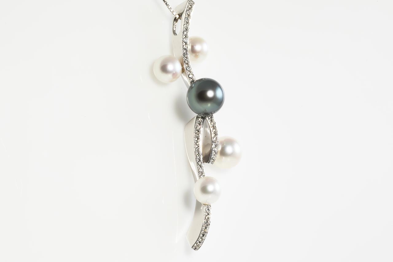 Pearl and Diamond pendant with Tahitian Pearl of 9mm and four white cultured Pearls (sizes from 8mm to 6mm) and Diamonds totalling 0.43cts (Estimated grading: G VS-SI). 18ct white gold with 18ct gold adjustable 46cm chain. Weight: 15.9g. (Pre-owned)
