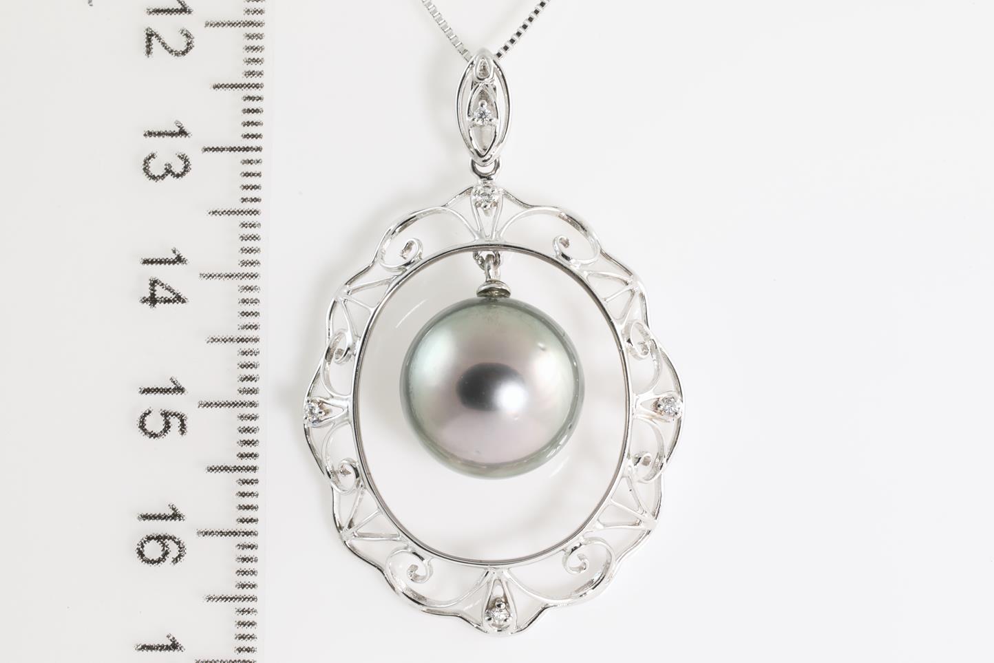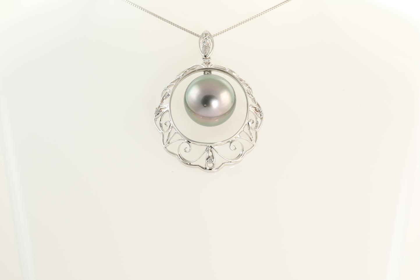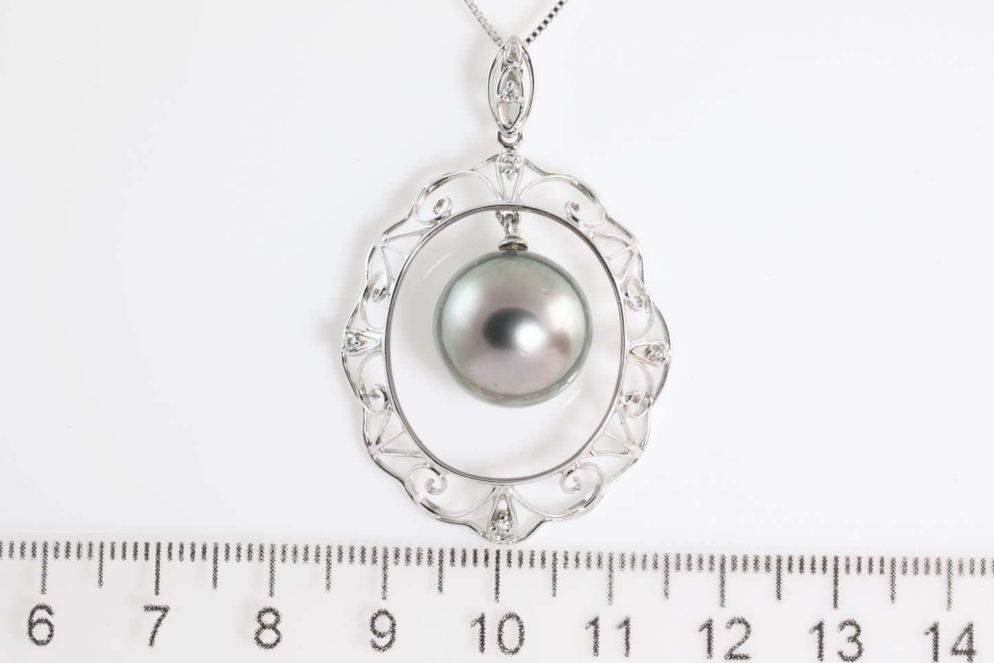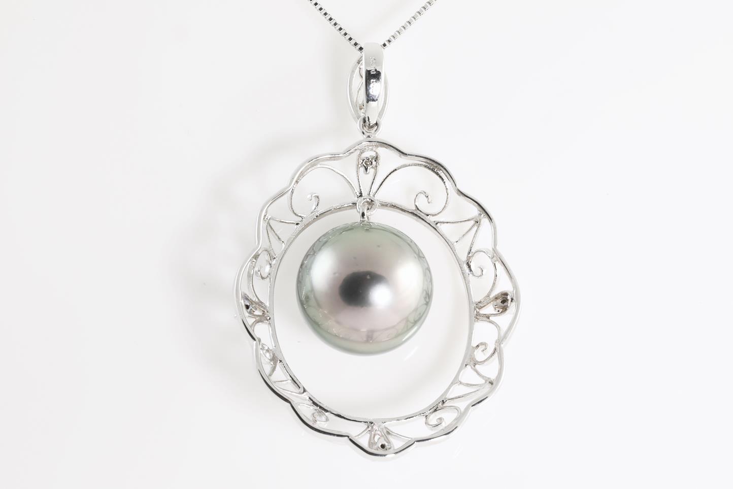 Pearl and Diamond pendant with Tahitian Pearl of 13.9mm and Diamonds totalling 0.05cts. 18ct white gold with 18ct white gold 45cm adjustable chain. Weight: 9.7g (Pre-owned)