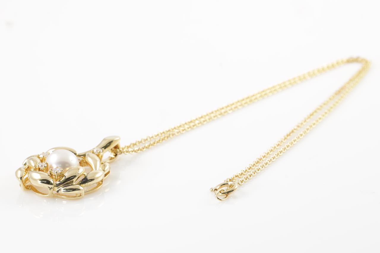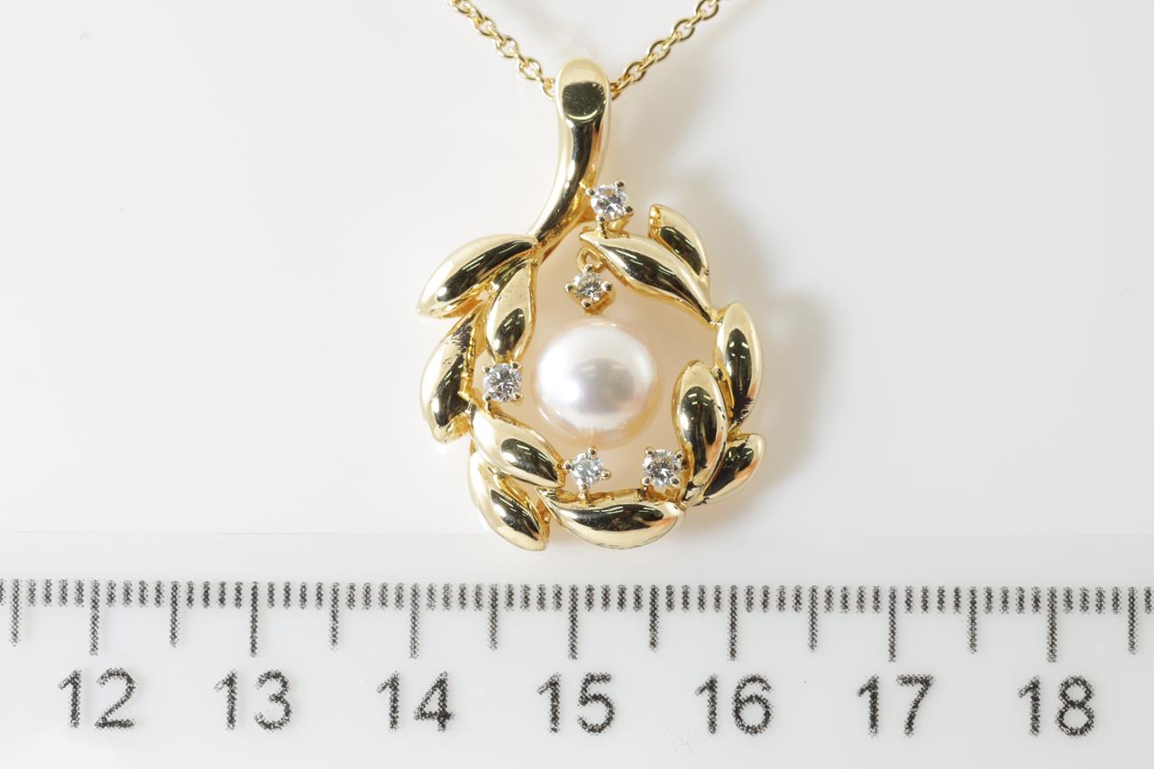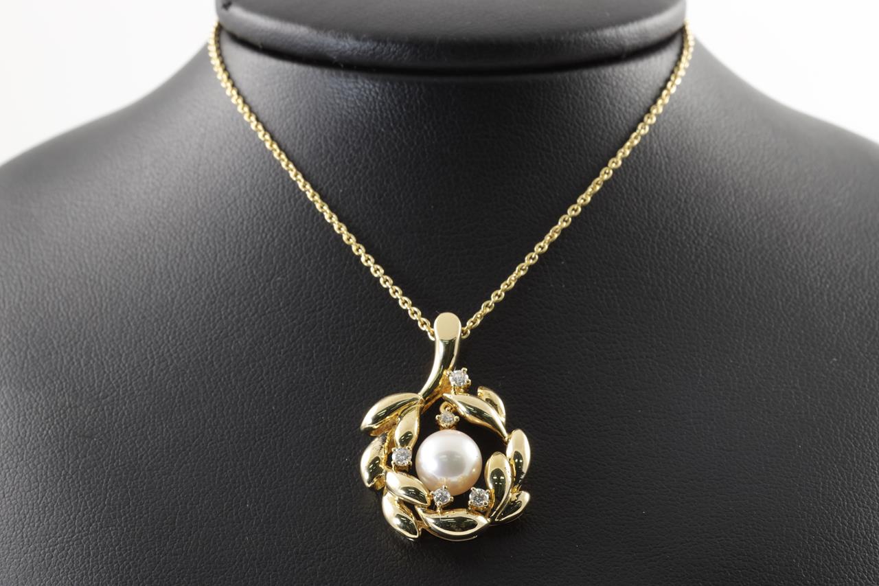 Pearl and Diamond pendant with a cultured pearl of 8.2mm and Diamonds totalling approximately 0.27cts. 18ct yellow gold with 40cm chain. Weight: 10.3g. (Pre-owned)