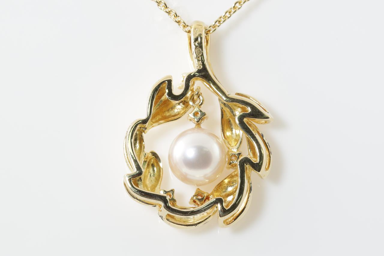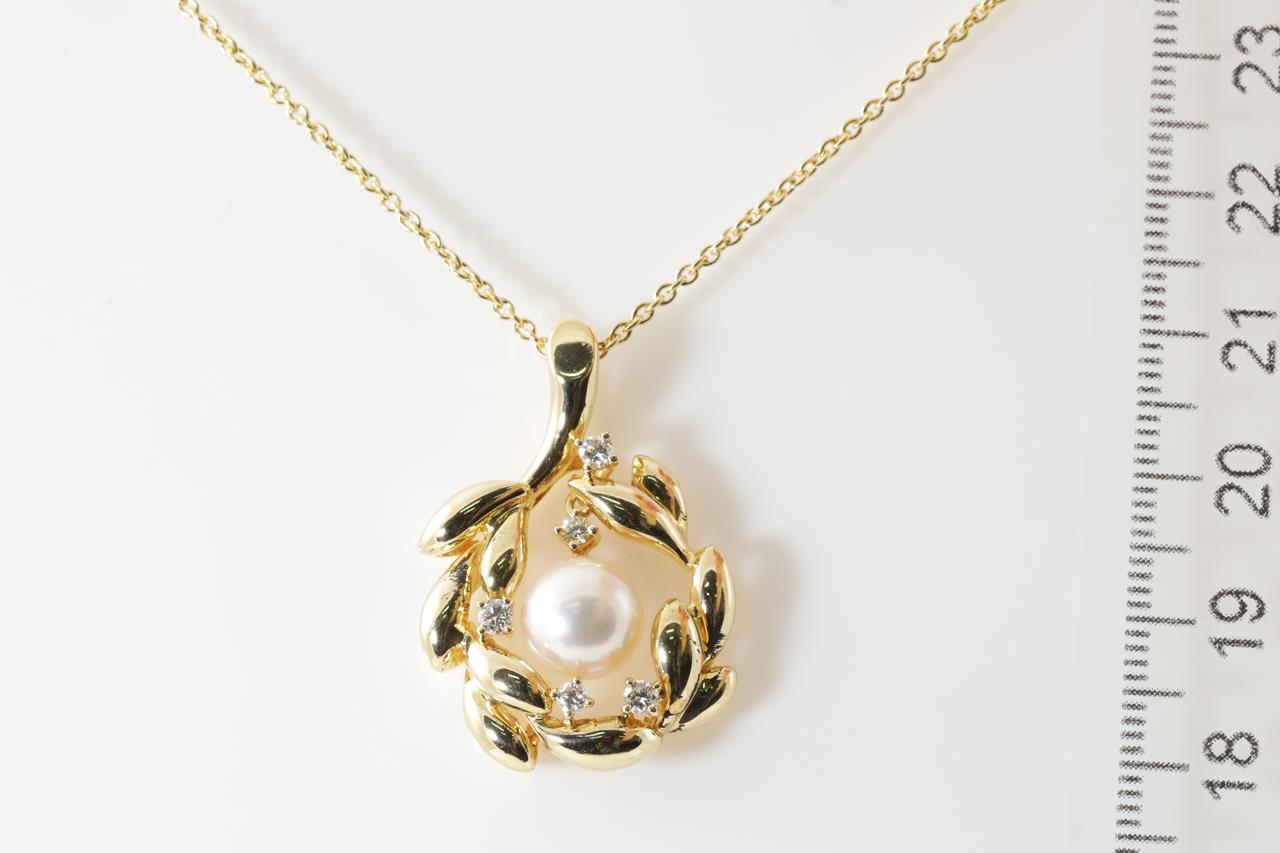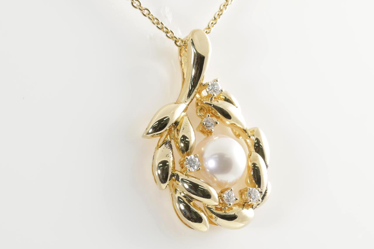 Pearl and Diamond pendant with a cultured pearl of 8.2mm and Diamonds totalling approximately 0.27cts. 18ct yellow gold with 40cm chain. Weight: 10.3g. (Pre-owned)