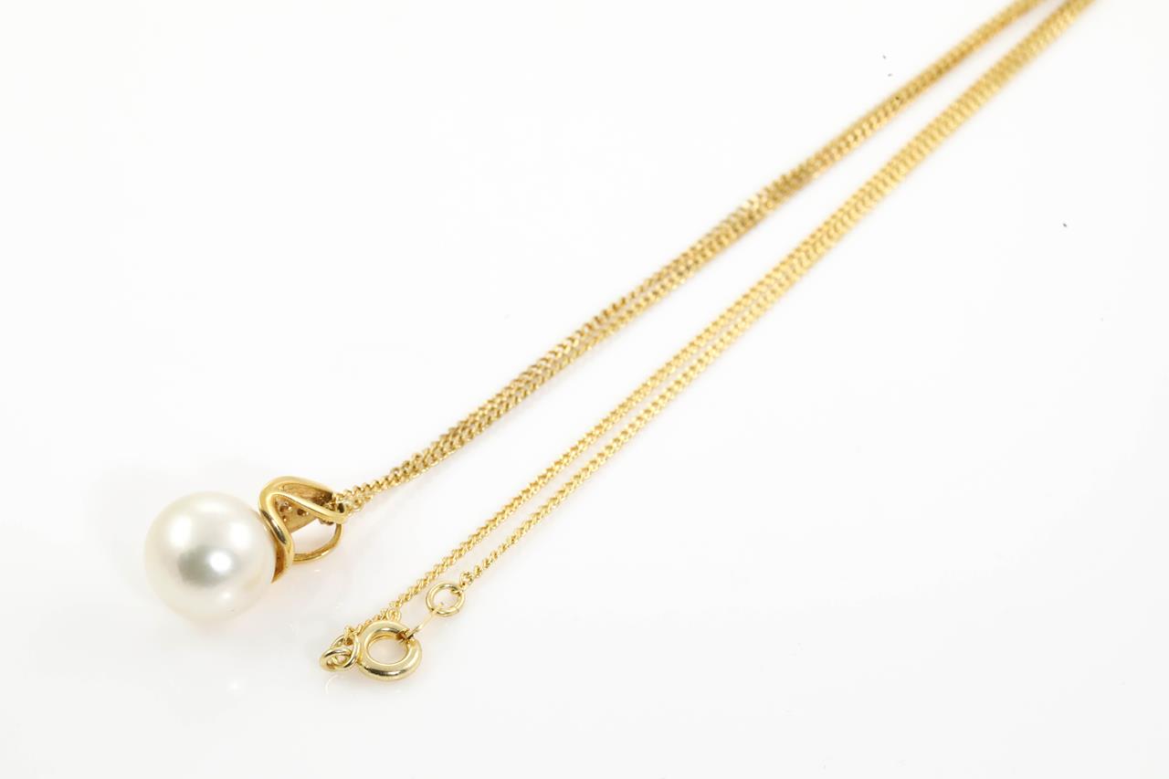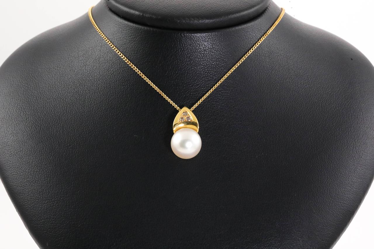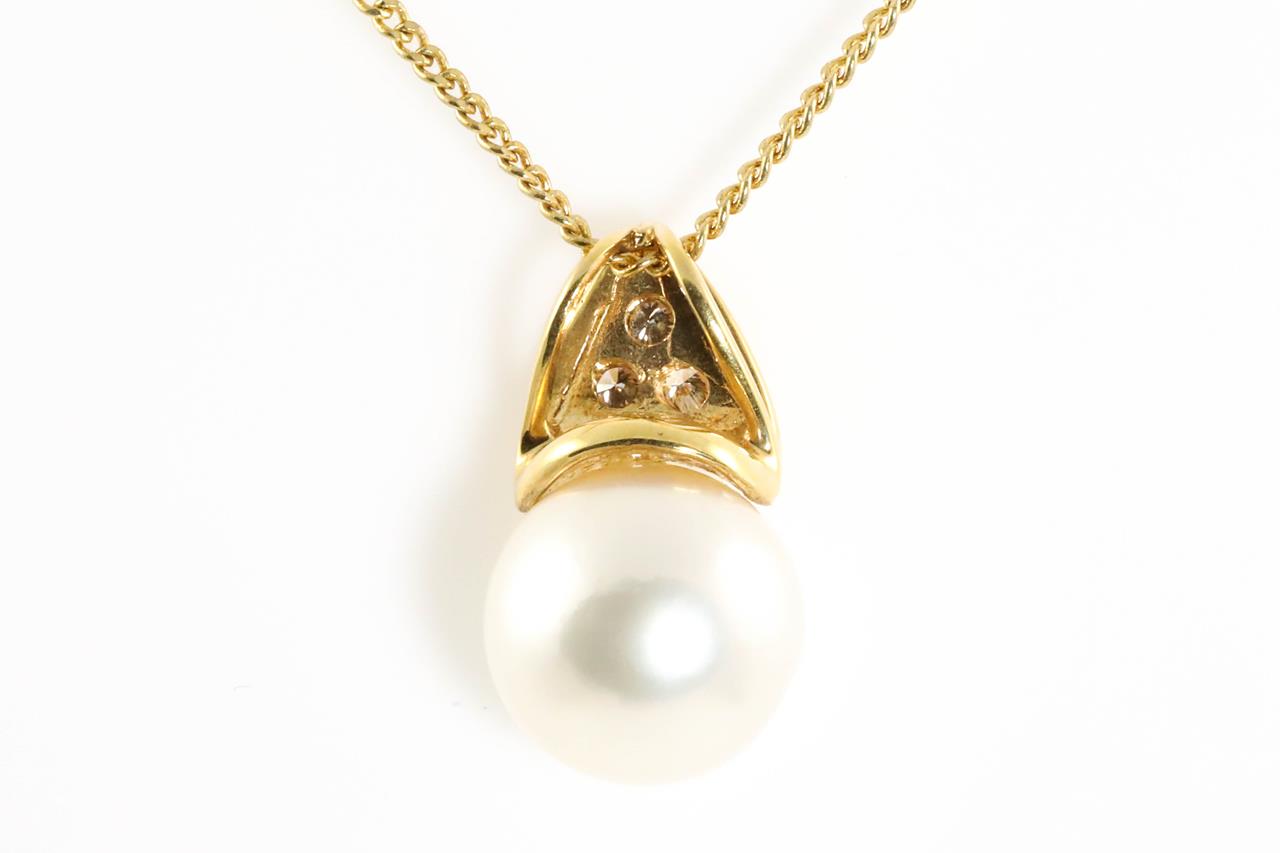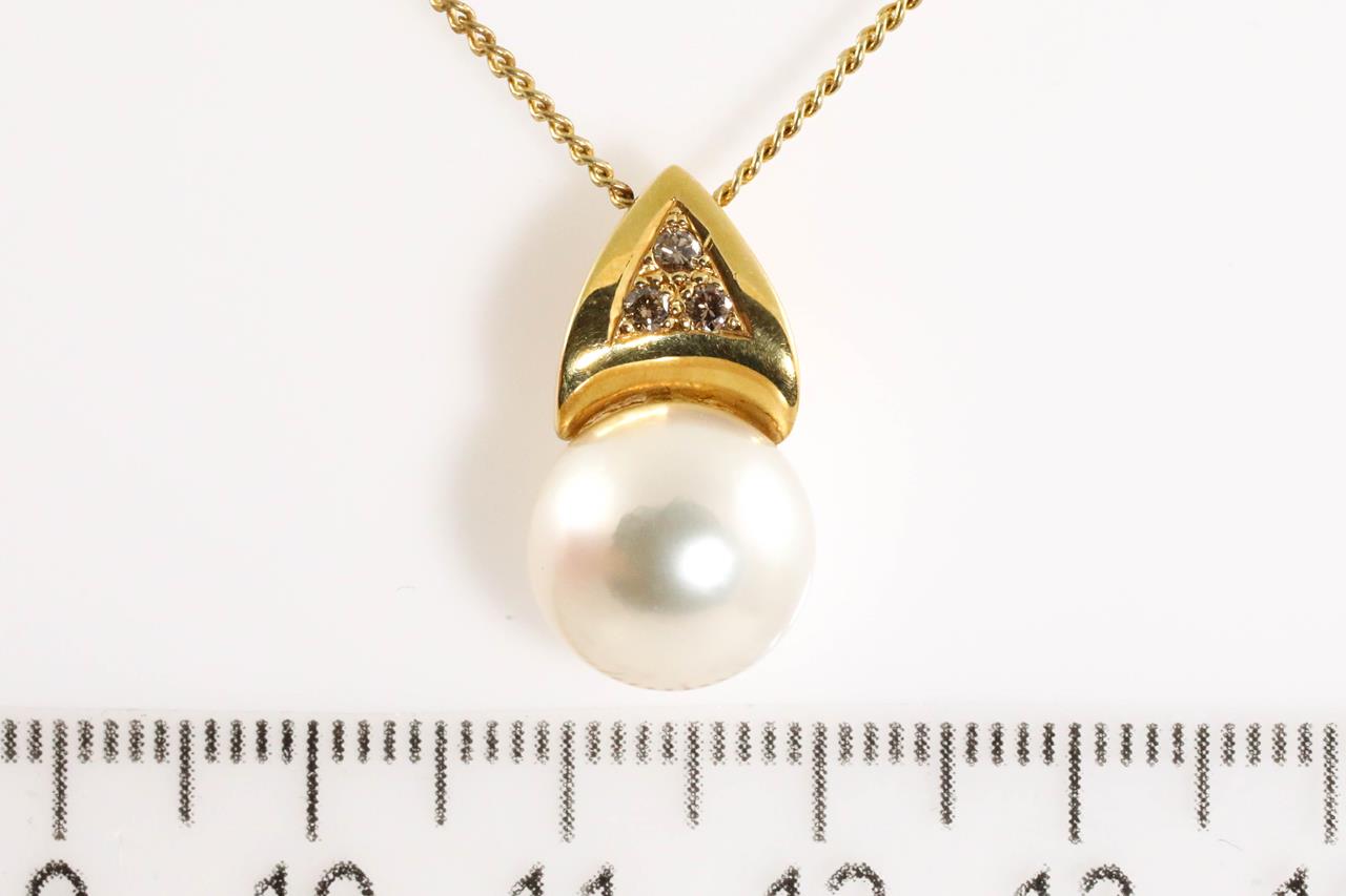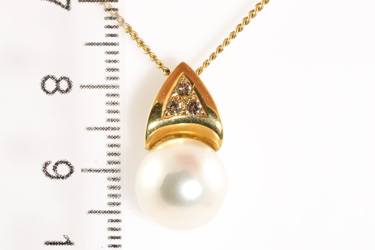 Pearl and Diamond pendant with a round South Sea White Pearl of 11.5mm and three round Champagne Diamonds totalling 0.06ct. 18ct yellow gold. With display chain (base metal). Pendant Weight: 3.8g. (Pre-owned)