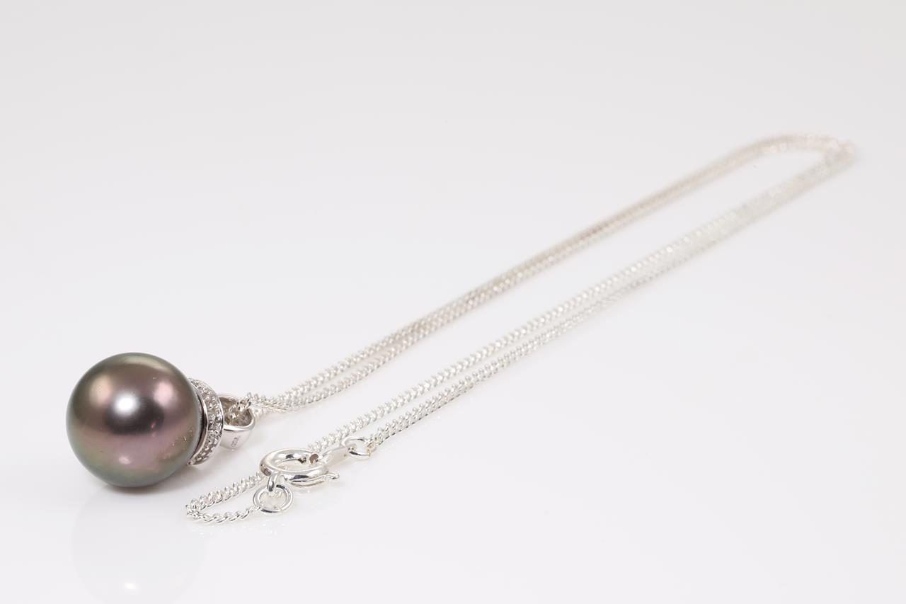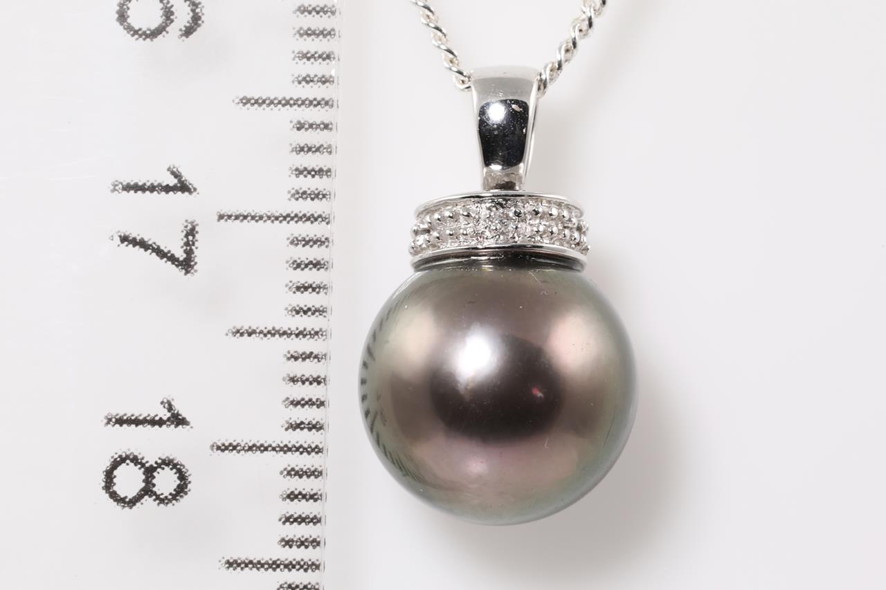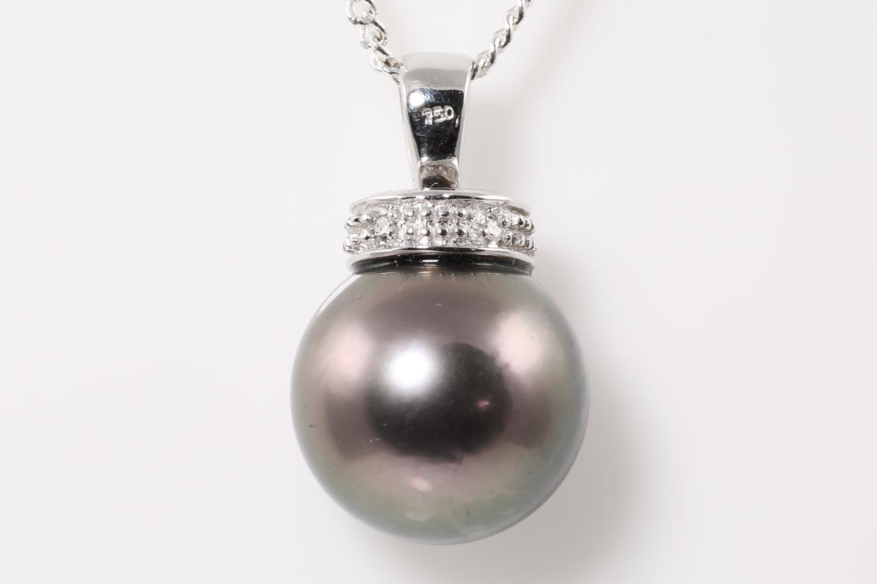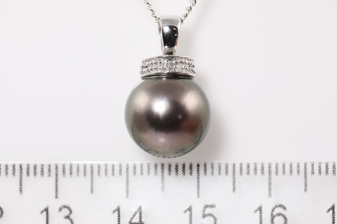 Pearl and Diamond Pendant with 12mm Tahitain Pearl and round Diamonds totalling approximately 0.05cts. 18ct white gold. With display chain (base metal). Weight 3.6g. (As New)