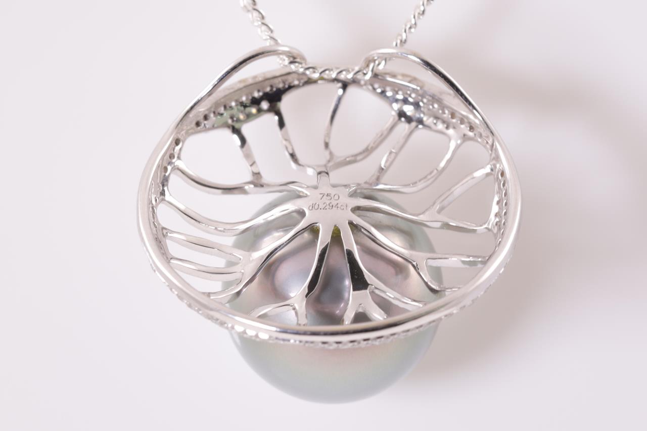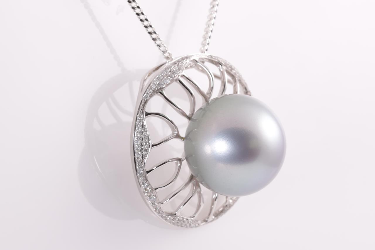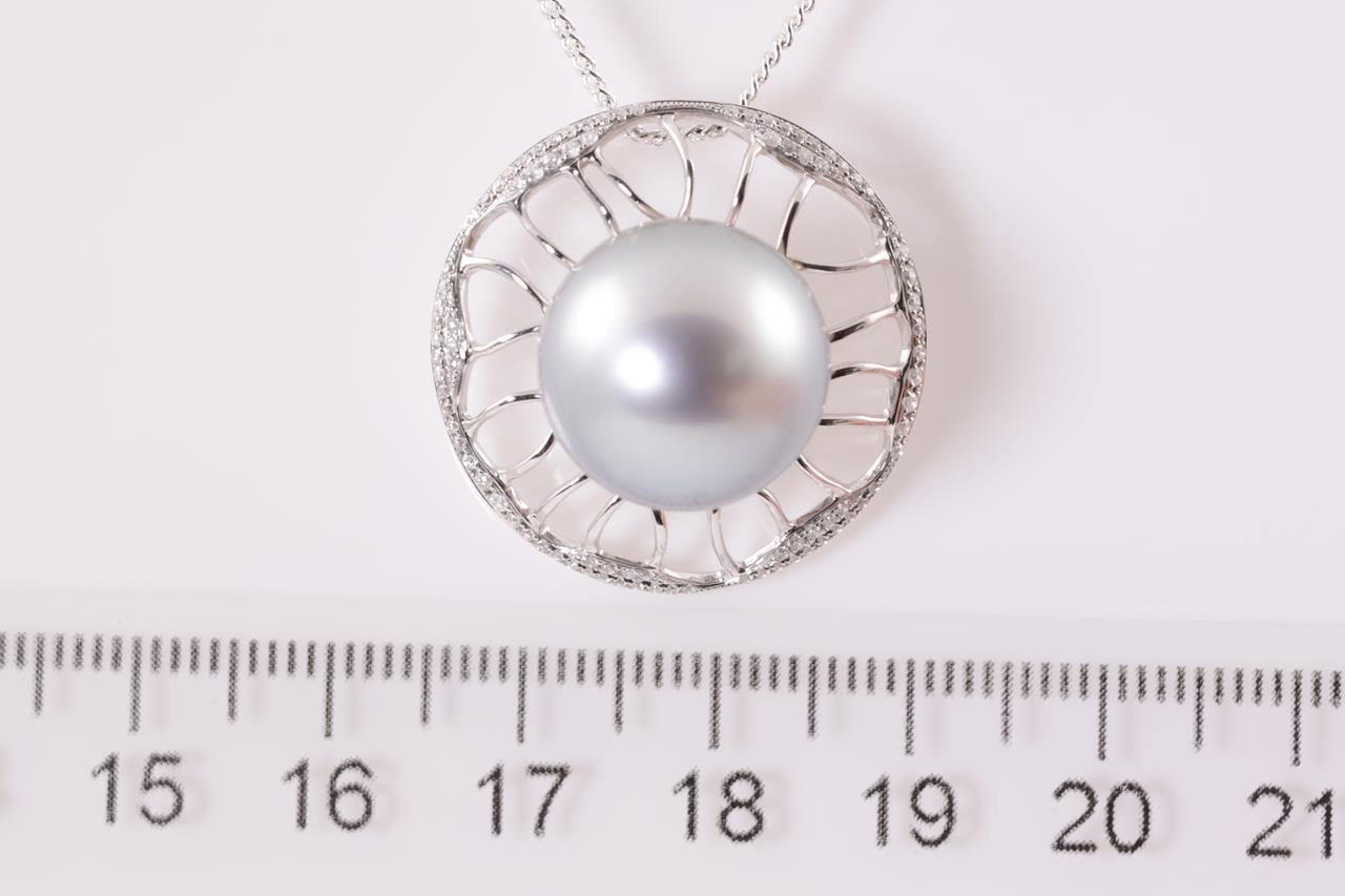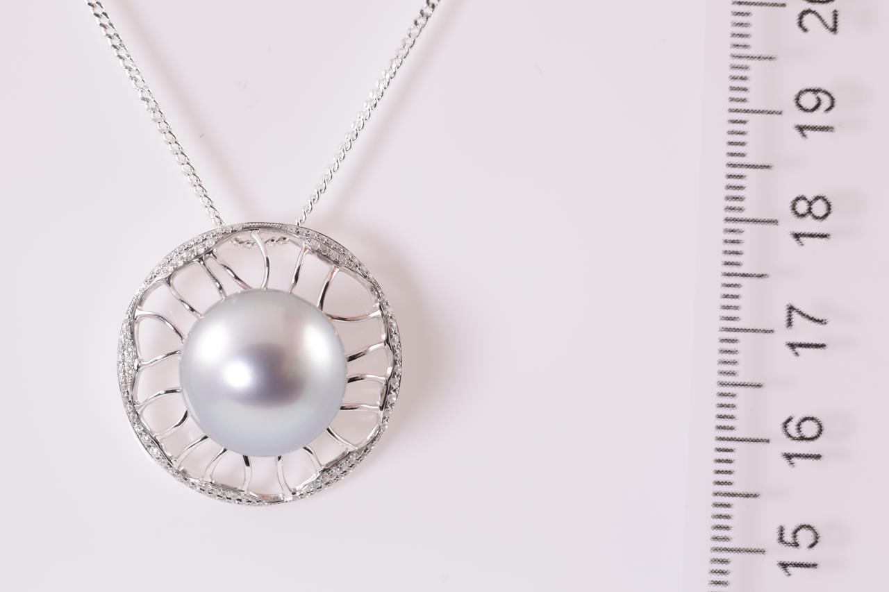 Pearl and Diamond Pendant with round blue tone South Sea Pearl of 15mm and round Diamonds totalling approximately 0.78cts (Estimated grading: I P1-2). 18ct white gold. Pendant weight: 7.9g. With display chain (base metal). (As New)