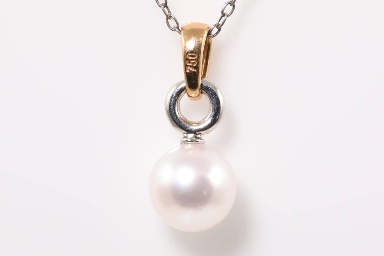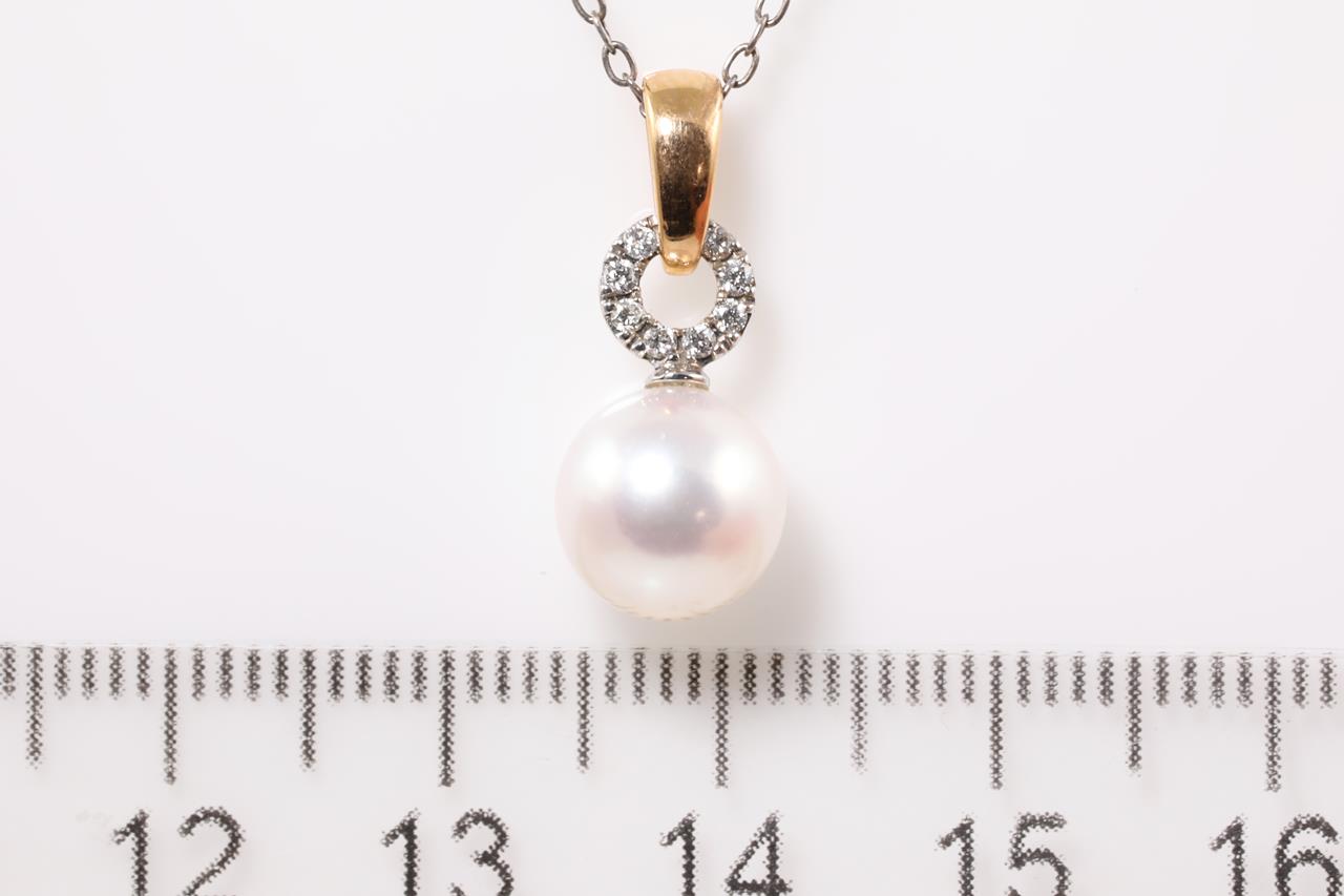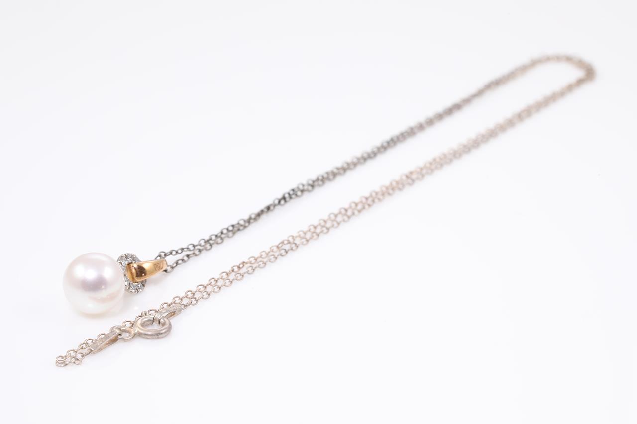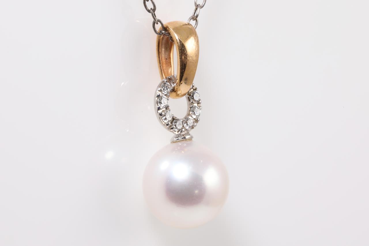 Pearl and Diamond Pendant with cultured Pearl of 8mm and round Diamonds totalling approximately 0.07cts. 18ct white and yellow gold. Pendant Weight 2.3g. With display chain base metal). (As New)