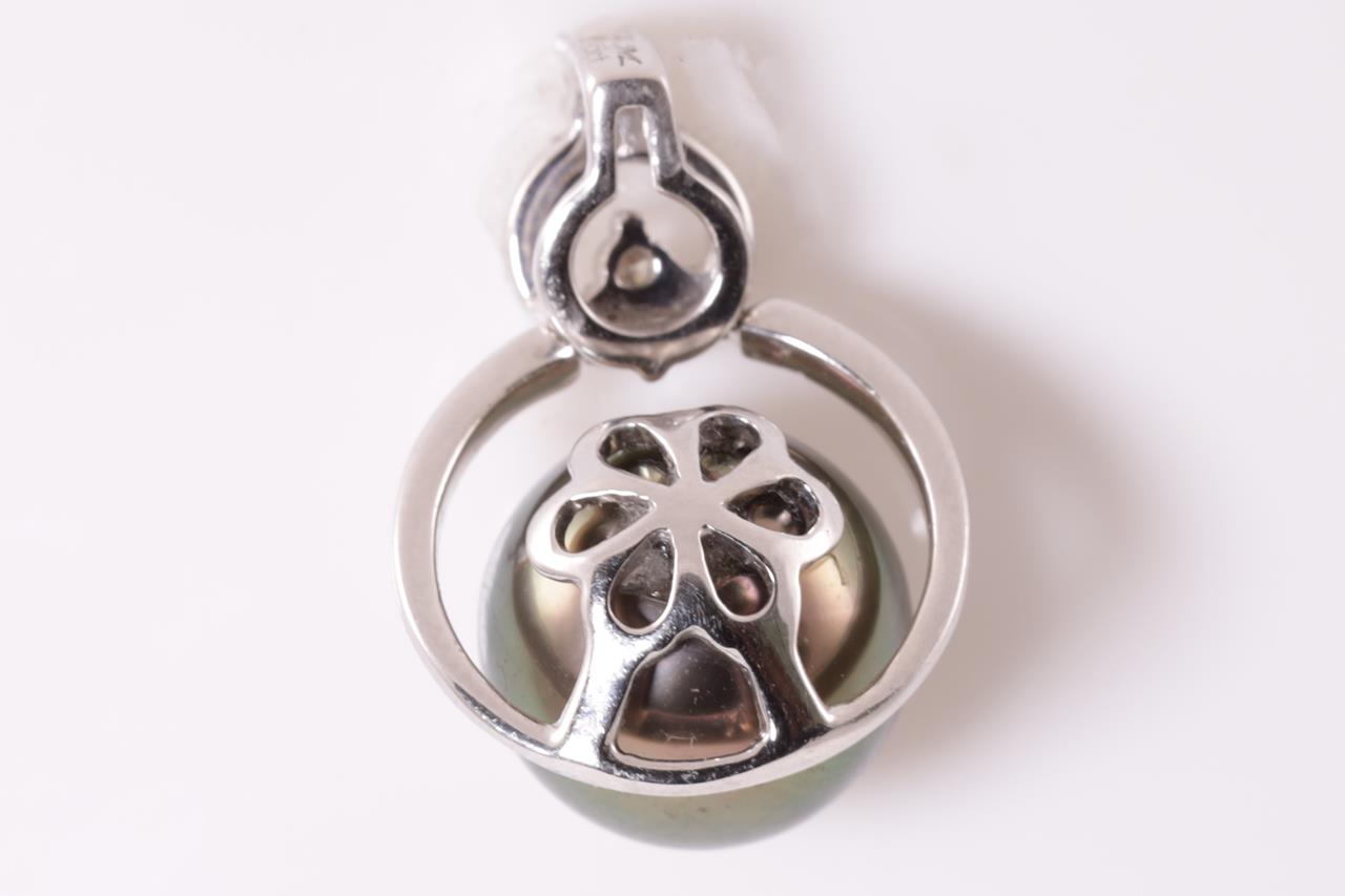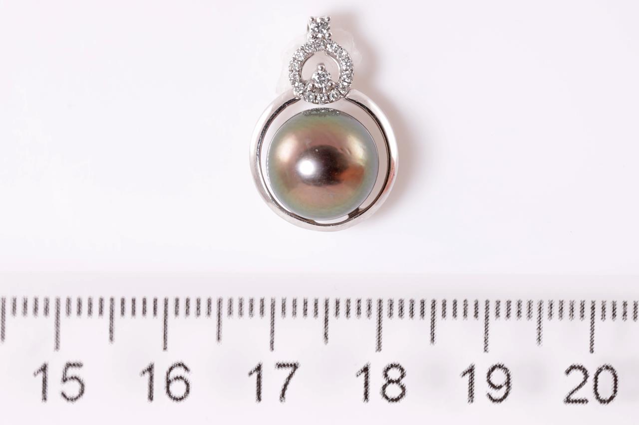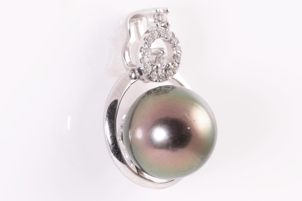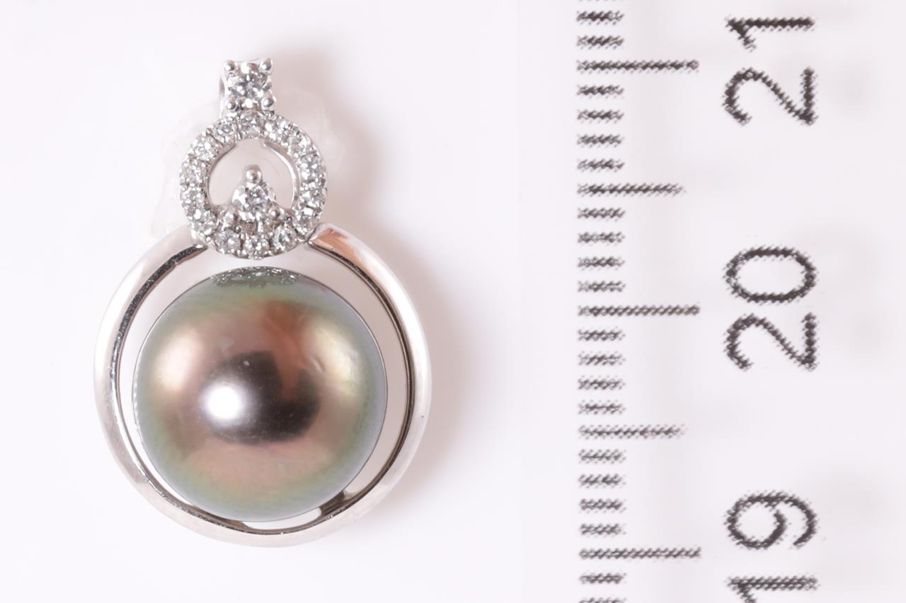 Pearl and Diamond Pendant with Tahitian pearl of 10mm and round Diamonds totalling approximately 0.11cts. 18ct white gold. No chain provided. Weight 5.3g. (As New)