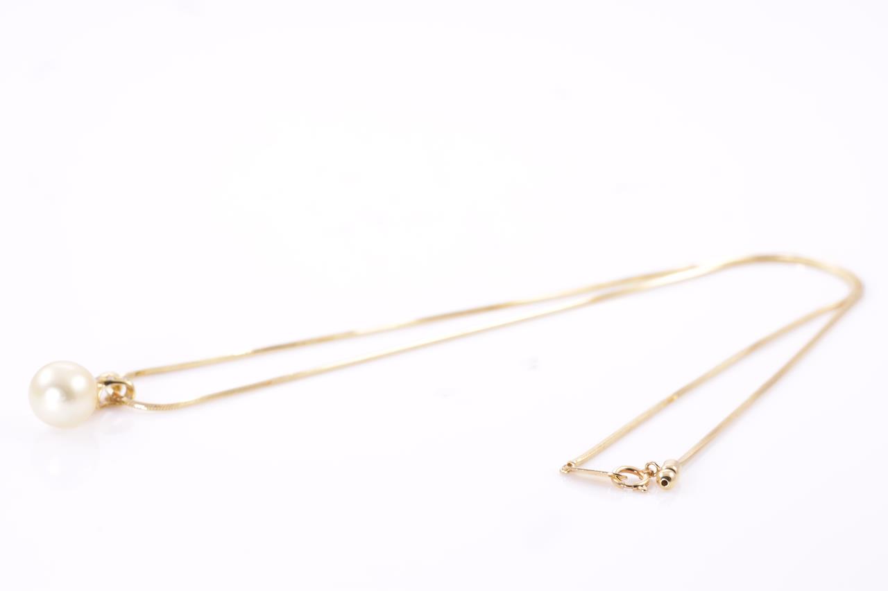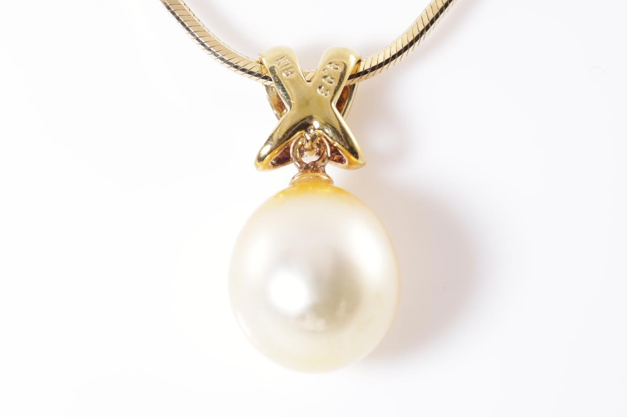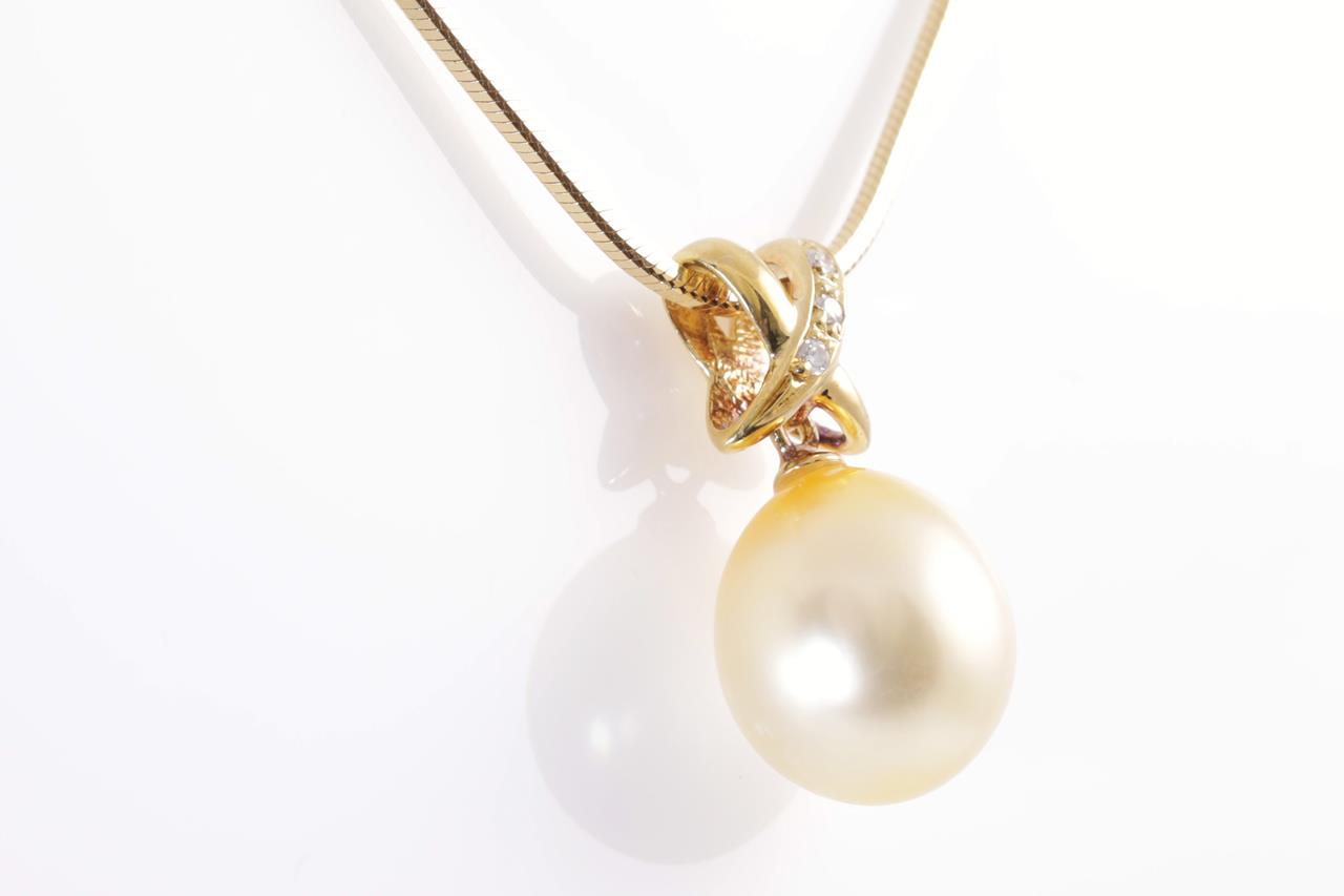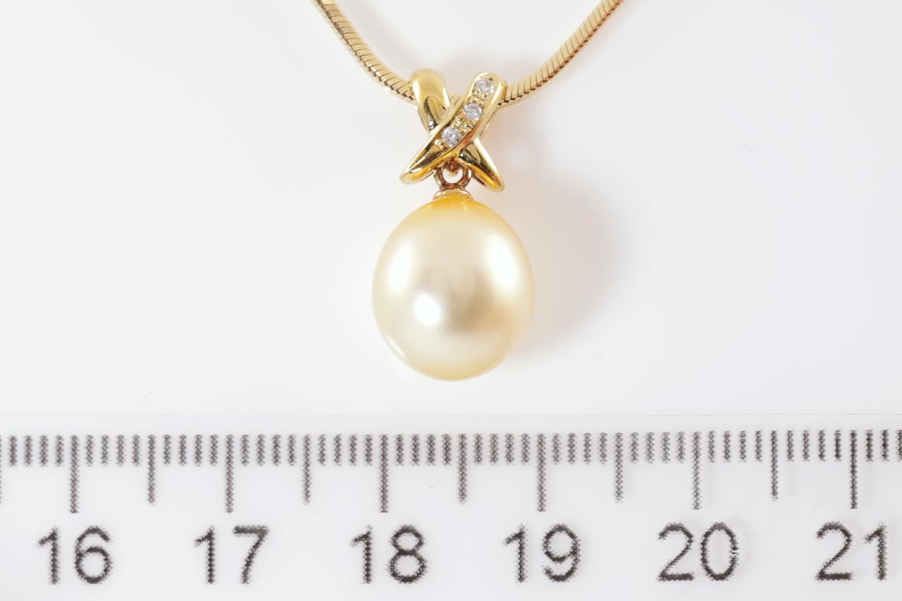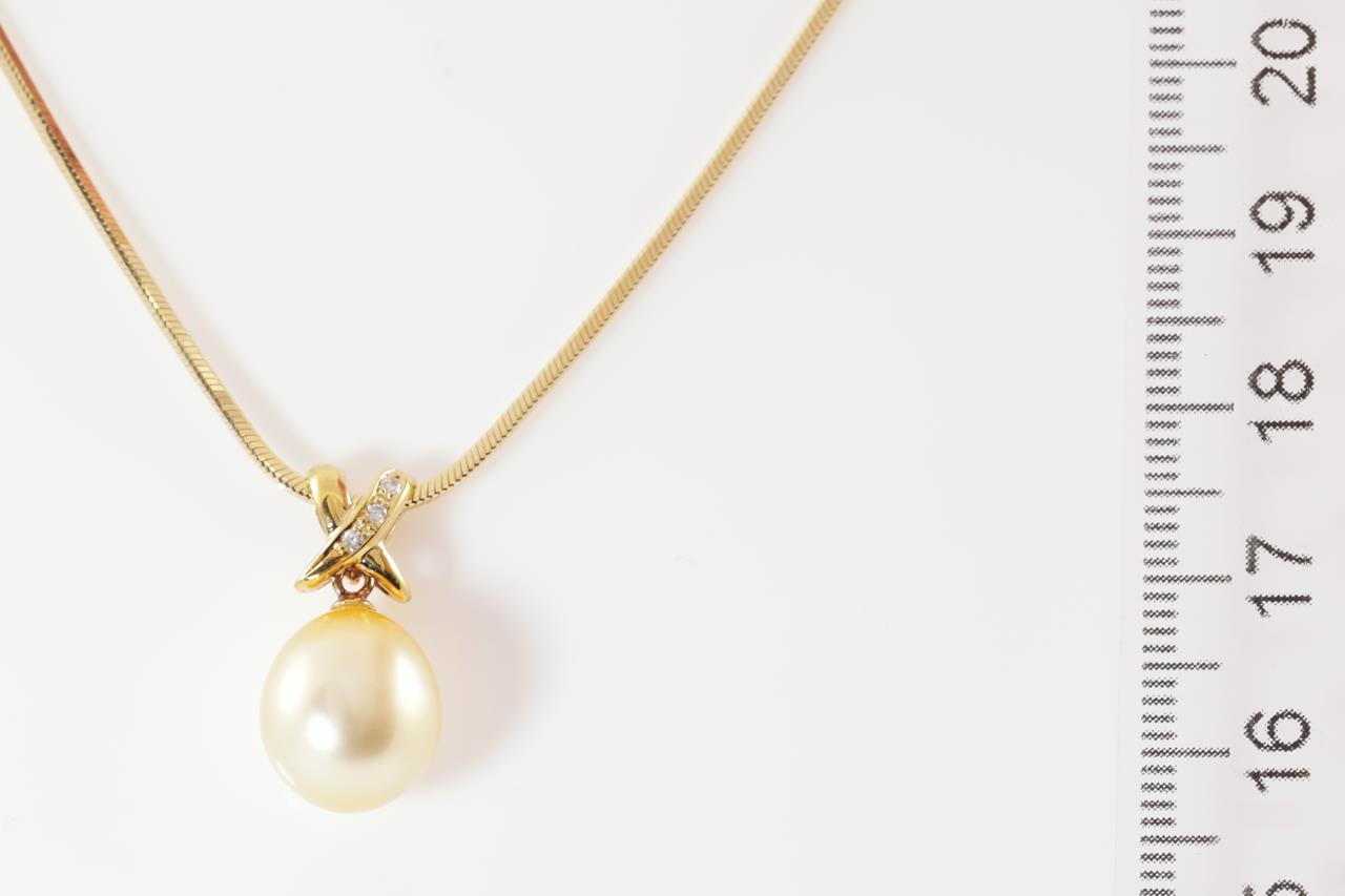 Pearl and Diamond pendant with an drop shape golden South Sea pearl of 10.4mm and Diamonds totalling 0.03cts. 18ct yellow gold with adjustable 50cm chain. Weight: 10.5g (Pre-owned)
