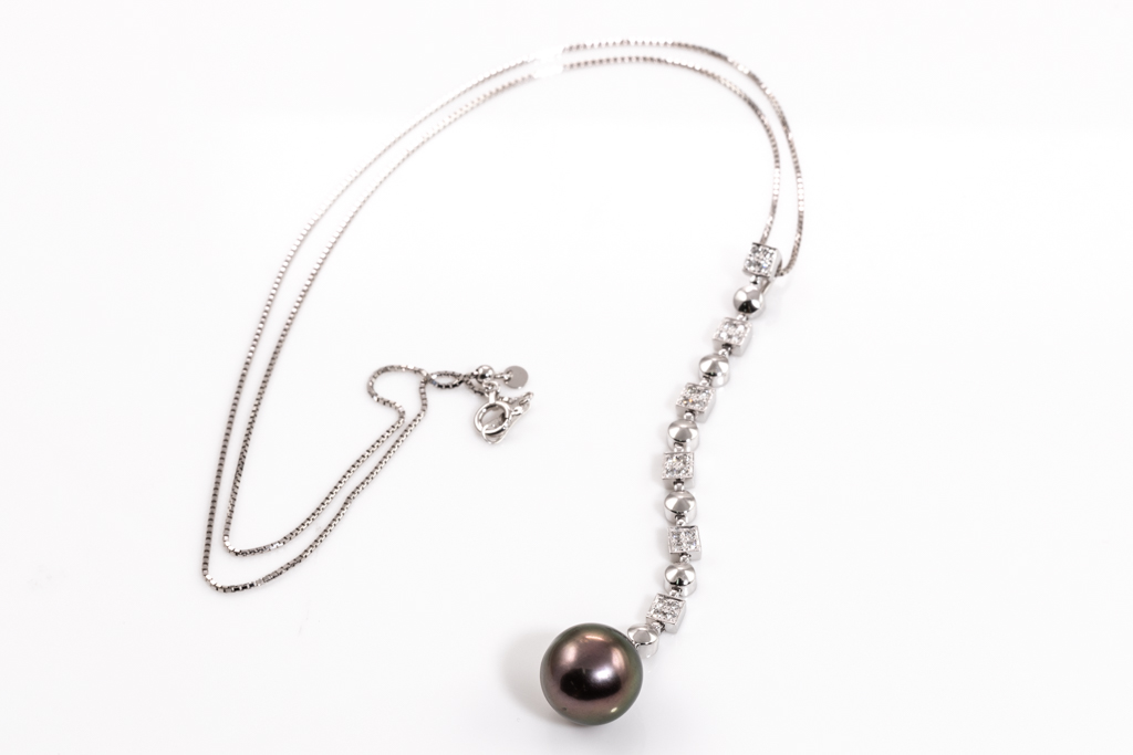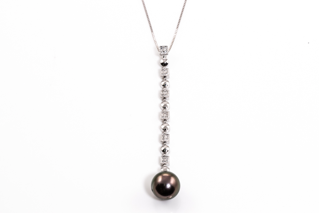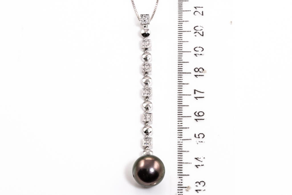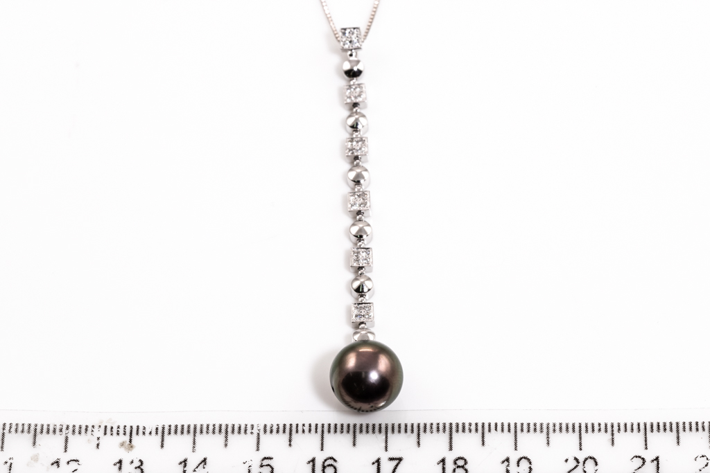 Pearl and Diamond pendant with Tahitian Pearl of 11.3mm and round Diamonds totalling 0.16cts. 18ct white gold with 44cm 18ct white gold adjustable chain. Weight: 7.3g. (Pre-owned)