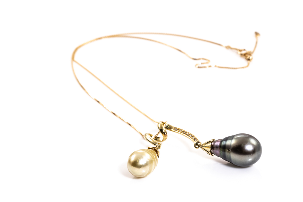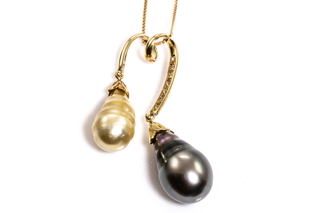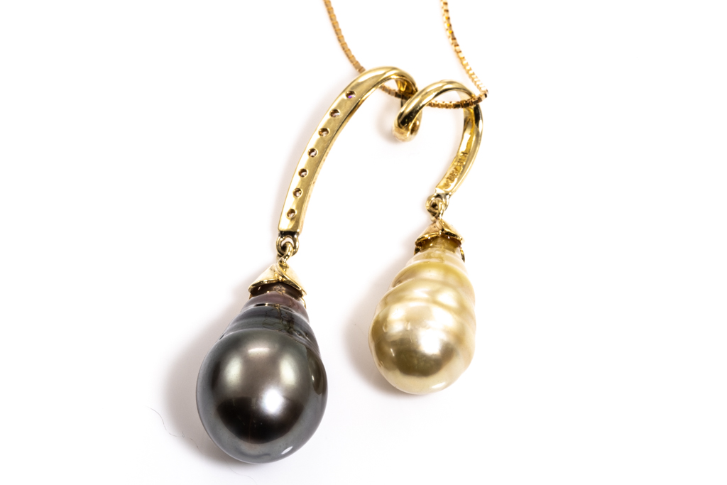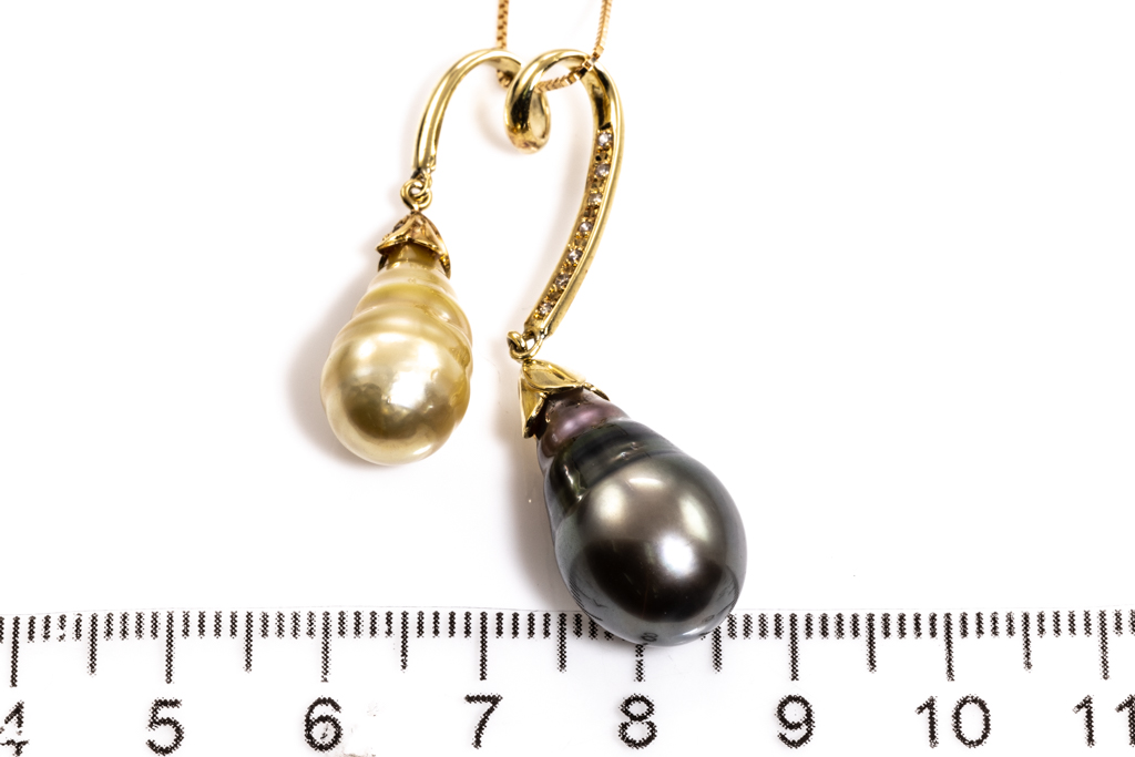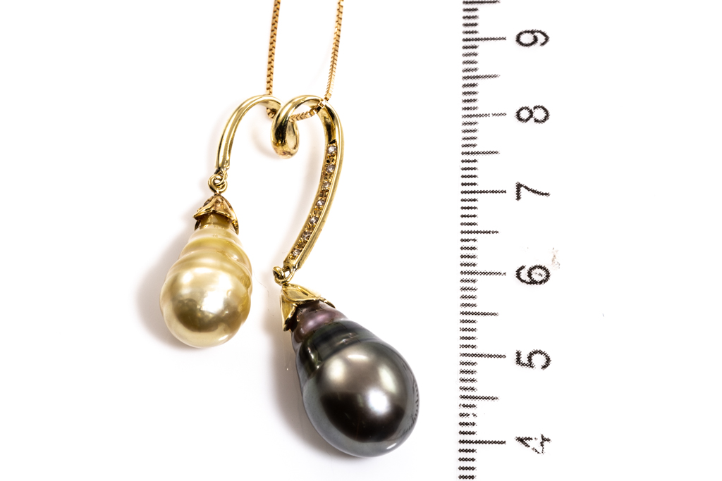 Pearl and Diamond pendant with drop shape Tahitian of 12mm, golden South Sea Pearl of 9.9mm and round Diamonds totalling 0.10cts. 18ct yellow gold with 44cm adjustable chain. Weight: 9.9g. (Pre-owned)