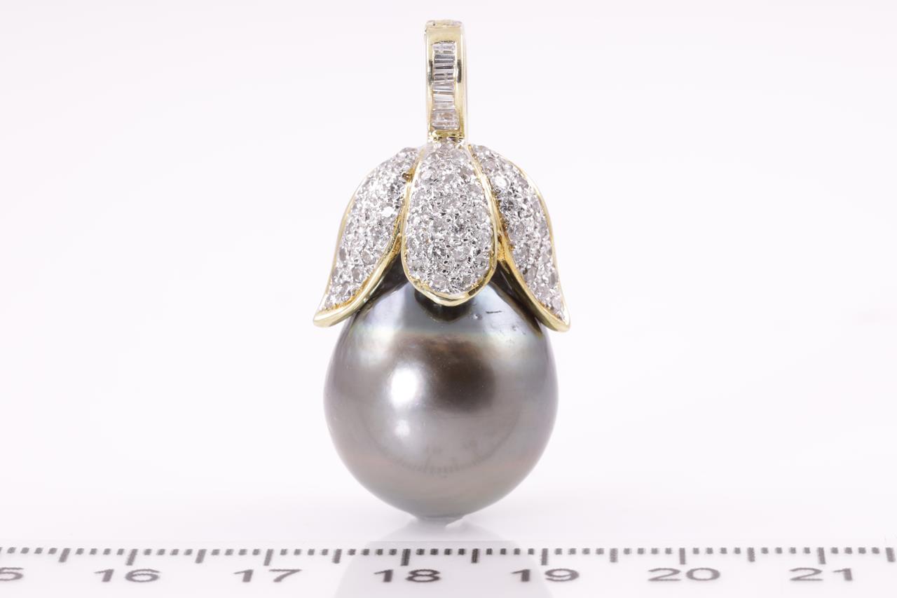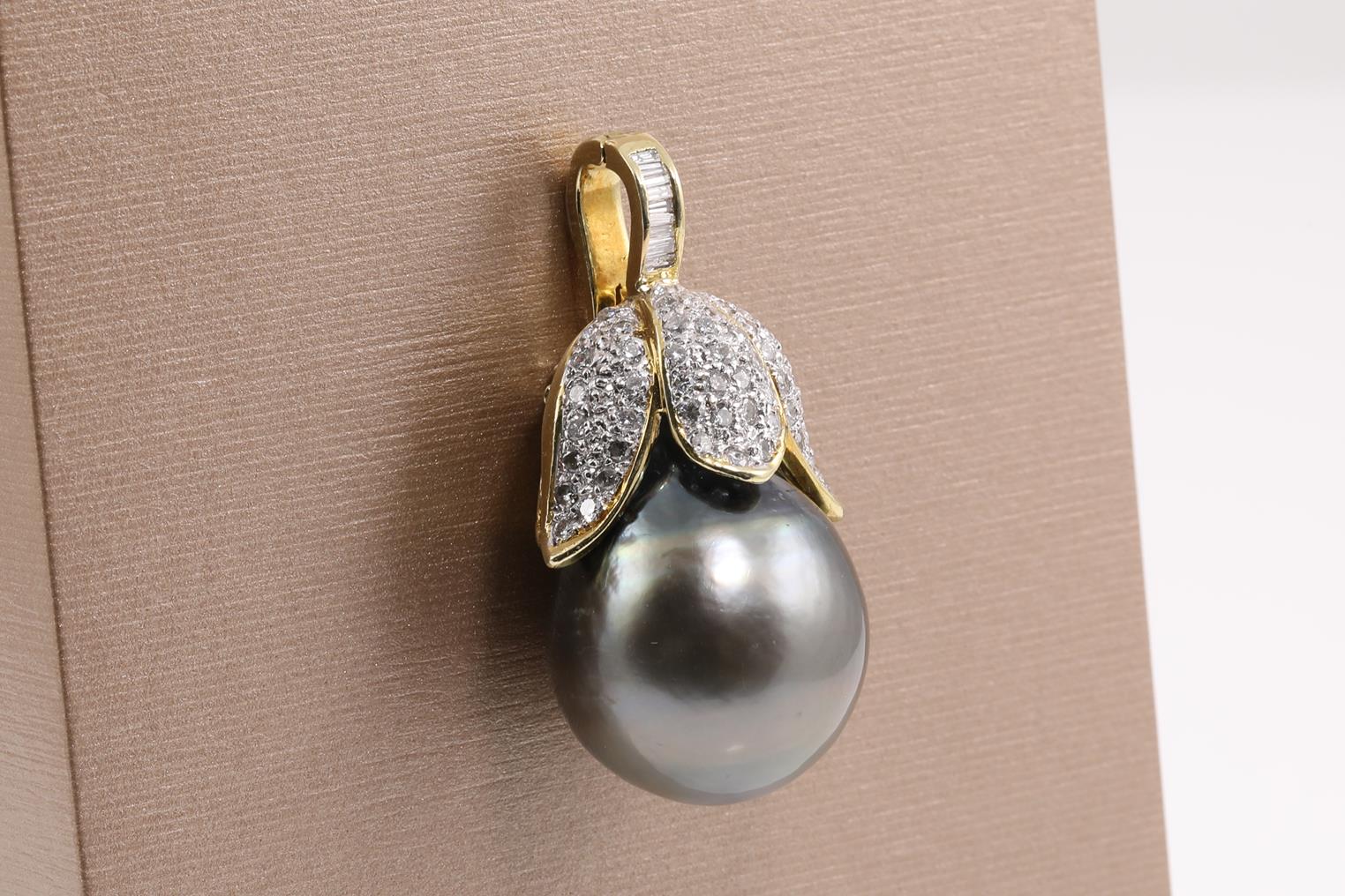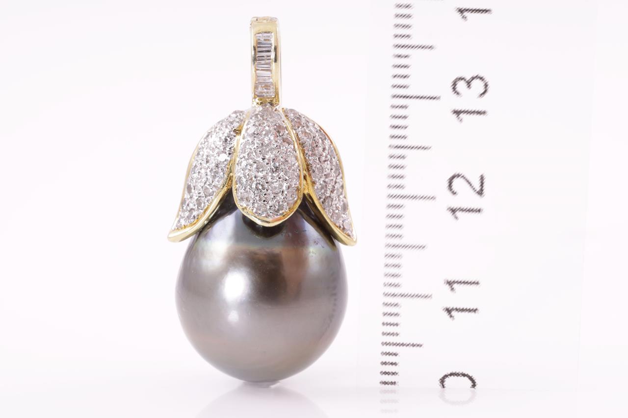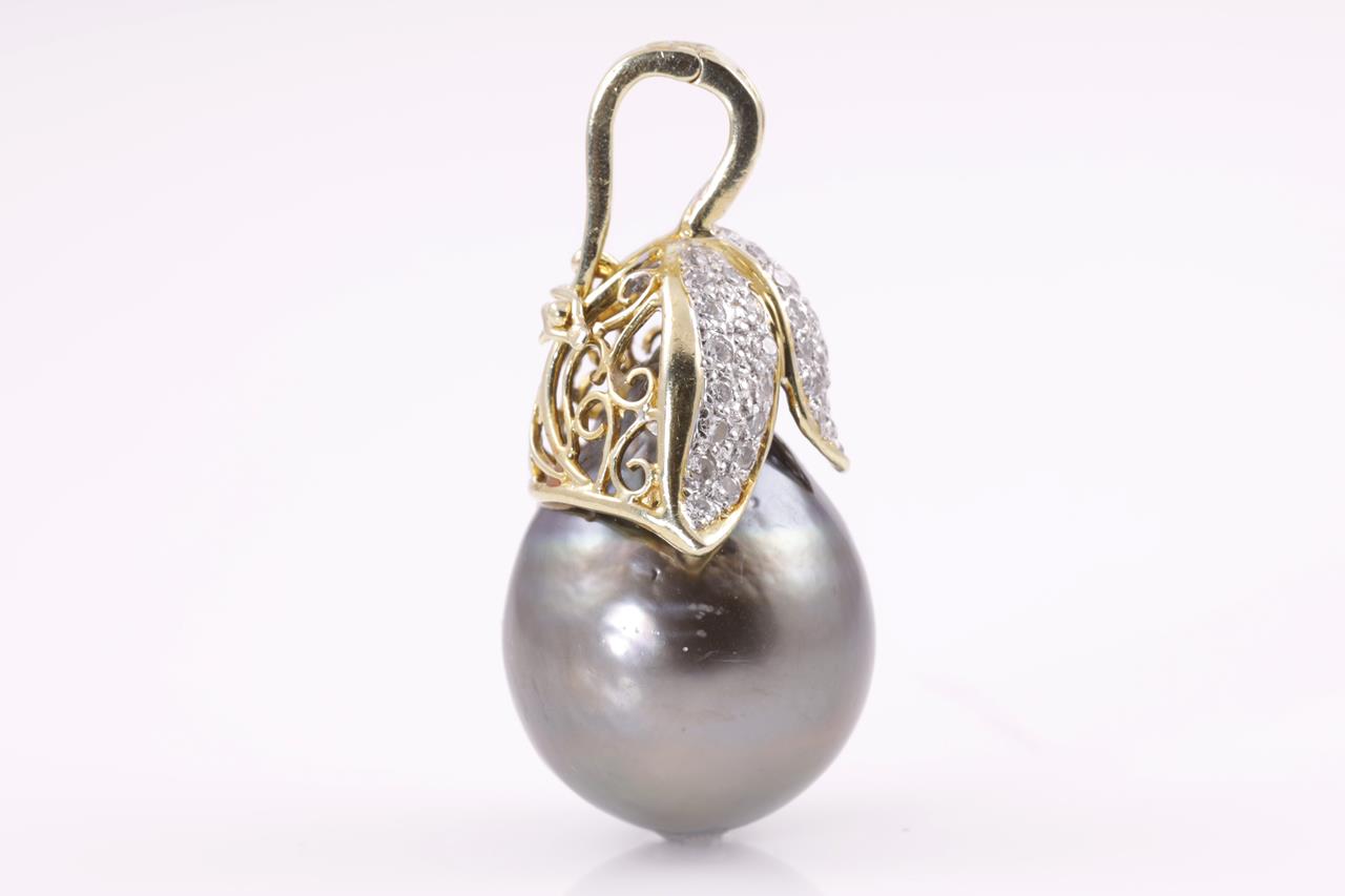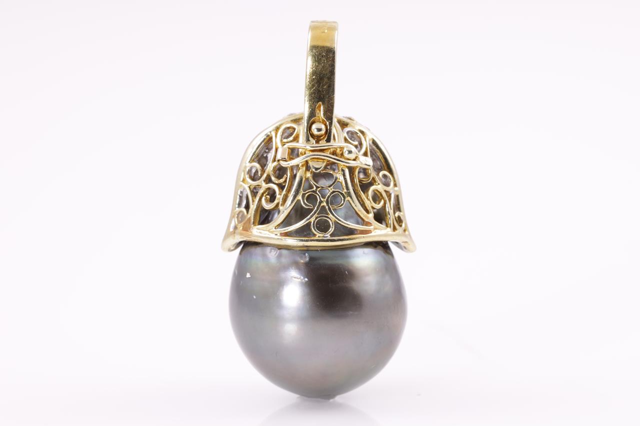 Pearl and Diamond Pendant/Enhancer with drop shaped Tahitian Pearl of 17.5mm and round Diamonds totalling approximately 0.60cts (Estimated grading : I-J SI-P1). 18ct yellow gold. Weight 14.6g. (Pre-owned)
