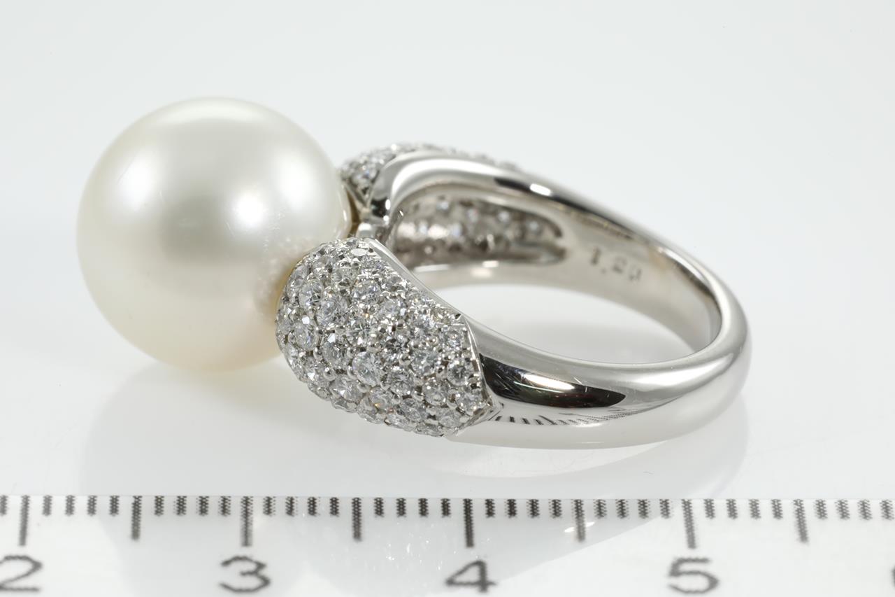 Pearl and Diamond ring with South Sea Pearl of 13.0mm and round Diamonds totalling 1.20cts (Estimated grading: H SI). Platinum. Ring size L - can only be resized up or down by a maximum of 3 sizes. (Pre-owned)