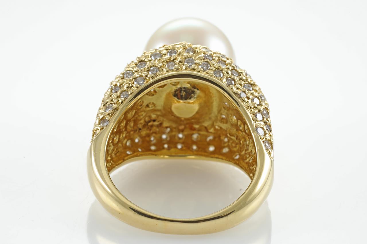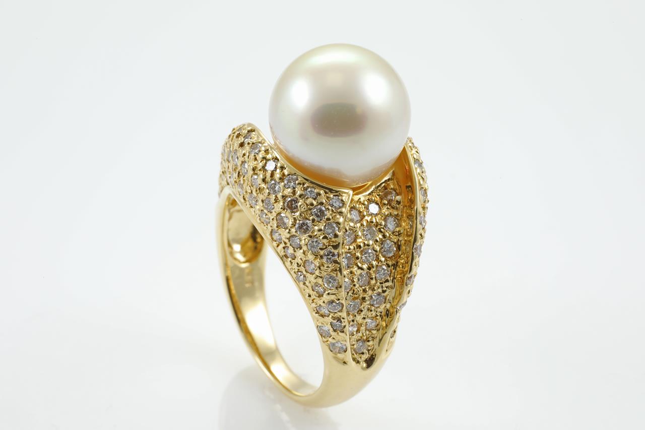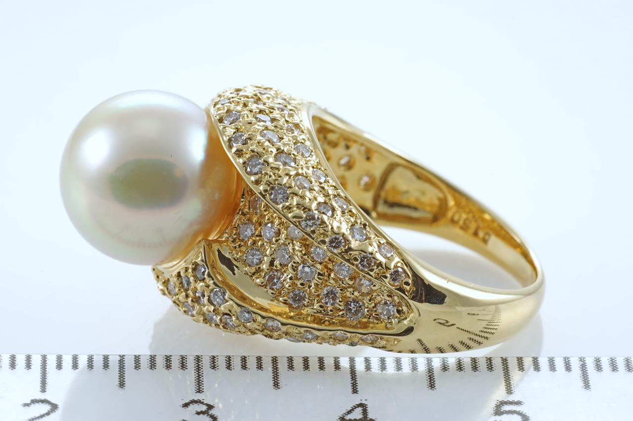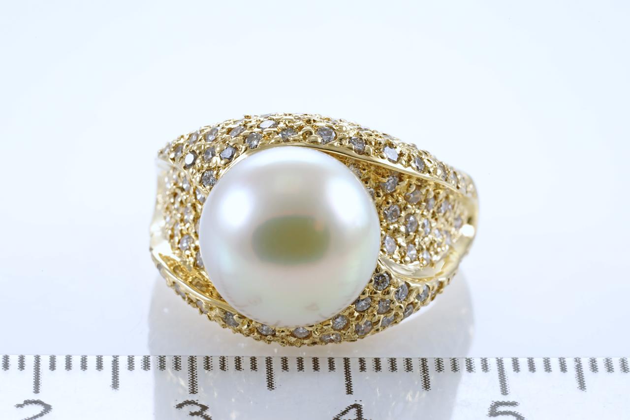 Pearl and Diamond ring with a South Sea Pearl of 11.7mm and Diamonds totalling 1.50cts (Estimated grading: H SI). 18ct yellow gold. Ring size N. Weight: 14.3g. (Pre-owned)