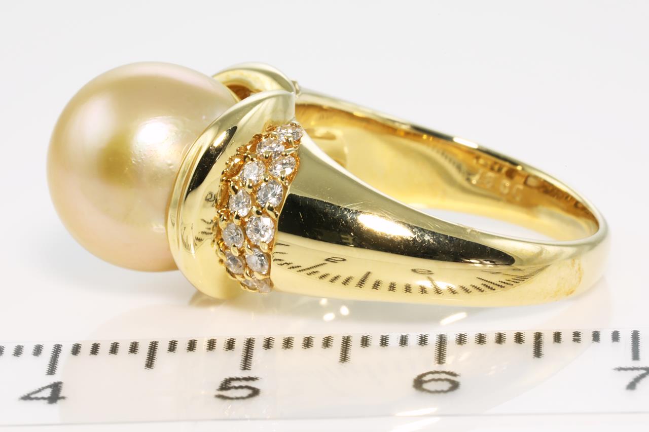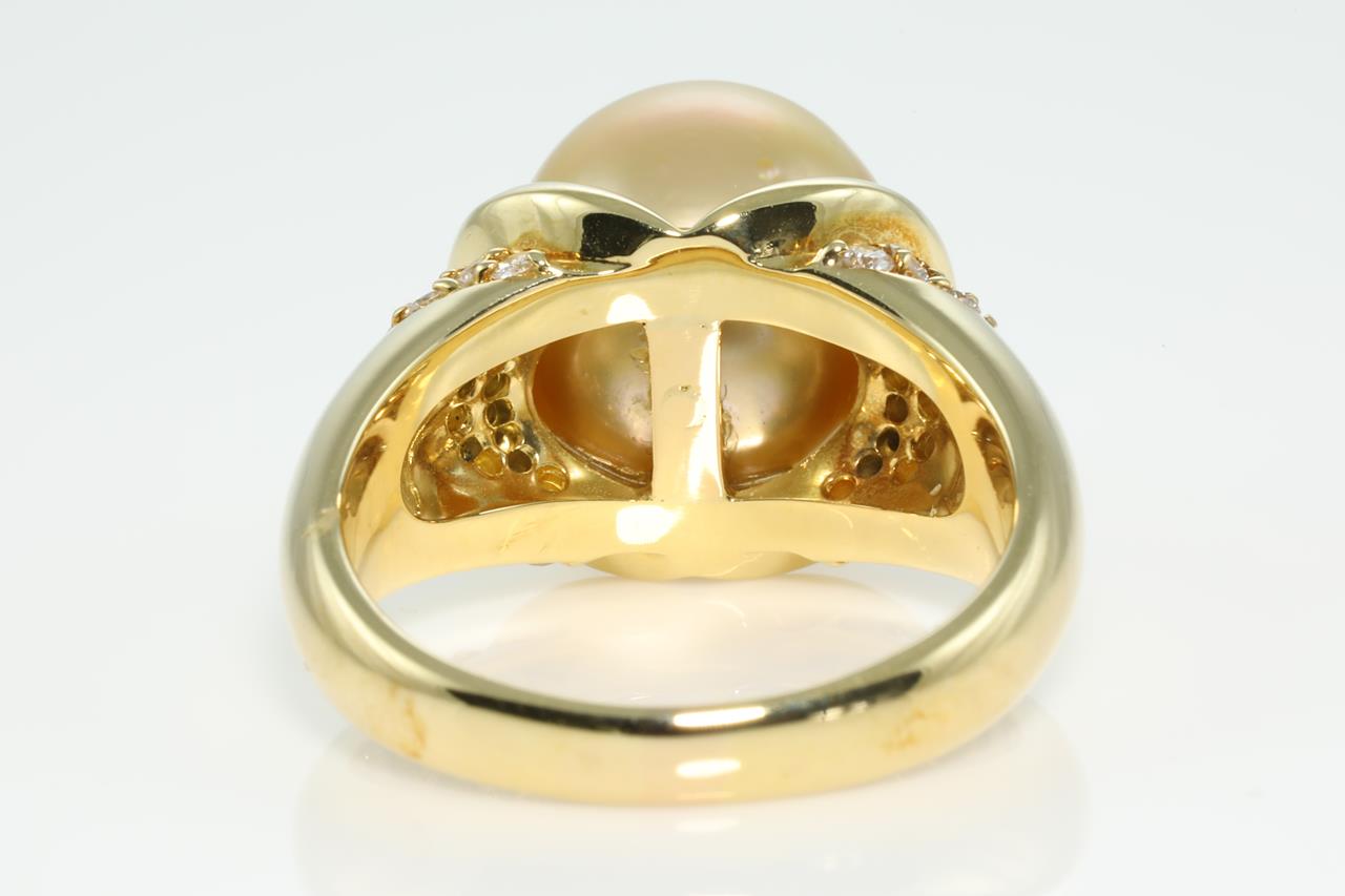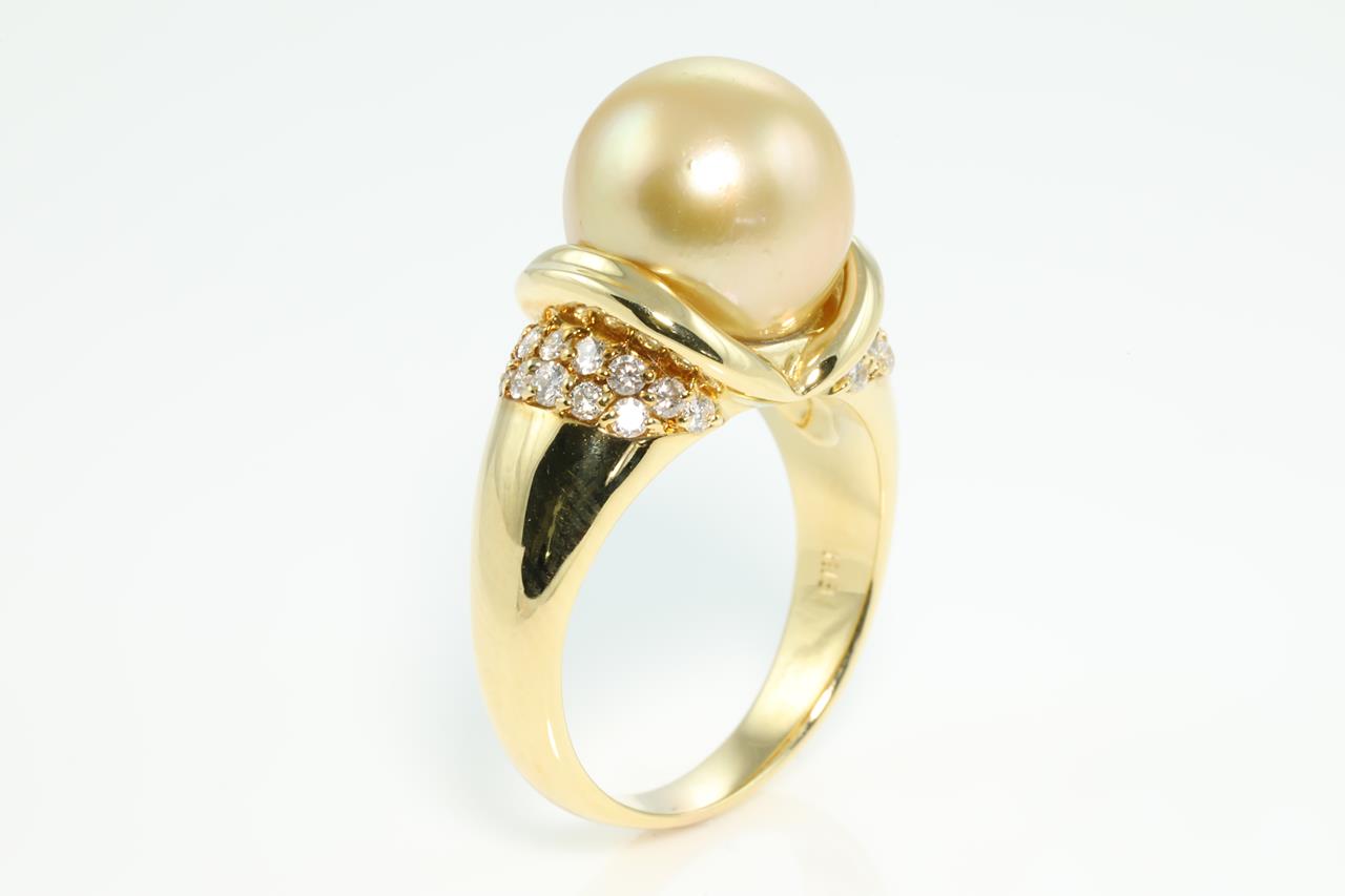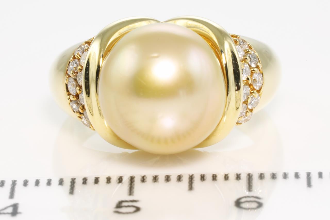 Pearl and Diamond ring with light Golden South Sea Pearl of 11.0mm and Diamonds totalling 0.37cts (Estimated grading: G-H VS). 18ct yelow gold. Ring size: N - Note resizing is not recommended. Weight: 12.2g (Pre-owned)