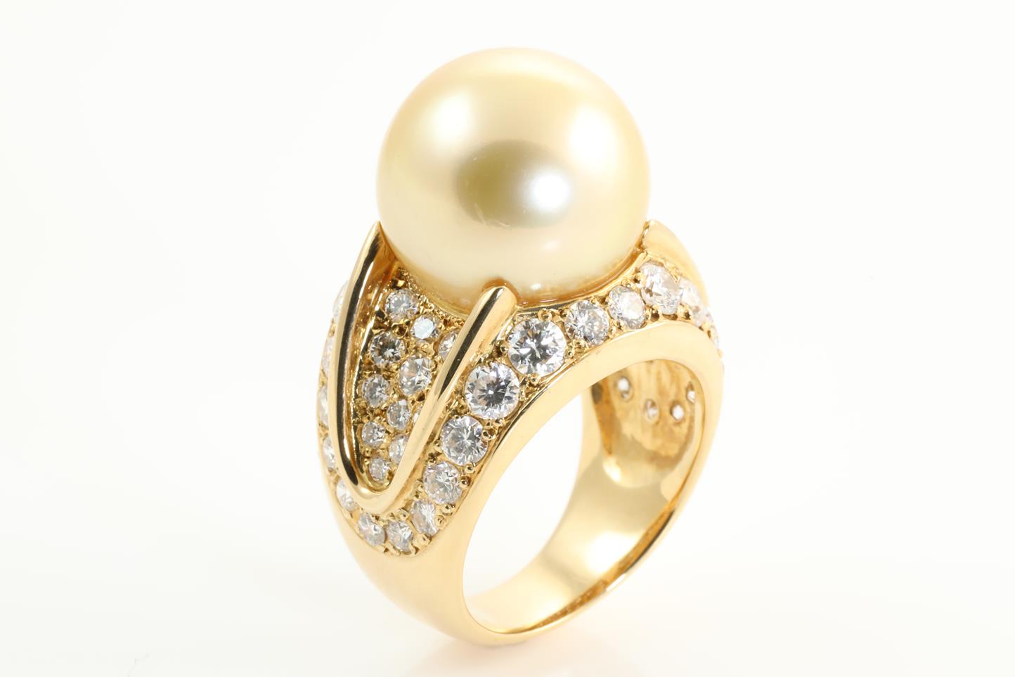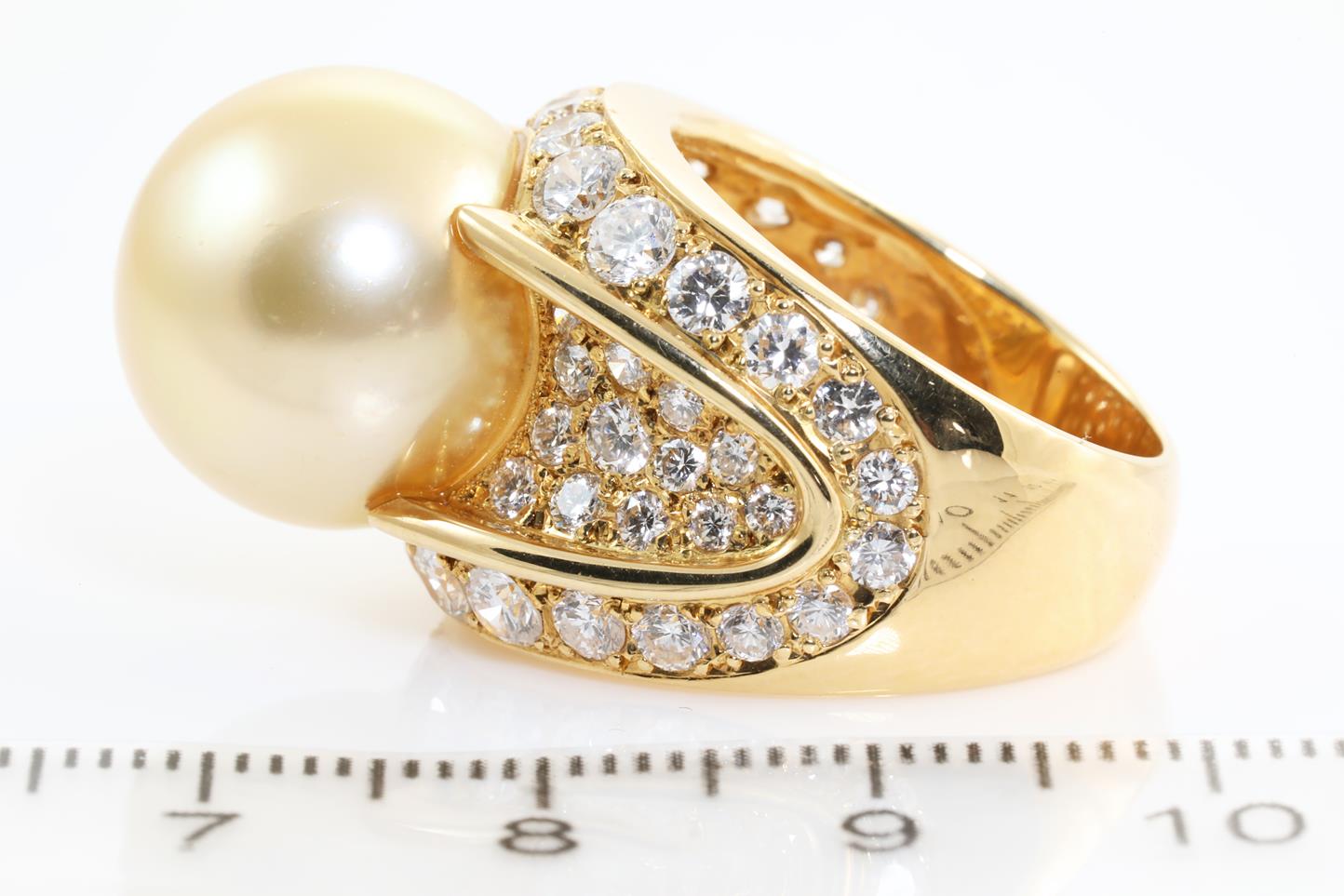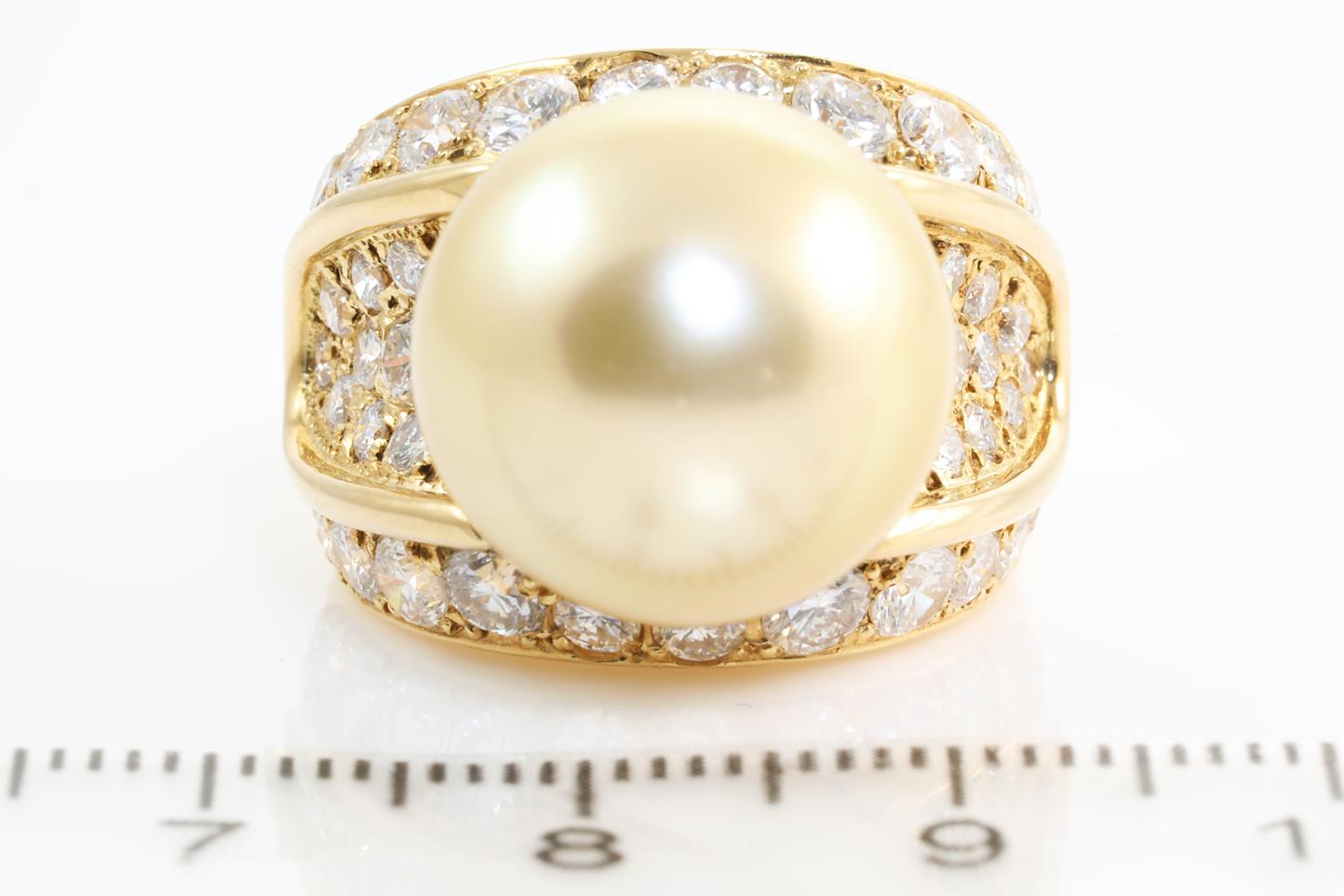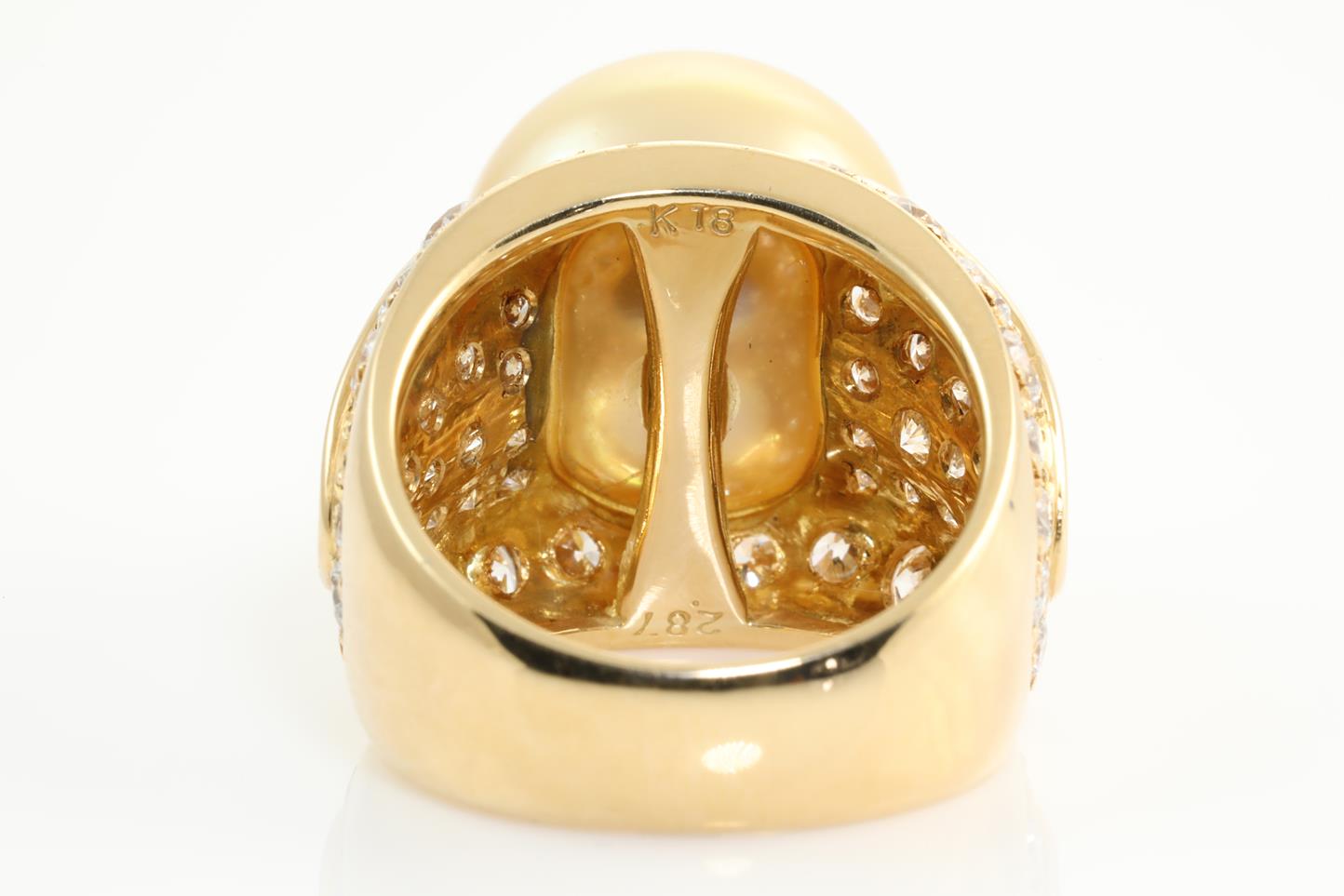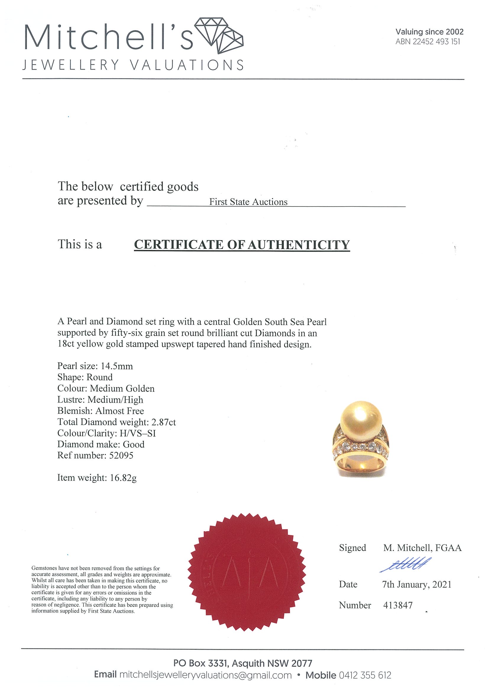 Pearl and Diamond ring with a Golden South Sea Pearl of 14.5mm and round Diamonds totalling 2.87cts (Estimated Grading: H VS-SI). 18ct yellow gold. Ring size M1/2 - ring resizing up is not recommended, can only be resized down with ring clip. Weight: 16.8g. With certificate #413847 (Pre-owned)