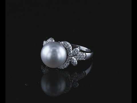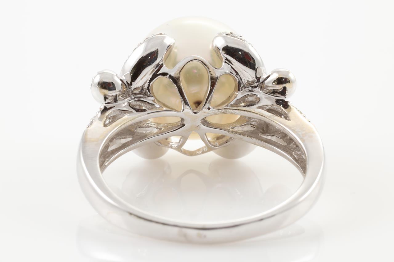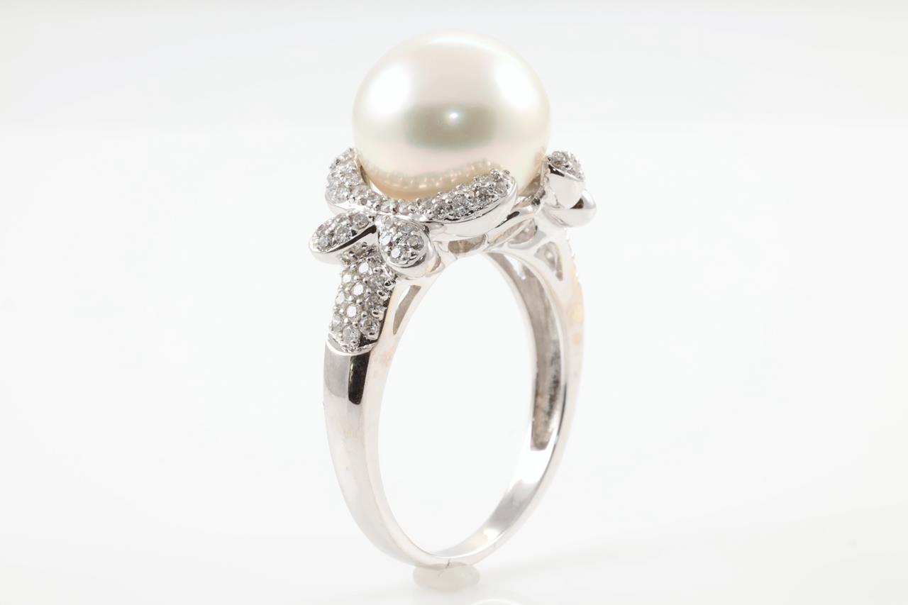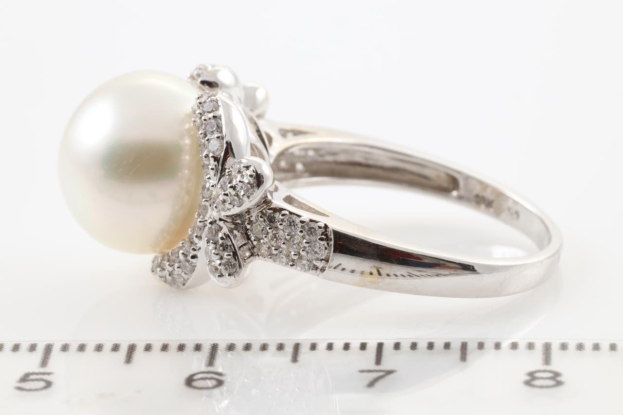 Pearl and Diamond ring with South Sea Pearl of 11.7mm and round Diamonds totalling approximately 0.55cts (estimated grading: I-J SI). 18ct white gold. Ring size P. Weight: 7.5g (Pre-owned)