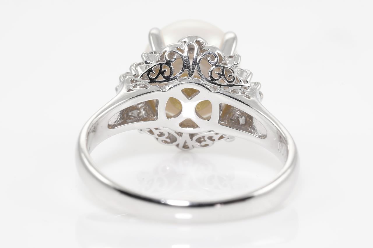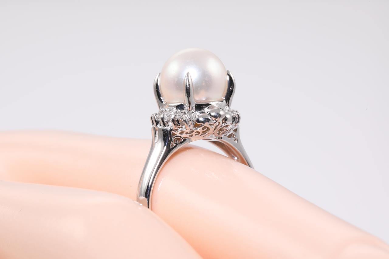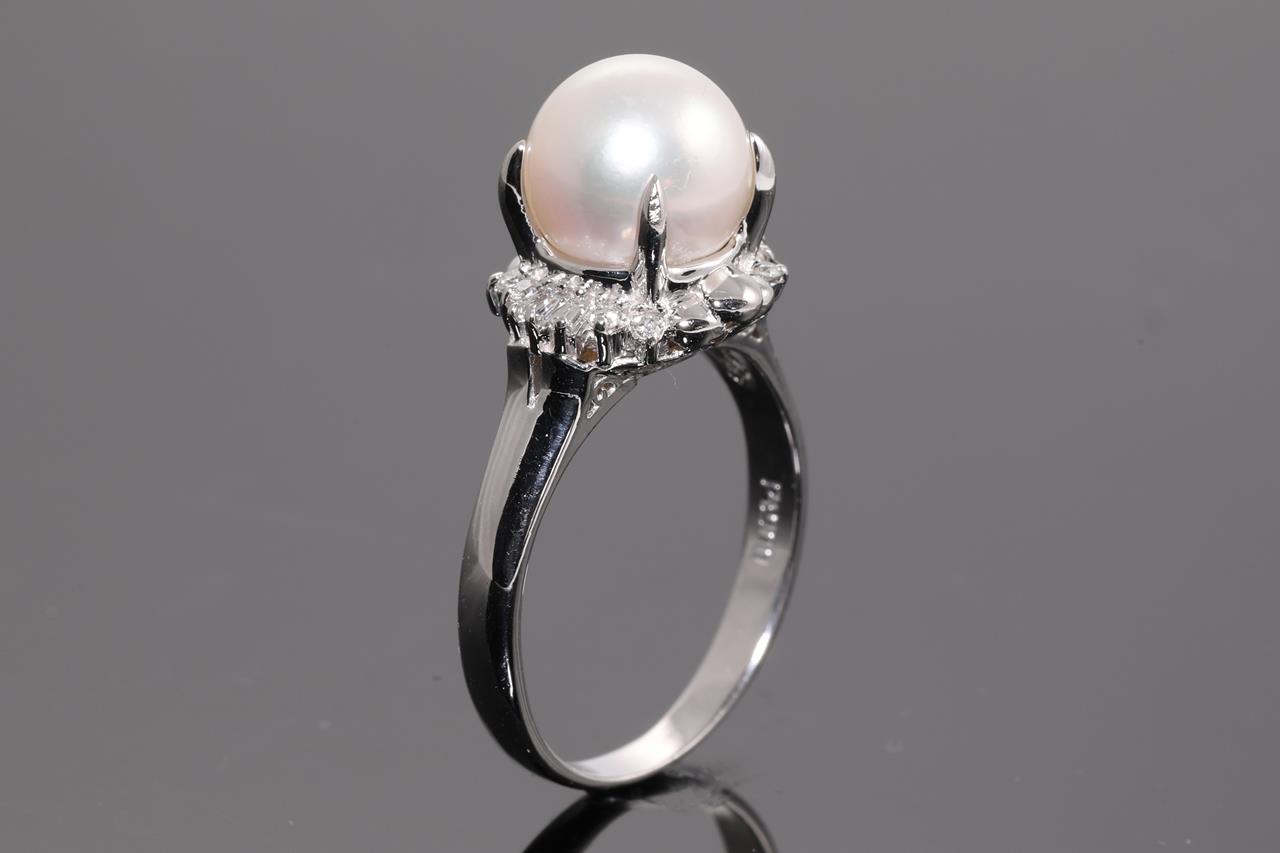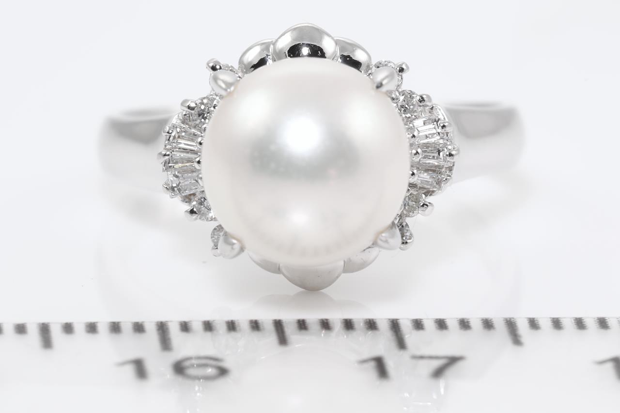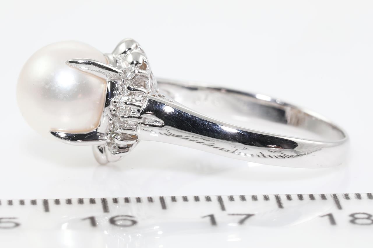 Pearl and Diamond ring with a Akoya Pearl of 9mm and Diamonds totalling 0.16cts. Platinum. Ring size M. Weight: 6.2g (Pre-owned)