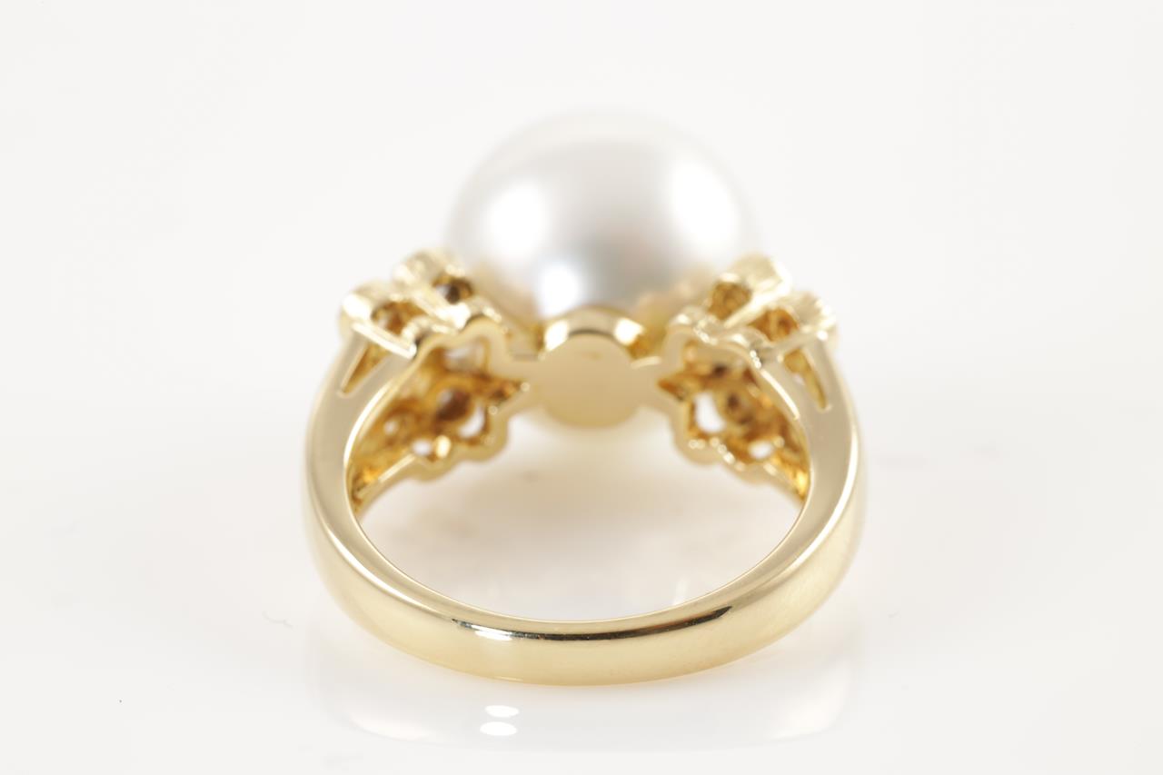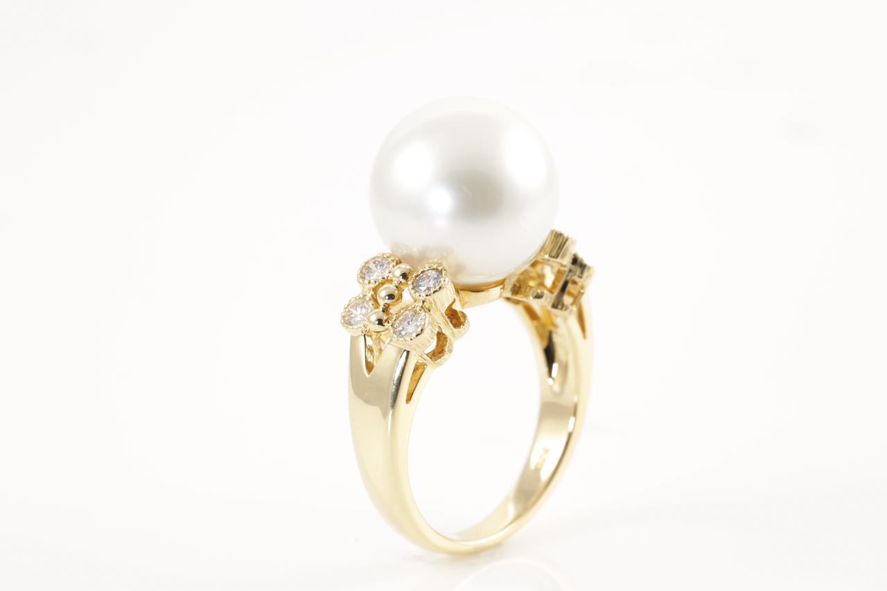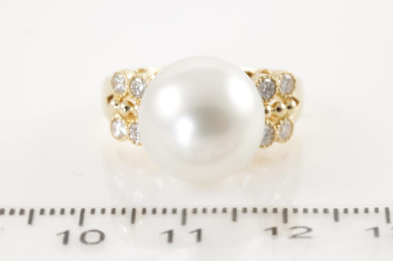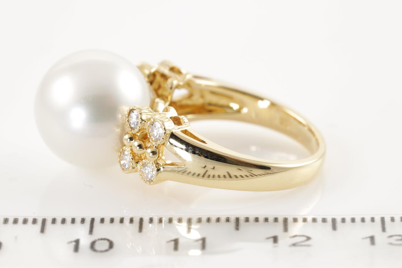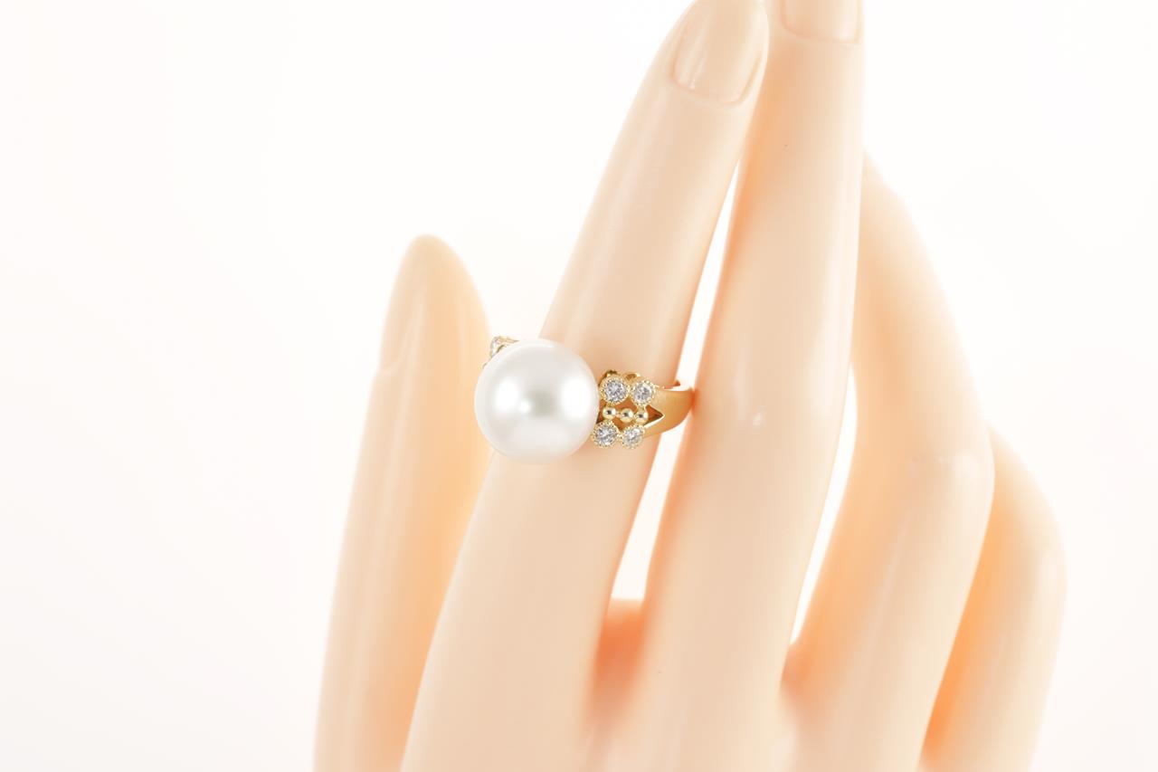 Pearl and Diamond ring with South Sea Pearl of 13.0mm and 8 round cut Diamonds totalling 0.31cts (Estimated grading: H VS-SI). 18ct yellow gold. Ring size M - can be resized up, down by ring clip. Weight: 9.0g (Pre-owned)