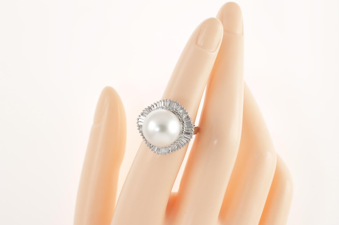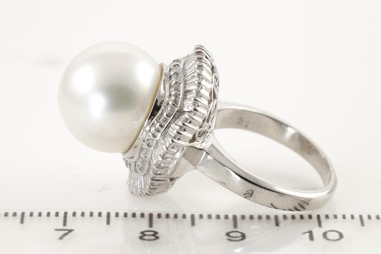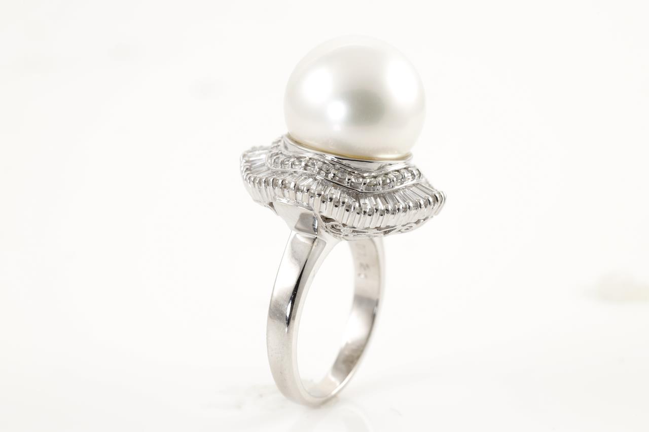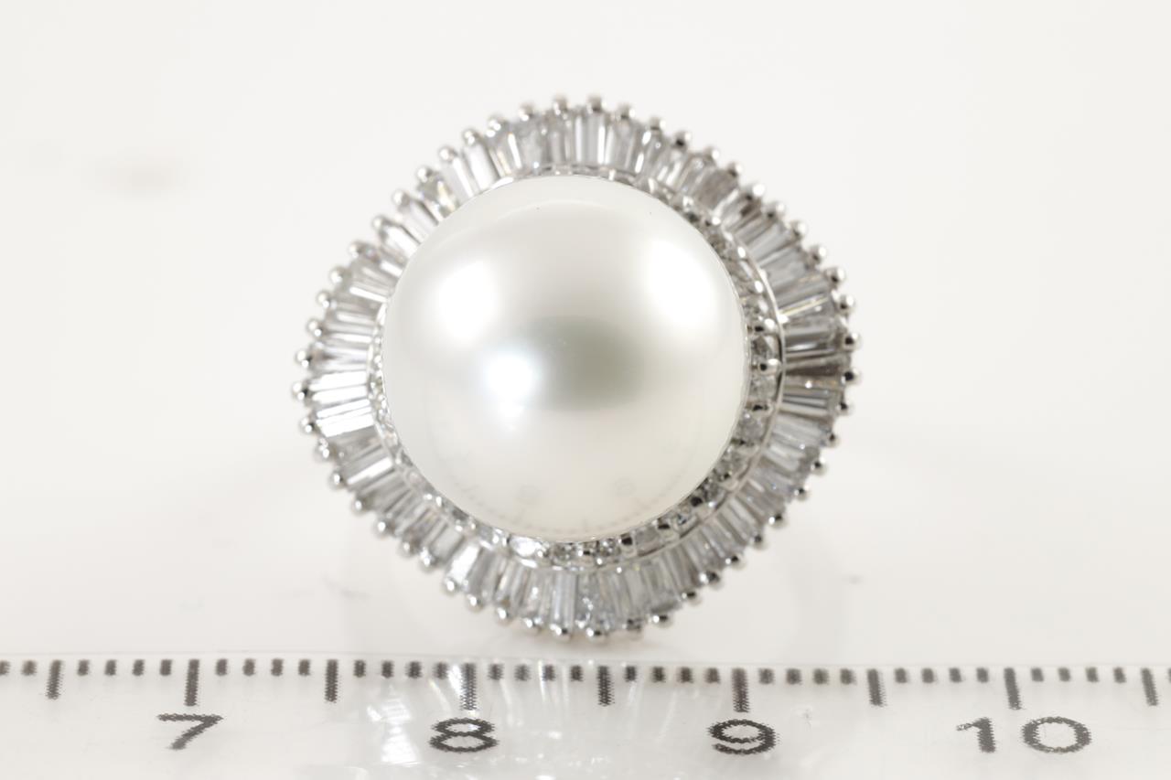 Pearl and Diamond ring with South Sea Pearl of 13.5mm with round and baguette cut Diamonds totalling 1.21cts (Estimated grading: G-H VS-SI). Platinum. Ring size J1/2. Weight: 16.1g (Pre-owned)