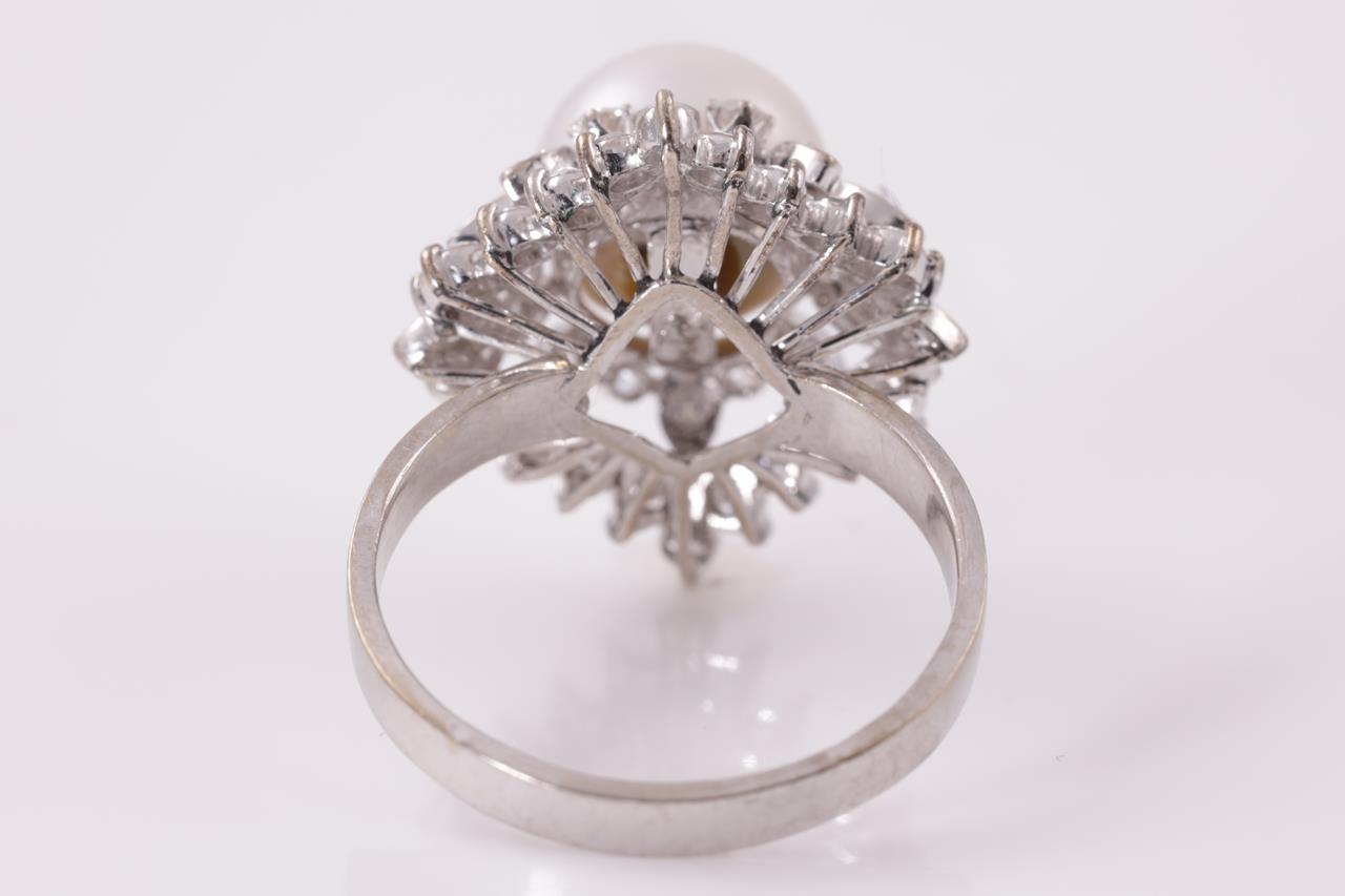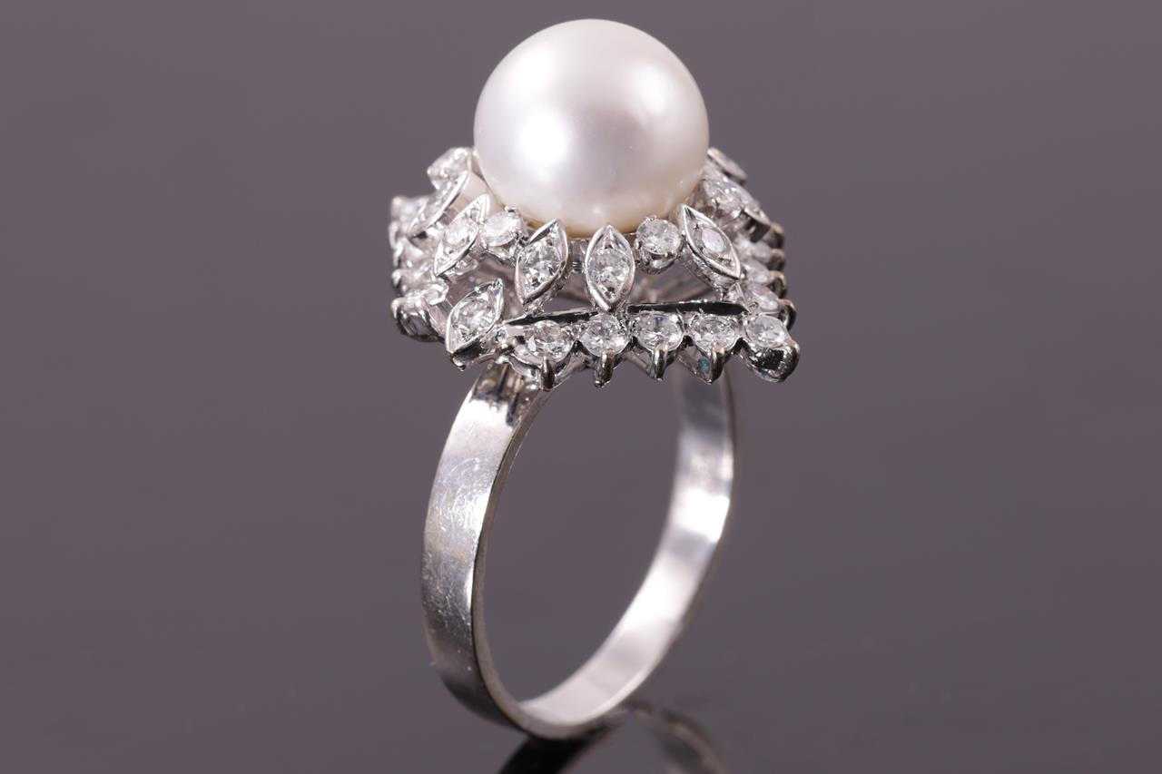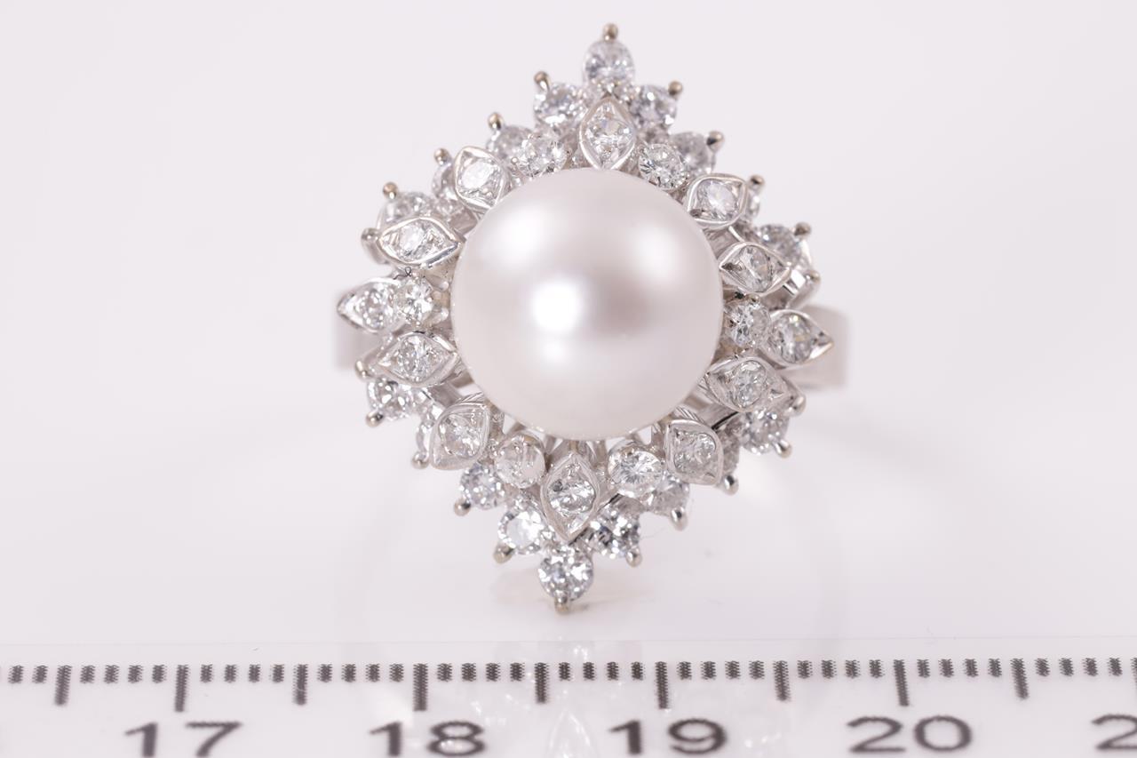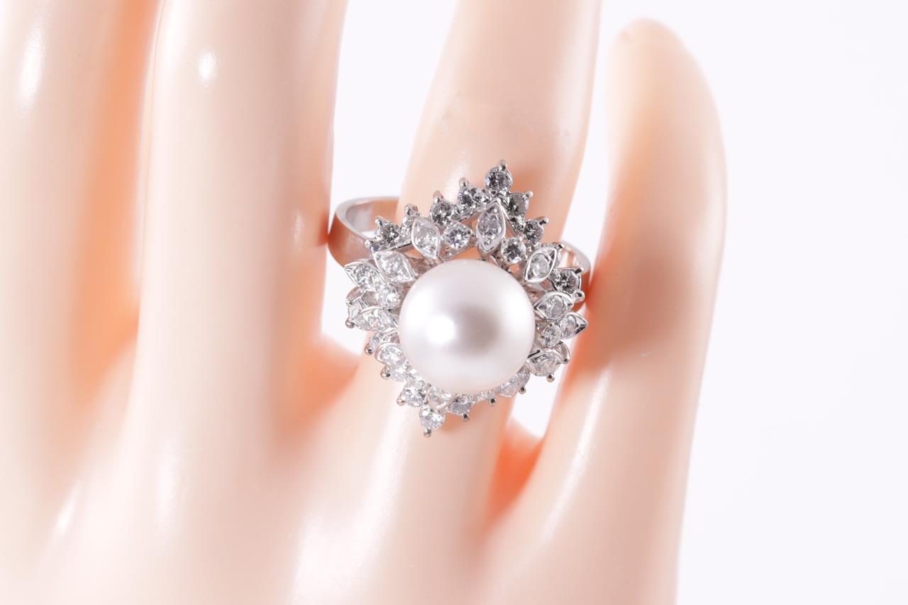 Pearl and Diamond Ring with white cultured Pearl of 11.3mm and 36 round Diamonds totalling approximately 1.08cts. (estimated grading: H SI). 14ct white gold. Ring size U1/2. Weight 9.7g. (Pre-owned)