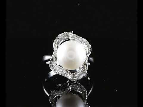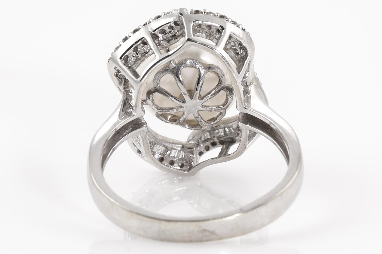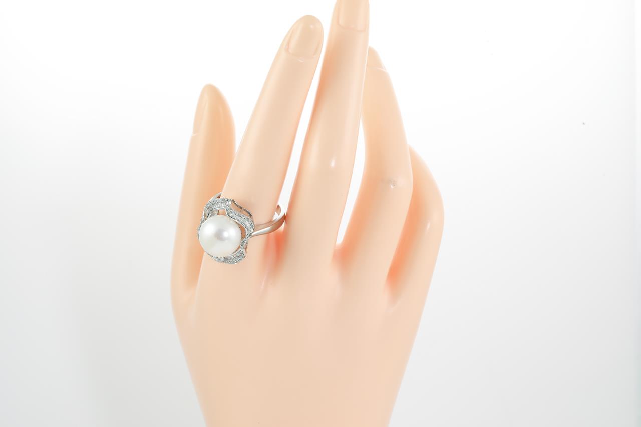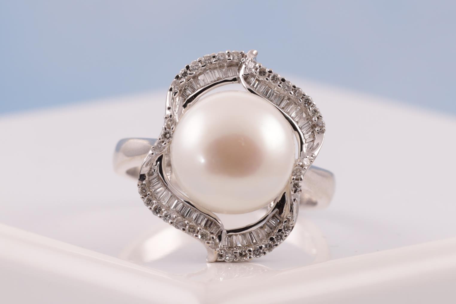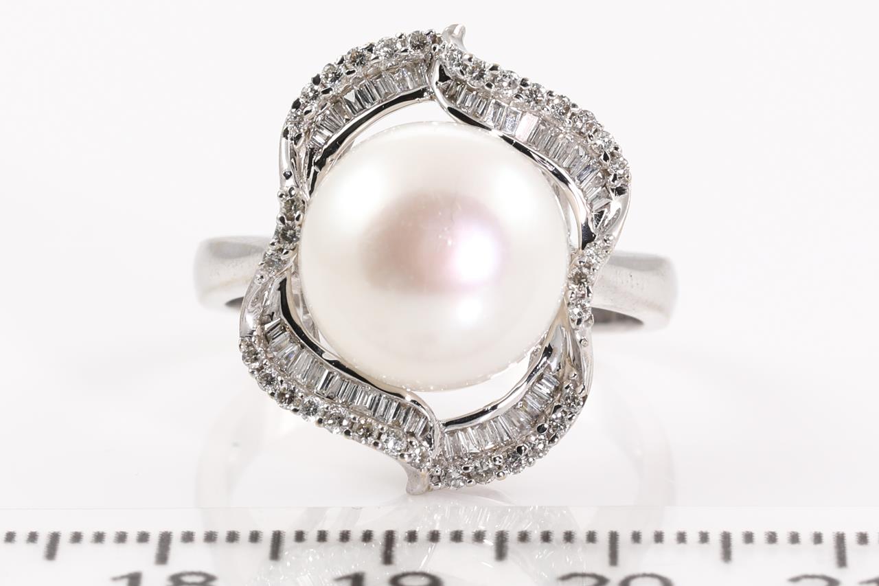 Pearl and Diamond Ring with centre button shaped white cultured Pearl of 12mm with round and baguette cut Diamonds totalling approximately 0.60cts. (Estimated grading: G-I SI-P1) 14ct white gold. Ring size T1/2. Weight 7.7g. (Pre-owned)