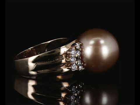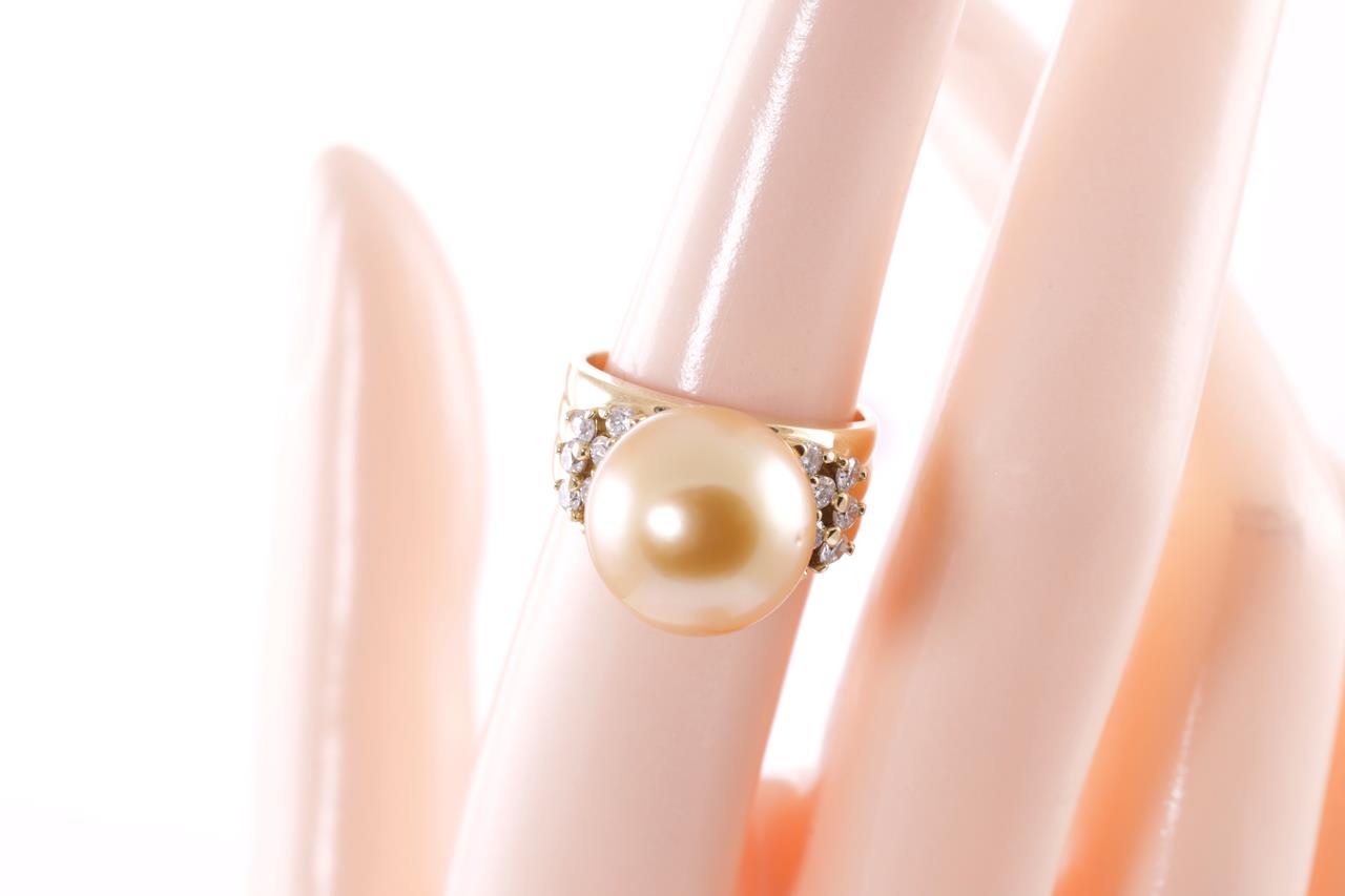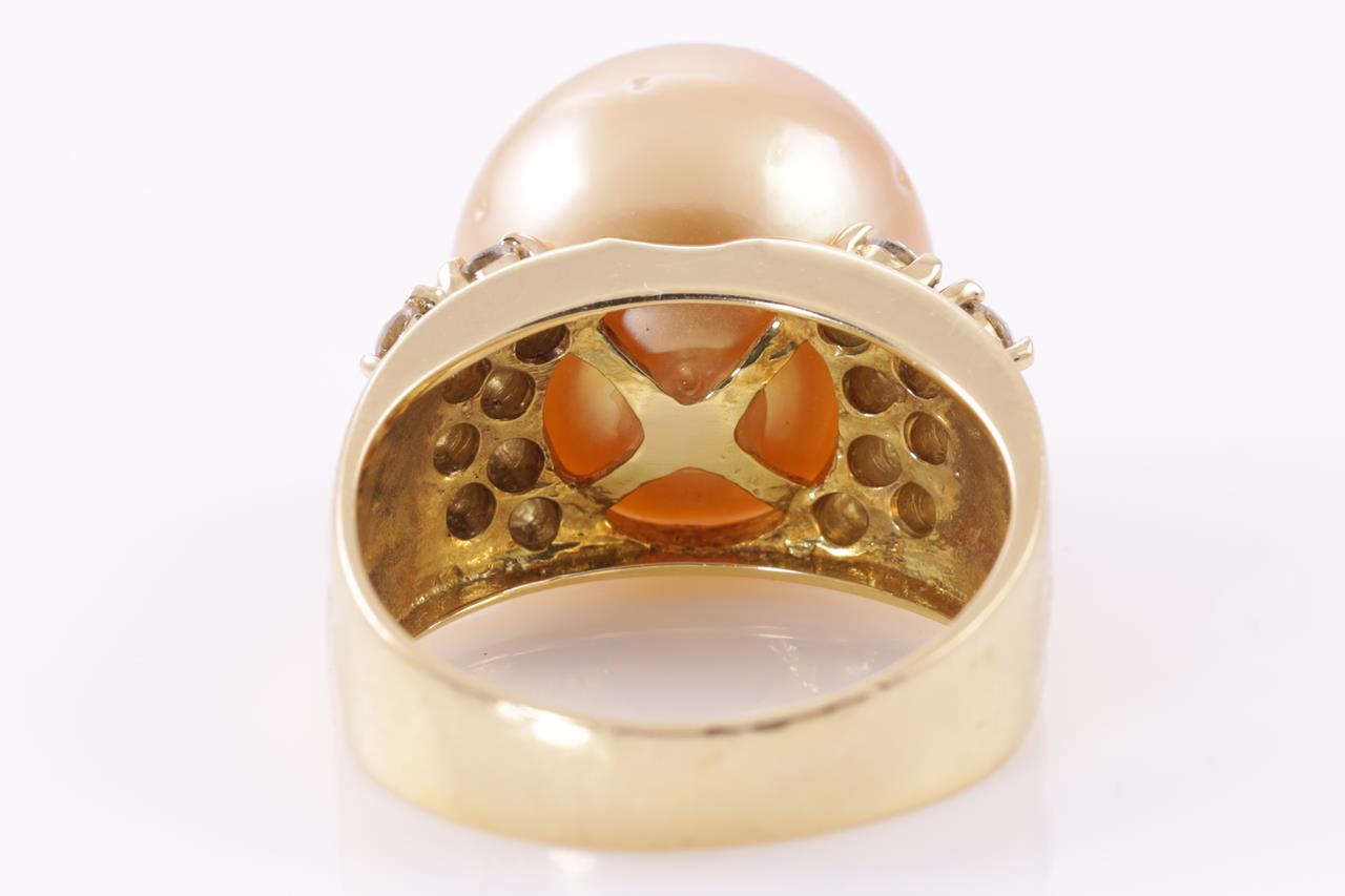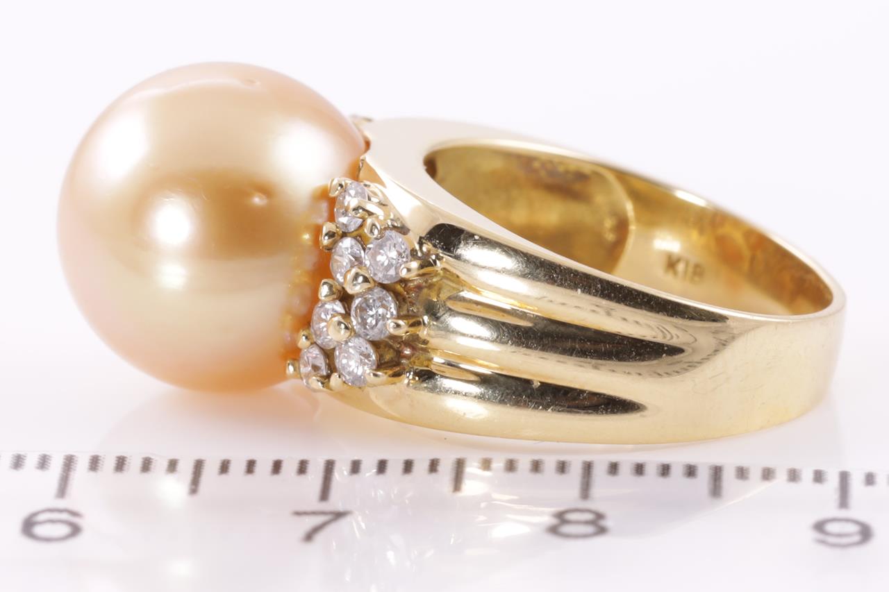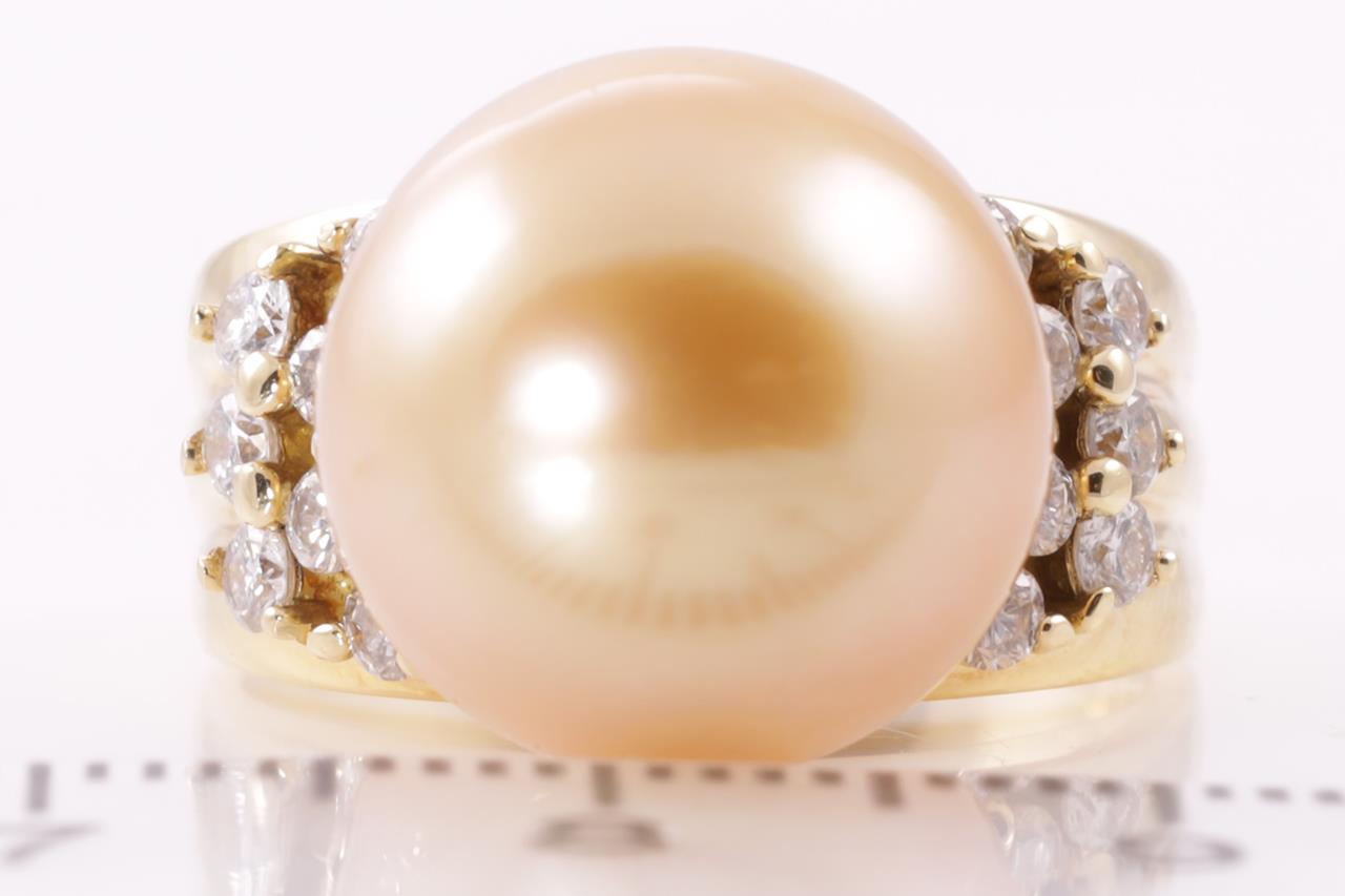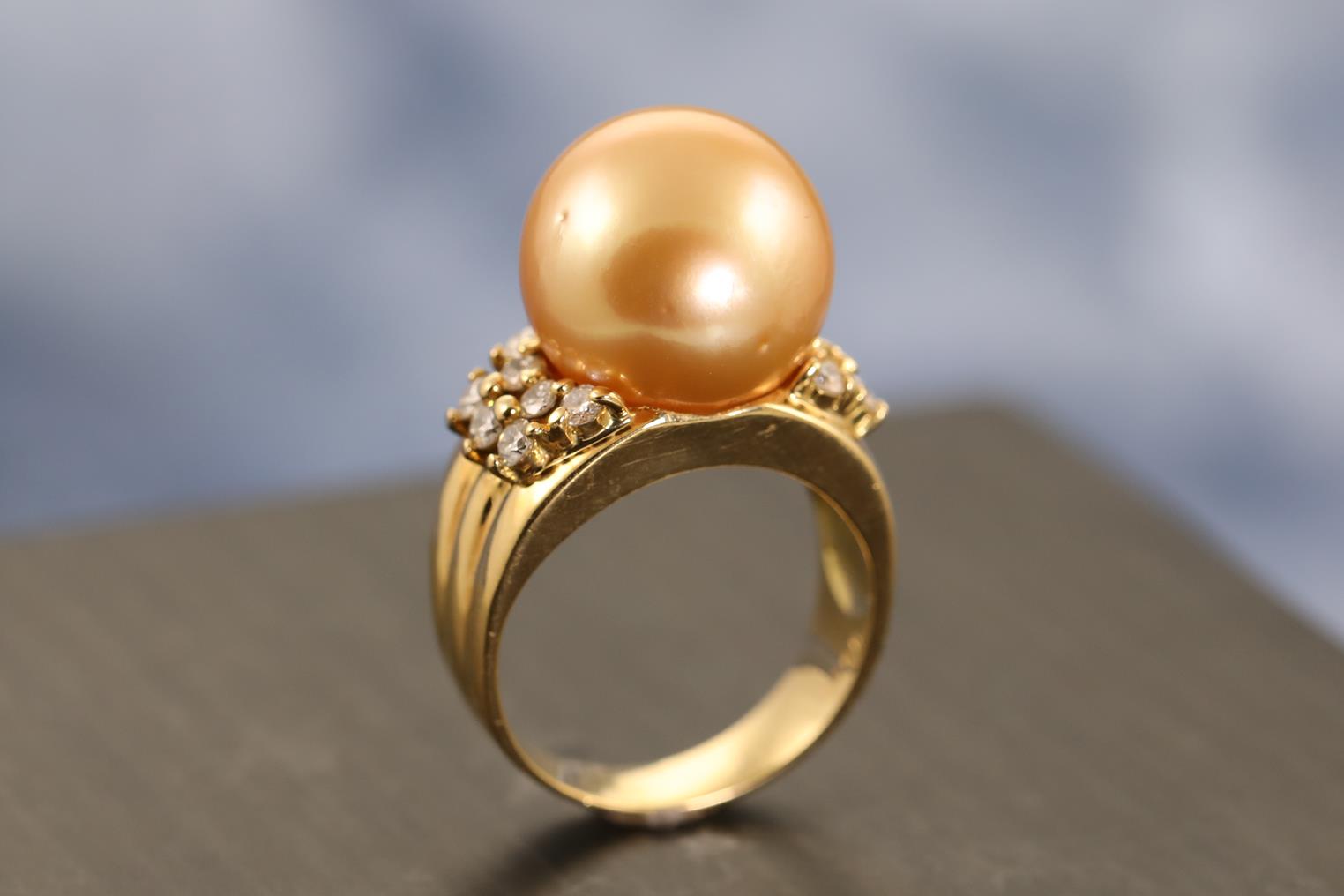 Pearl and Diamond Ring with golden South Sea Pearl of 13.0mm and Diamonds totalling 0.60cts (Estimated grading: G-H SI). 18ct yellow gold. Ring size M - ring resizing is not recommended Weight: 9.7g (Pre-owned)