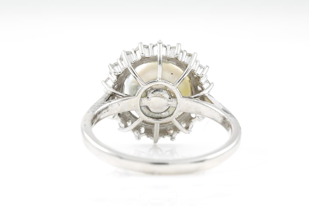 Pearl and Diamond Ring with an off-round blue-grey Cultured Pearl of 8.7mm and round Diamonds totalling approximately 0.59cts (Estimated Grading H SI). 18ct white gold. Ring size M1/2. Weight 4.4g. (Pre-owned)