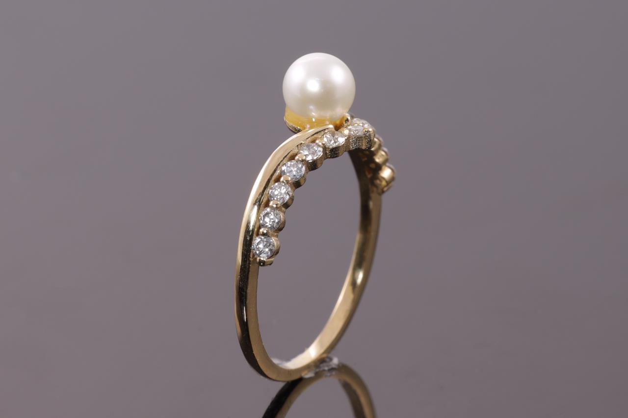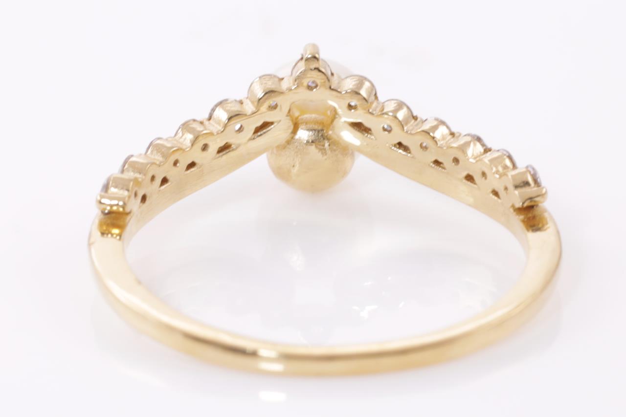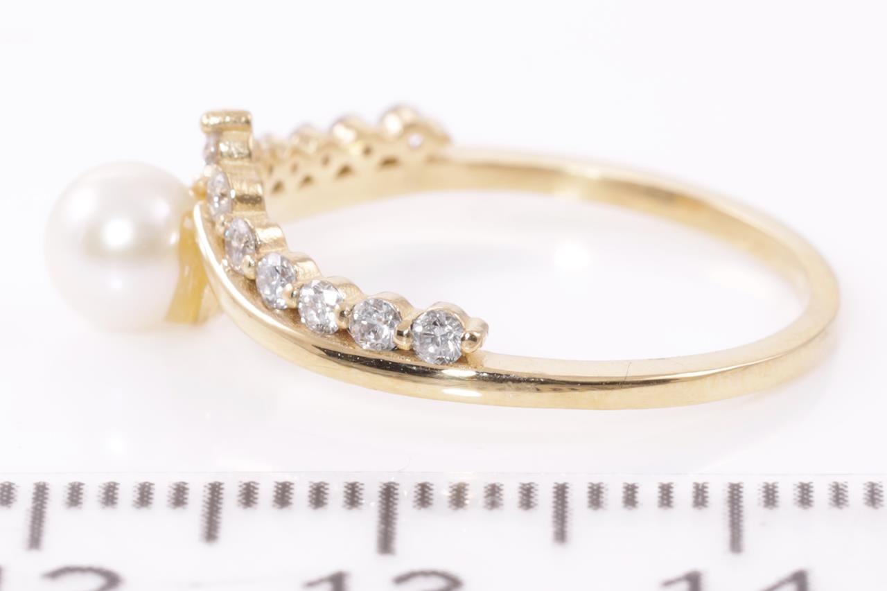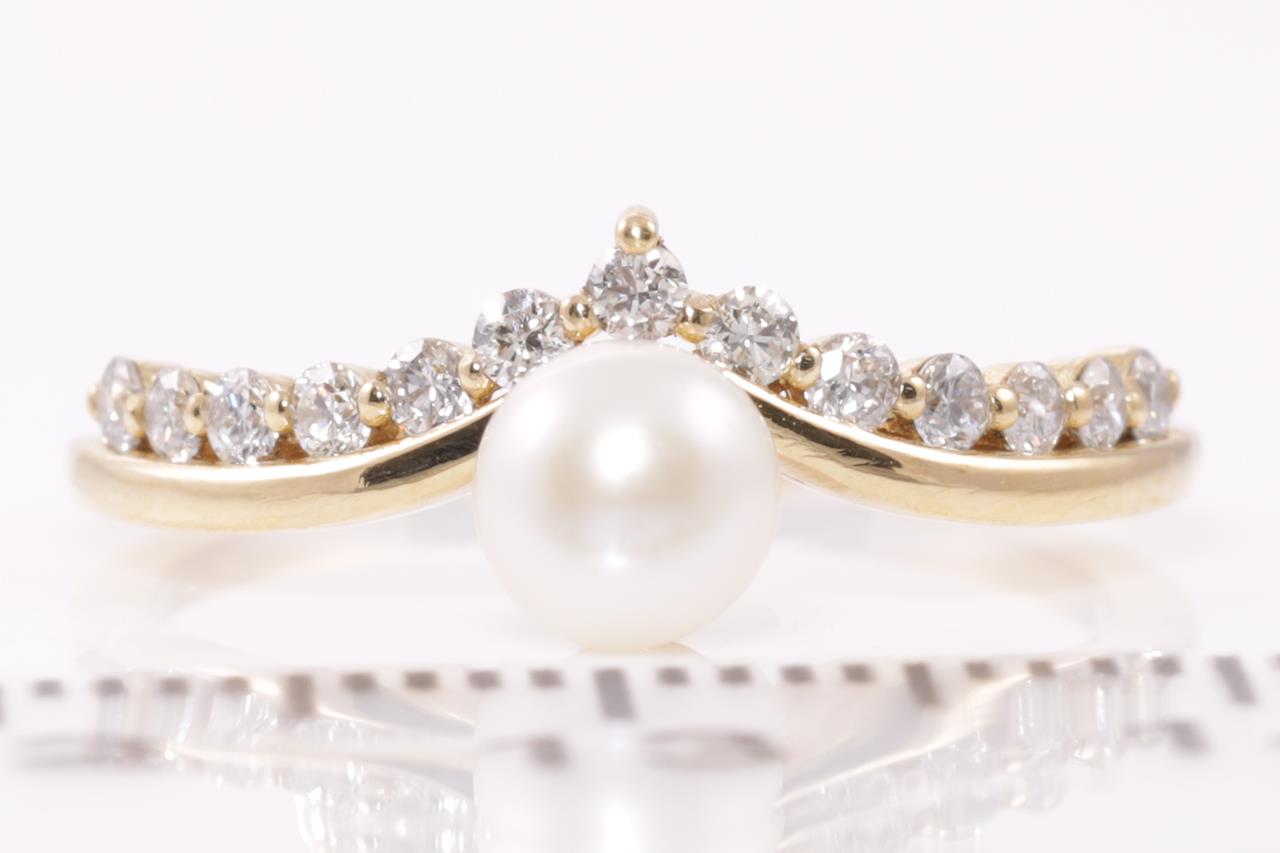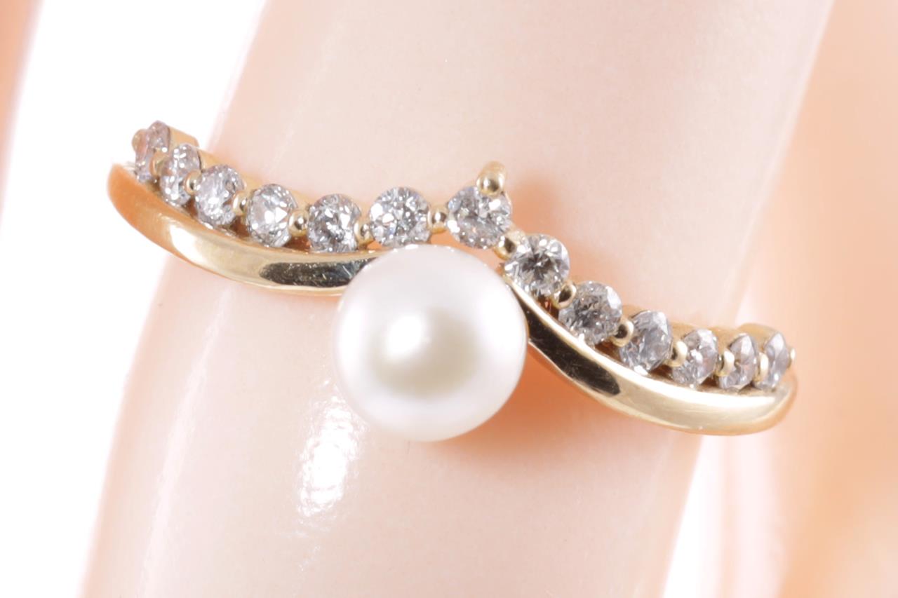 Pearl and Diamond Chevron shaped Ring with round Cultured Pearl of 5.0mm and round Diamonds totalling approximately 0.26cts. Ring size K. Weight 2.0g. (Pre-owned)