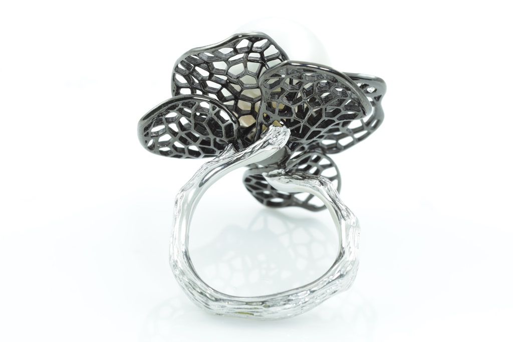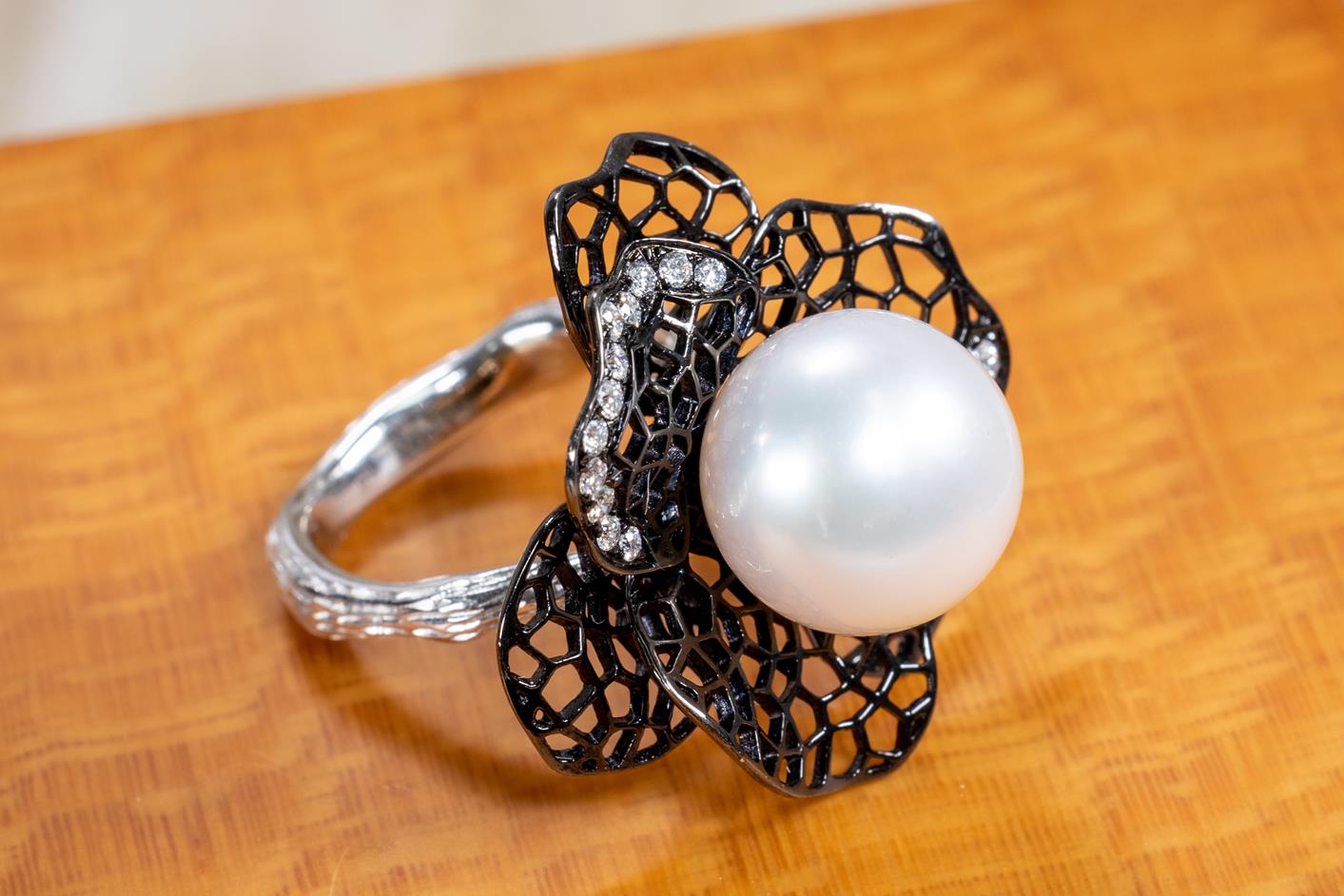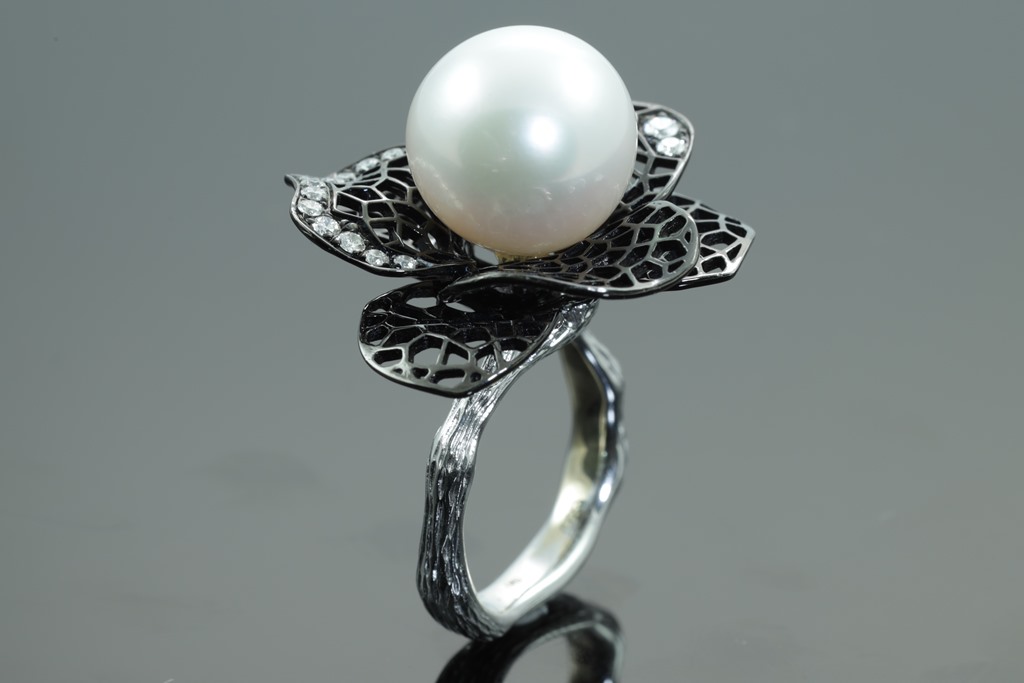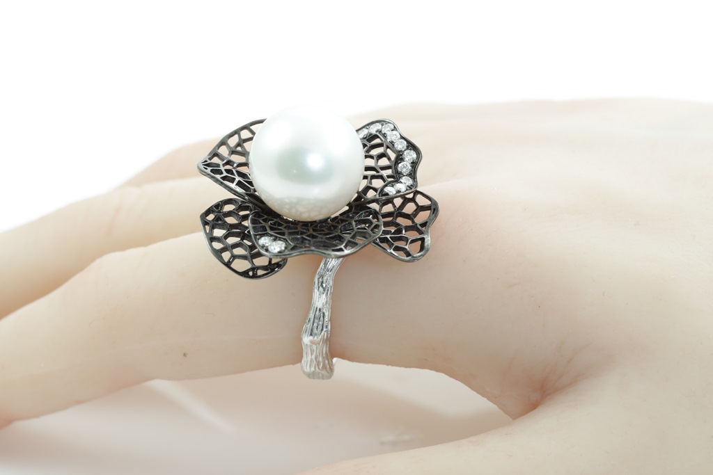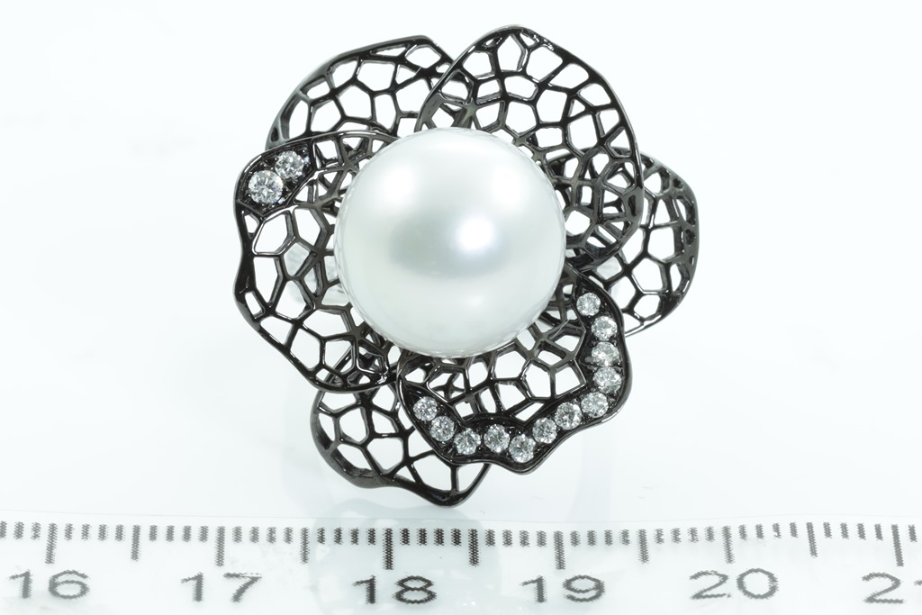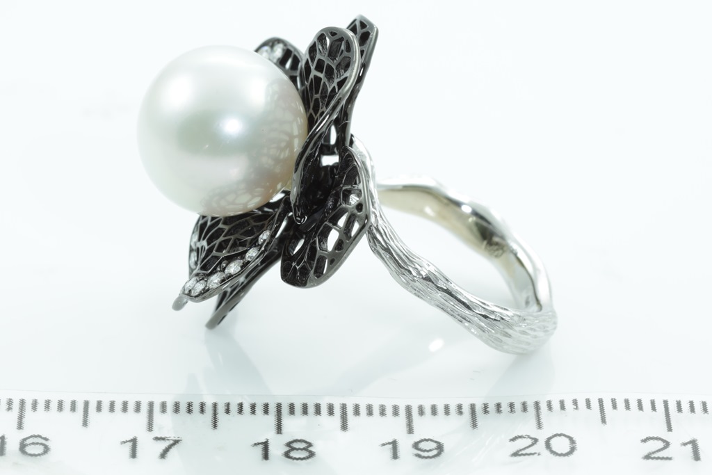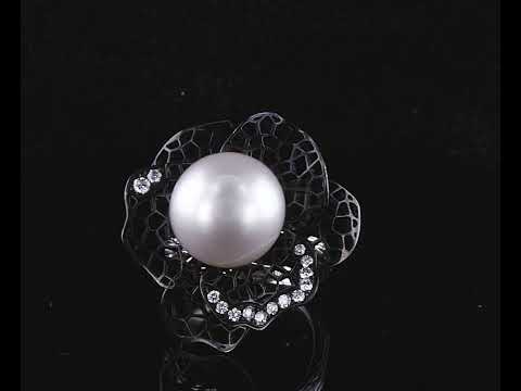 Flower shaped Dress ring with centre white South sea Pearl of 13-14mm and round Diamonds totalling approximately 0.14cts (Estimated grading: G VS). 18ct white gold with black rhodium. Ring size L. Weight 13.1g. (As New)