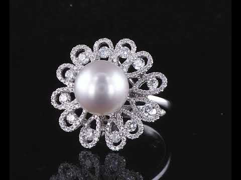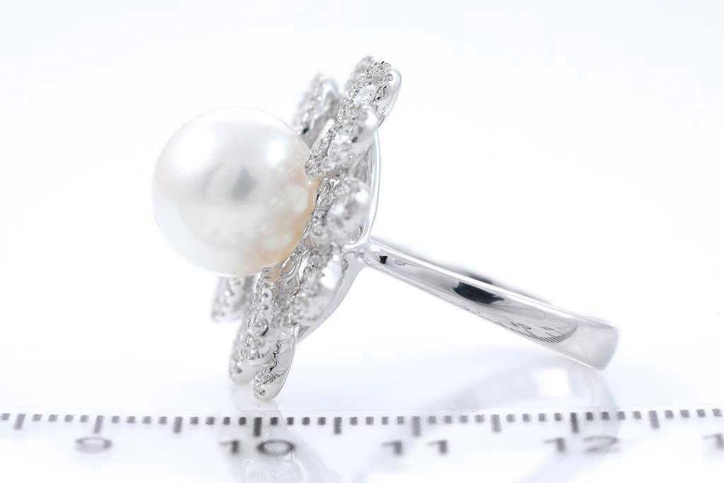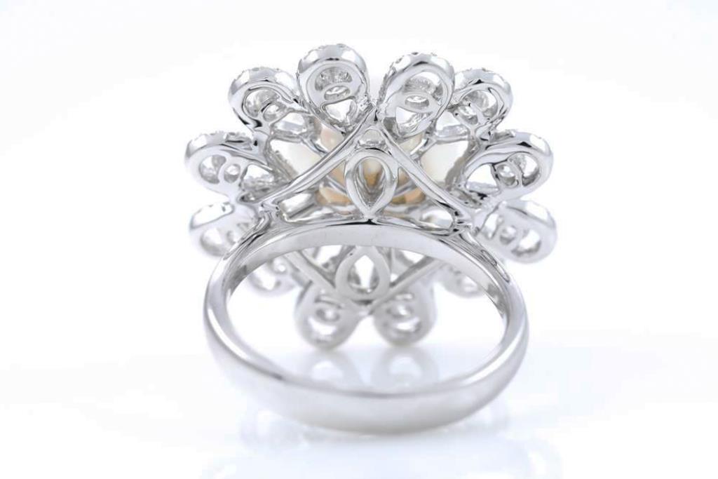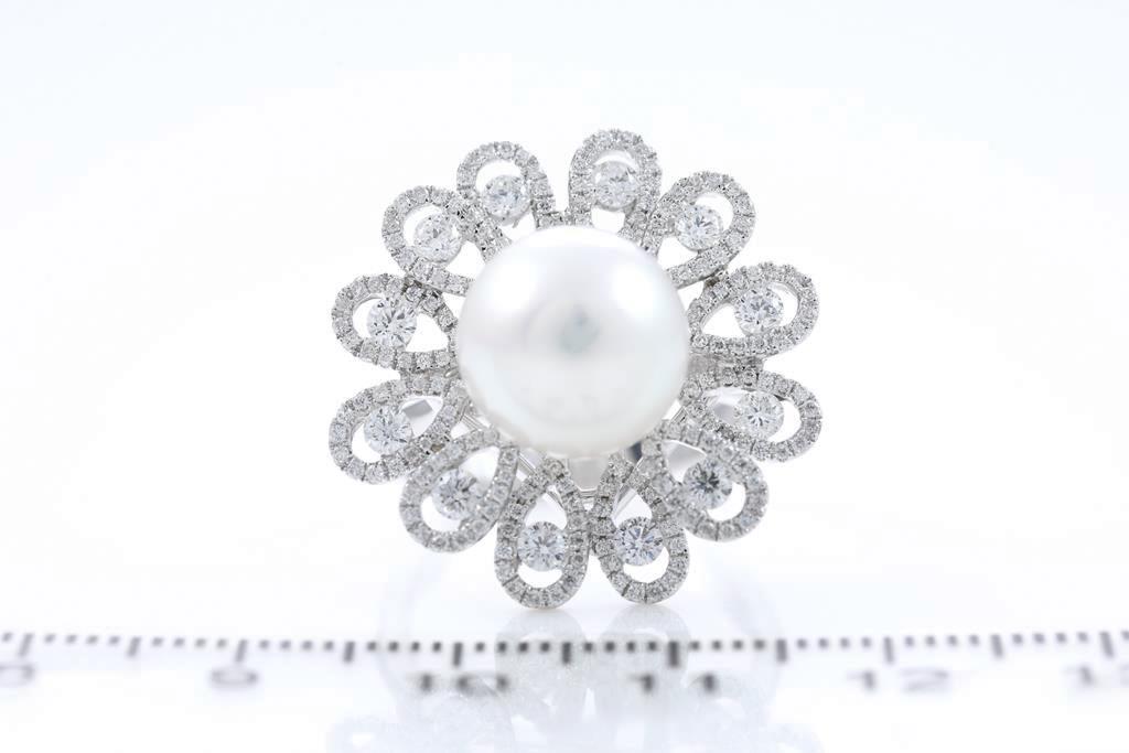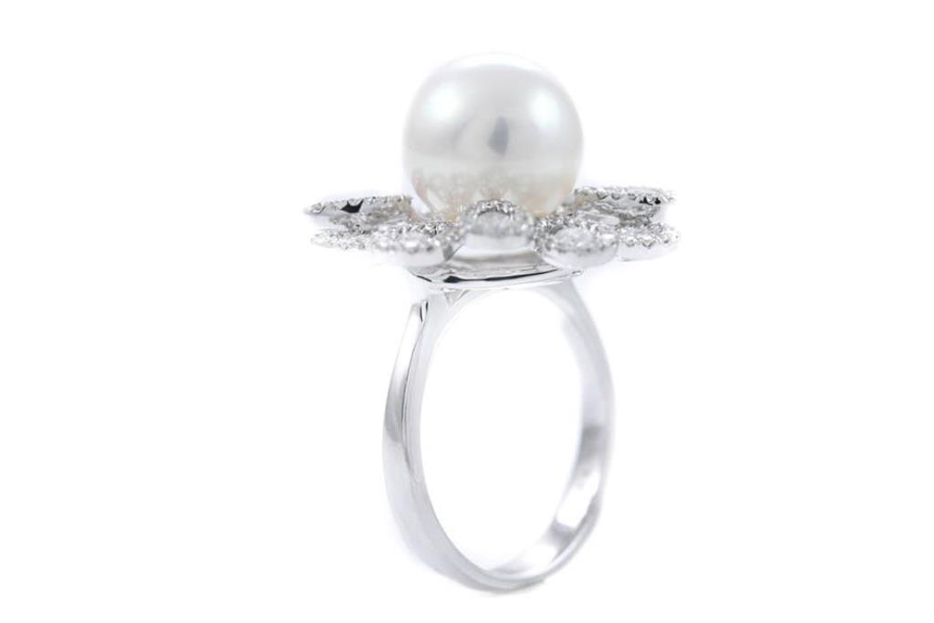 Pearl and Diamond ring with South Sea Pearl of 11.0mm and round Diamonds totalling approximately 1.12cts (Estimated grading: G-H SI-P1). 18ct white gold. Ring size M. Weight 9.7g. (As New)