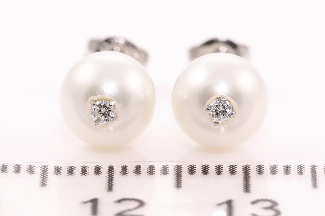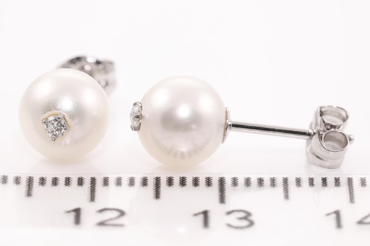 Pearl stud earrings with cultured pearls of 7mm and 2 round Diamonds totalling approximately 0.06cts. Platinum. Weight: 1.7g. (Pre-owned)
