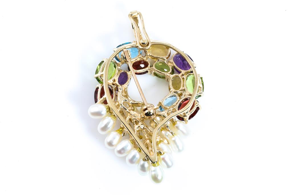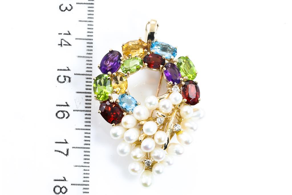 Pearl and Mixed Gemstone brooch/pendant and enhancer with Seed Pearls, round Diamonds totalling 0.12cts with oval shape Topaz, Garnet, Citrine, Amethyst and Peridot. 14ct yellow gold. Weight: 10.8g. (Pre-owned)