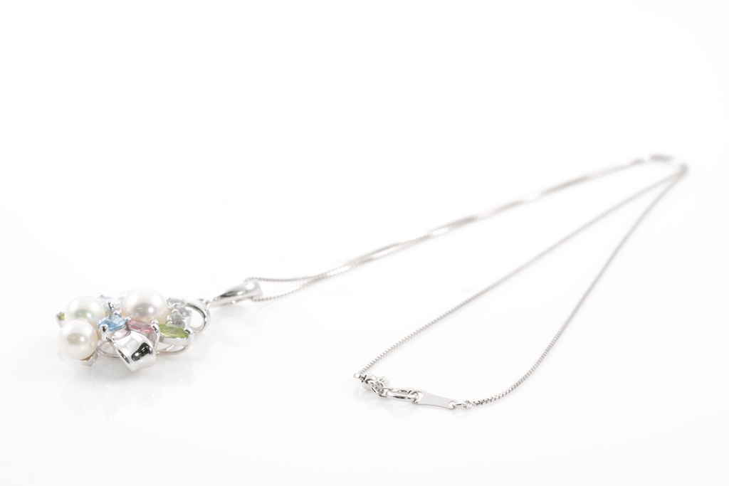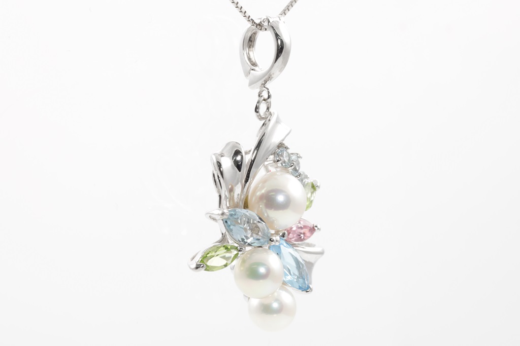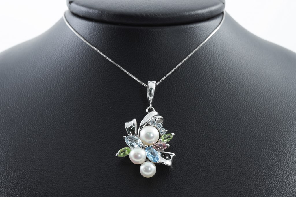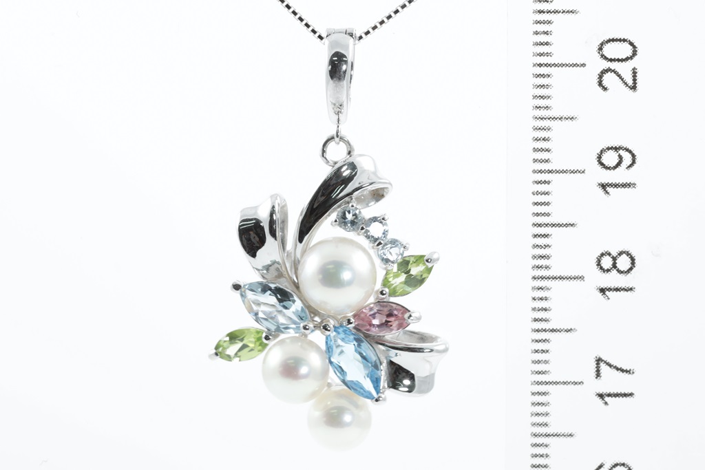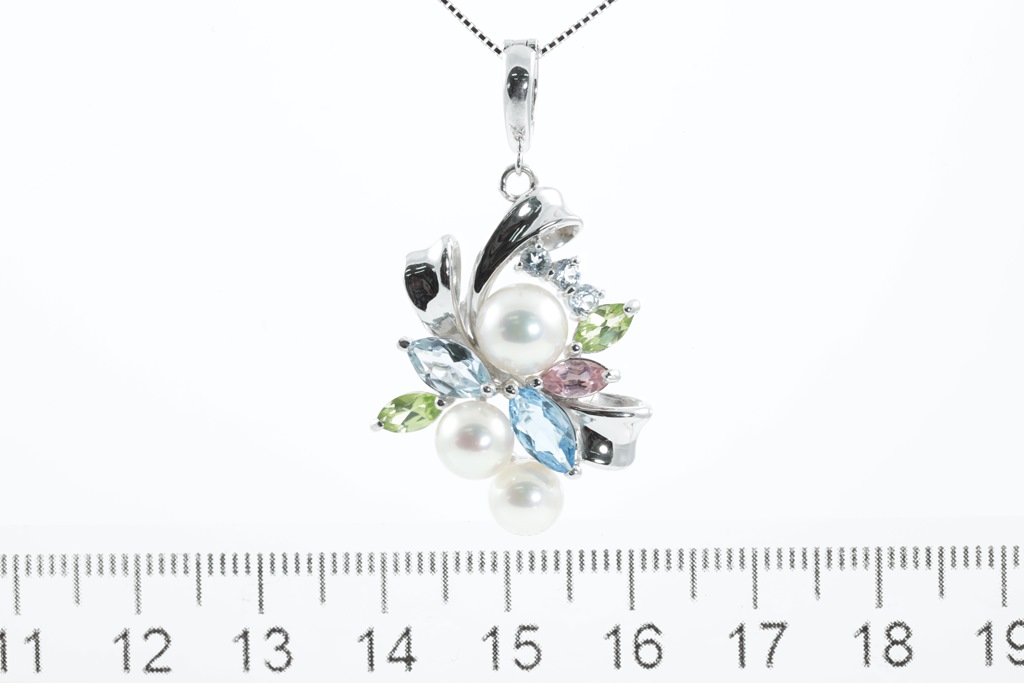 Pearl and mixed gemstone enhancer pendant with 3 Akoya Pearls of 6mm - 7.2mm and mixed shape Peridot, Topaz, Aquamarine & pink Tourmaline. 14ct white gold with 44cm 18ct gold adjustable chain. Weight: 8.4g (Pre-owned)