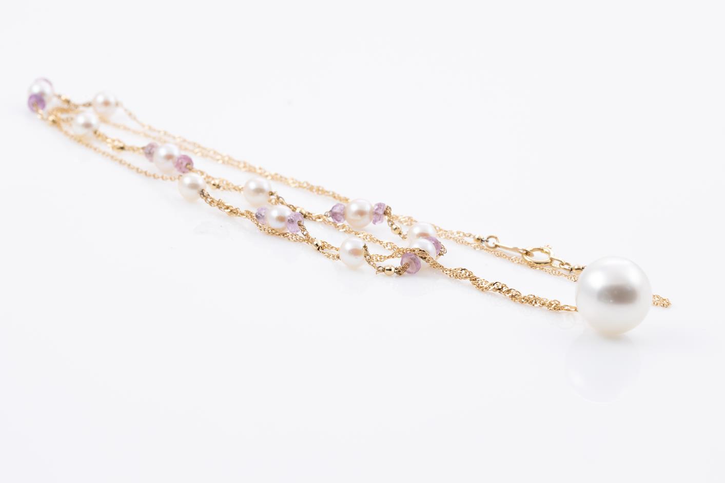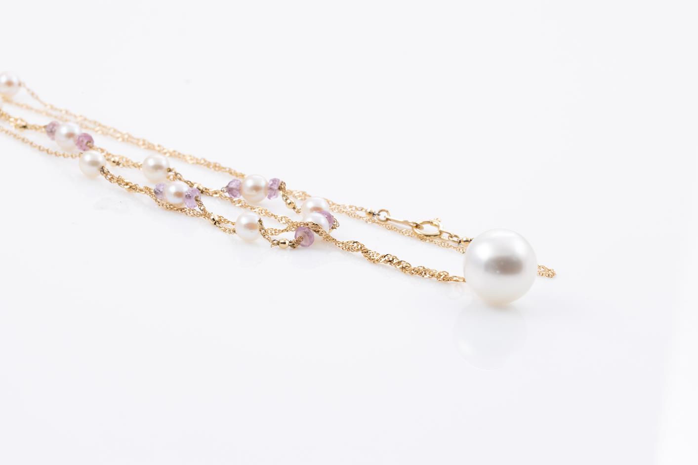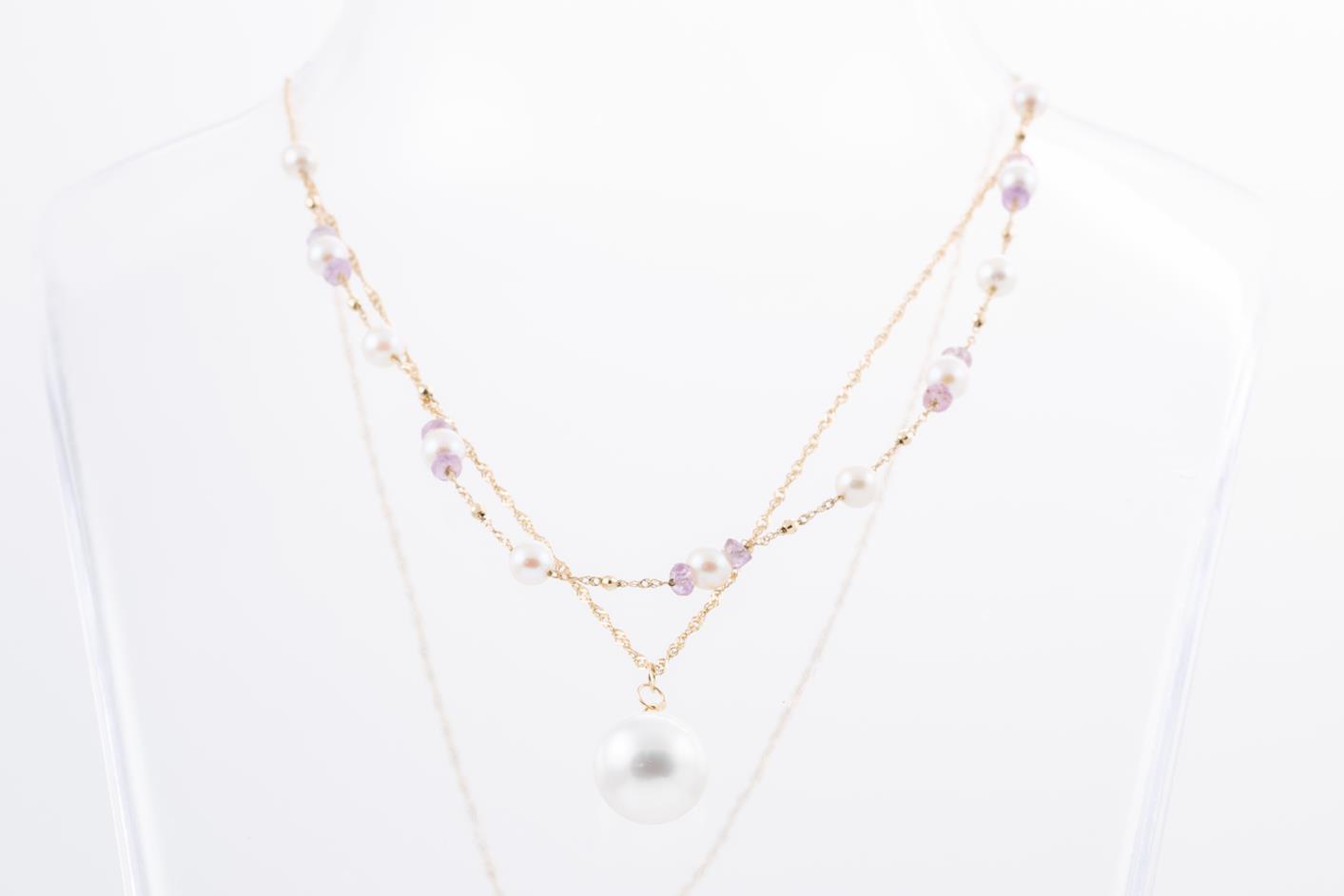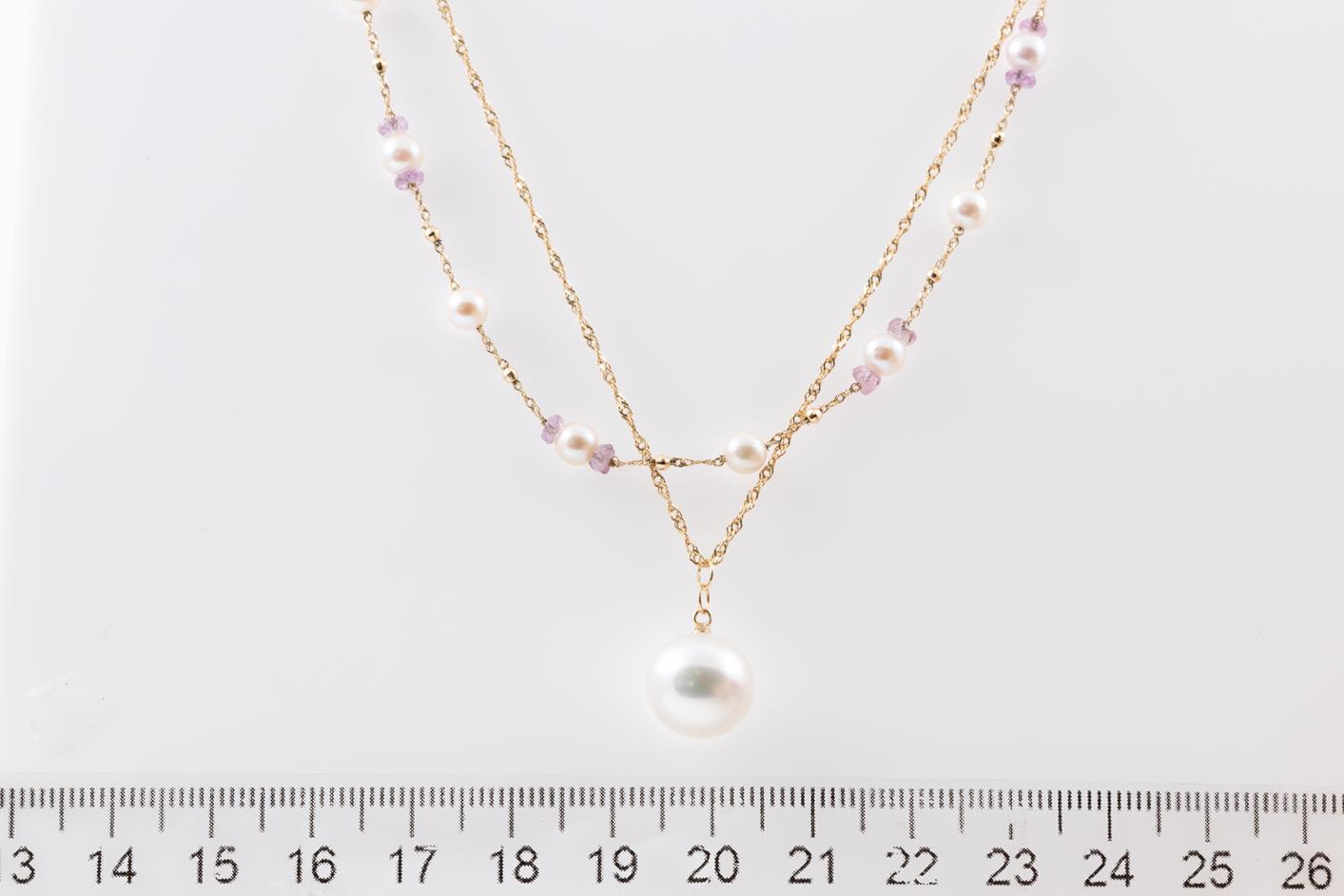 Pearl and Sapphire two tier necklace with cultured pearls of 4.4mm - 10.9mm and pink Sapphire beads. 18ct rose gold. Length: 42cm. Weight: 5g. (Pre-owned)