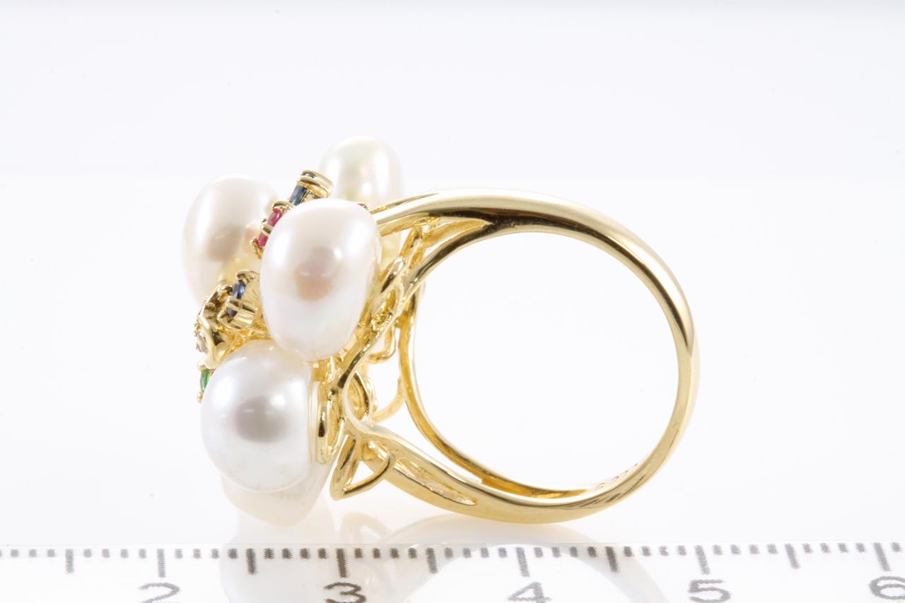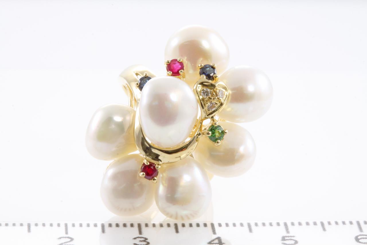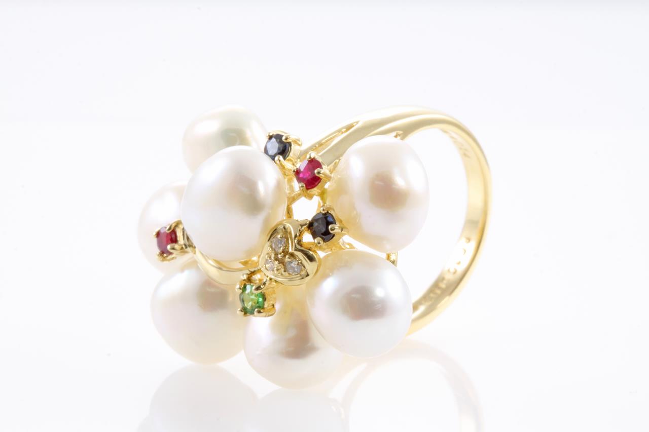 Pearl, Diamond, Sapphire, Ruby and Tsavorite Ring with 7 cultured pearls, diamonds of 0.03cts, Rubies of 0.16cts, Sapphires of 0.14cts and Tsavorite Garnet of approximately 0.06cts. 18ct yellow gold. Weight: 10.1g. Ring size K1/2. (Pre-owned)