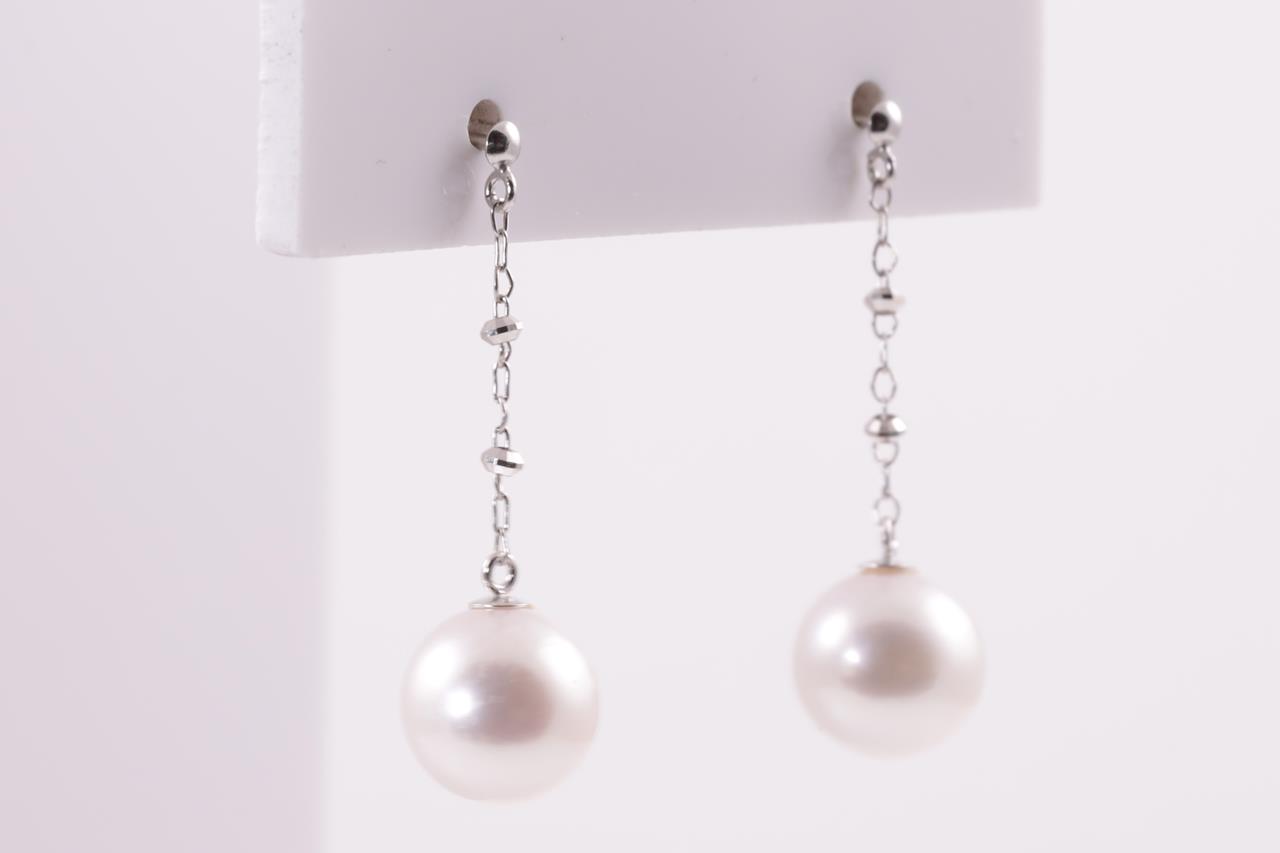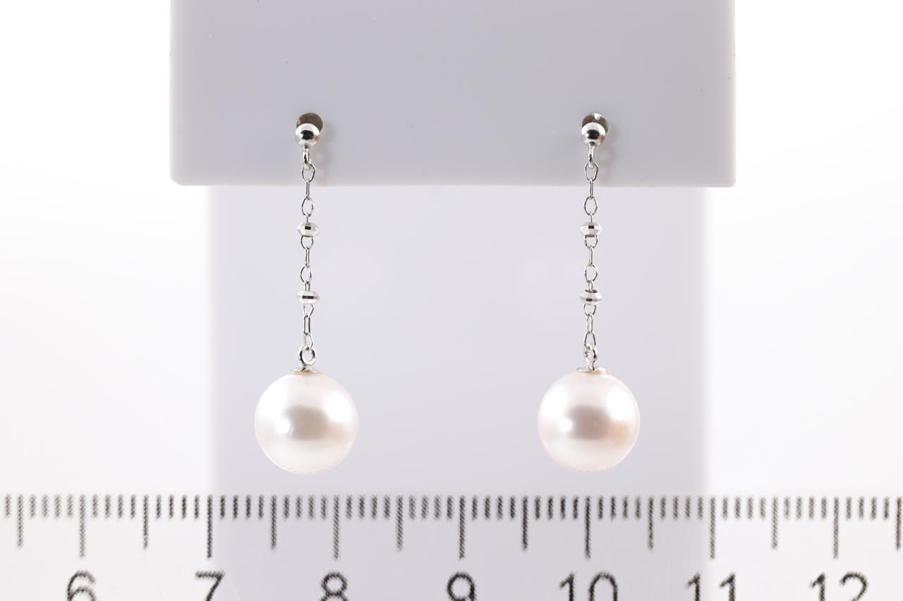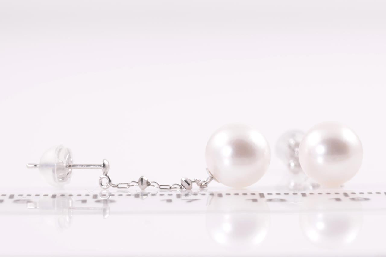Pearl drop earrings with Akoya pearls of 8mm. 18ct white gold with gold & silicon backs. Weight: 2g. (As new)