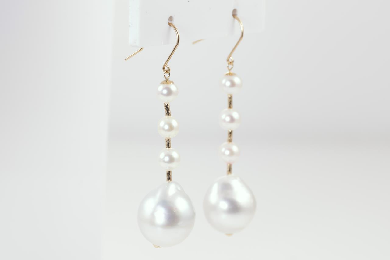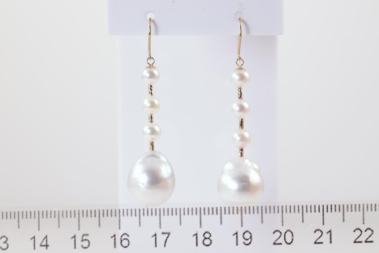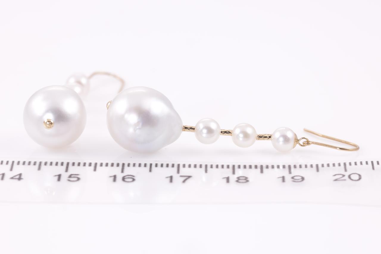 Pearl shepherds hook drop earrings with Baroque South Sea and Akoya pearls of 4.8mm-12.0mm. 18ct yellow gold. Weight: 6.6g. (As new)